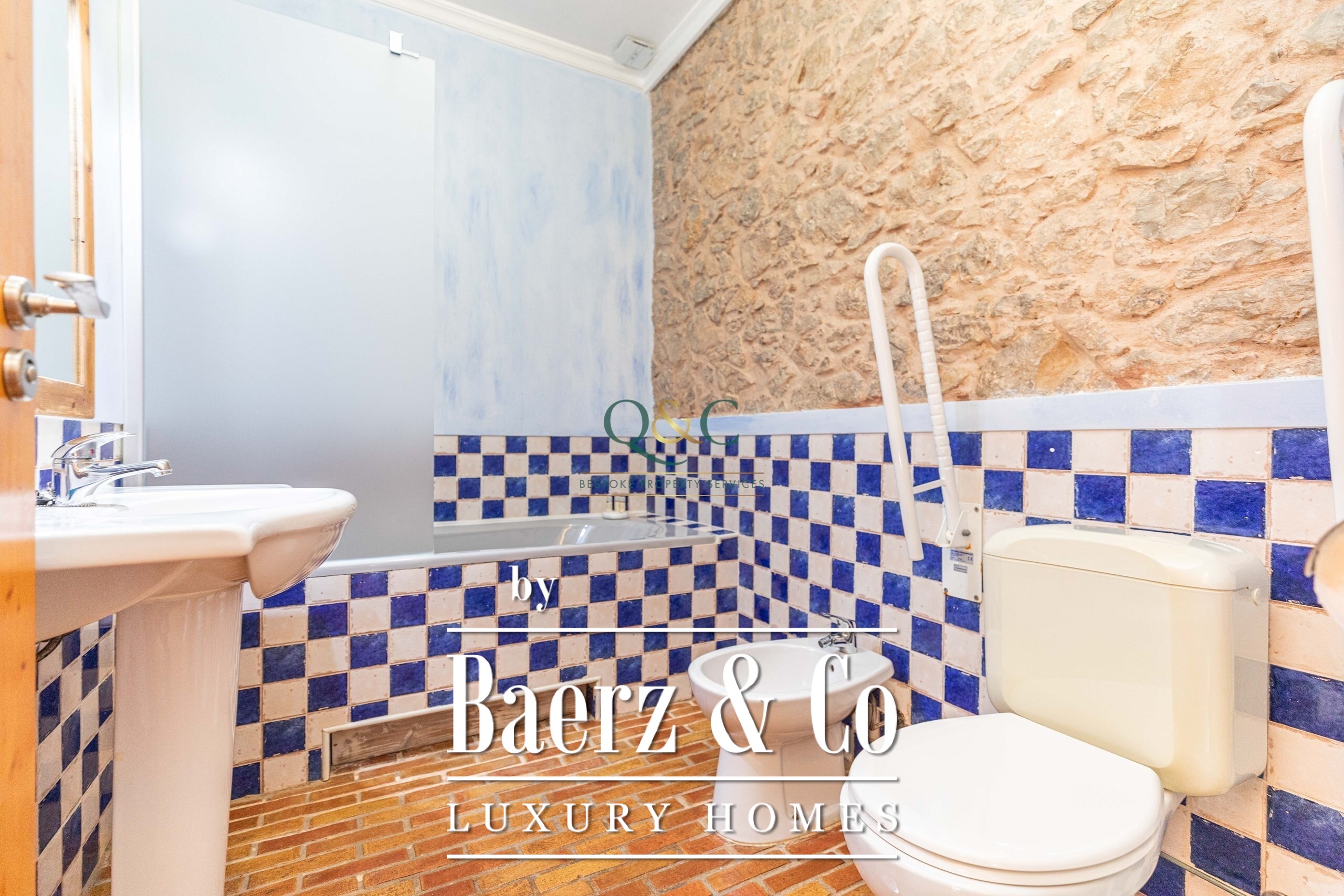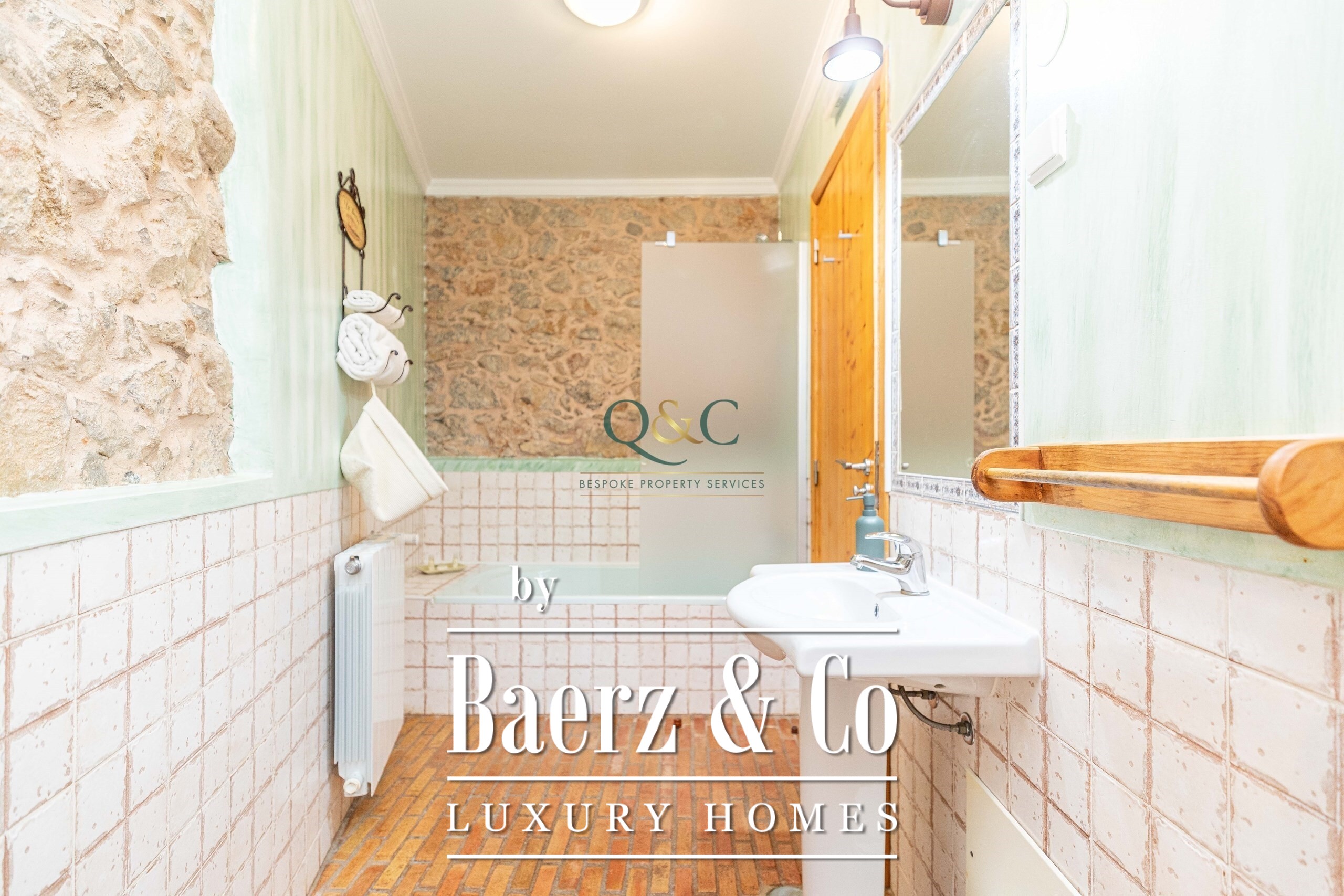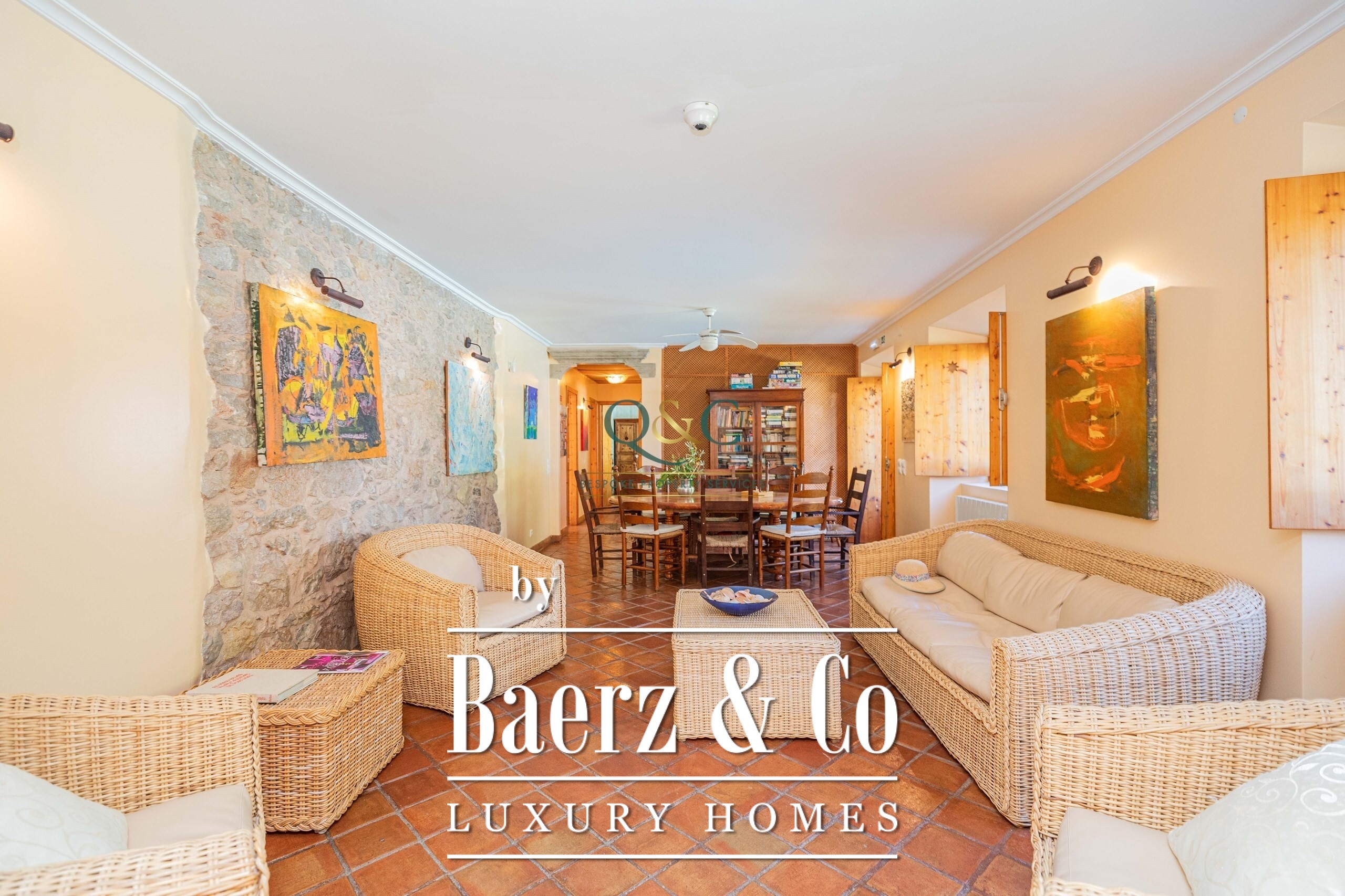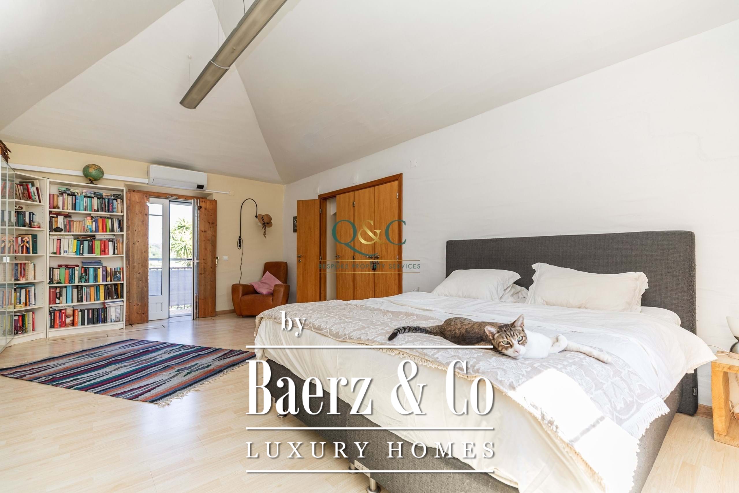 Set on a private 3,603 m² plot, the estate includes 827 m² of living space across two wings. The property features nine bedrooms and nine bathrooms, divided for privacy and flexibility, with each room reflecting the estate’s unique character. High ceilings, natural stone details, and ironwork speak to the architecture’s honest craft, while air conditioning, mains water, and wifi network provide modern amenities. A guest cottage complements the principal residence, offering further accommodation with a private terrace overlooking mature fruit trees.