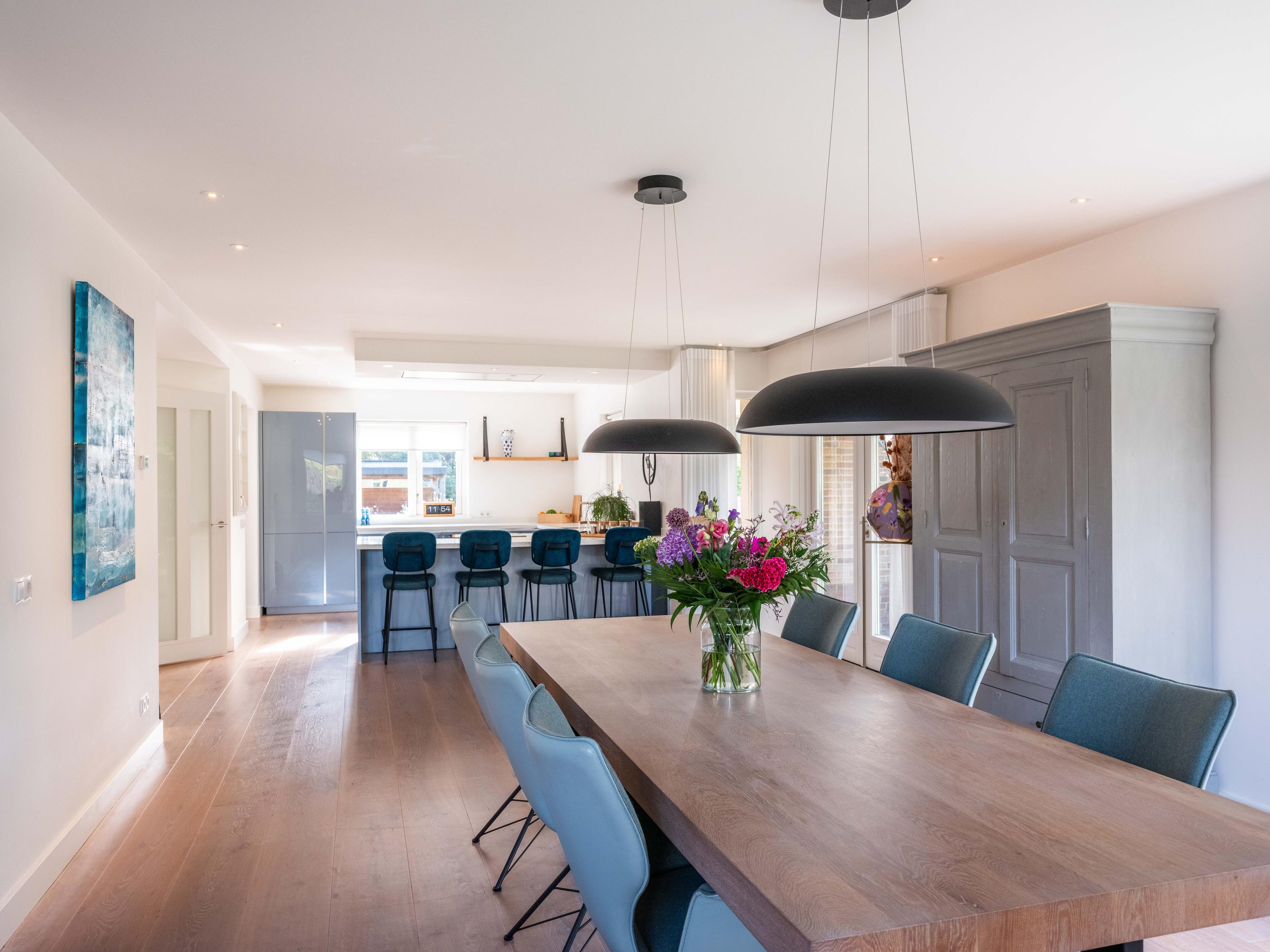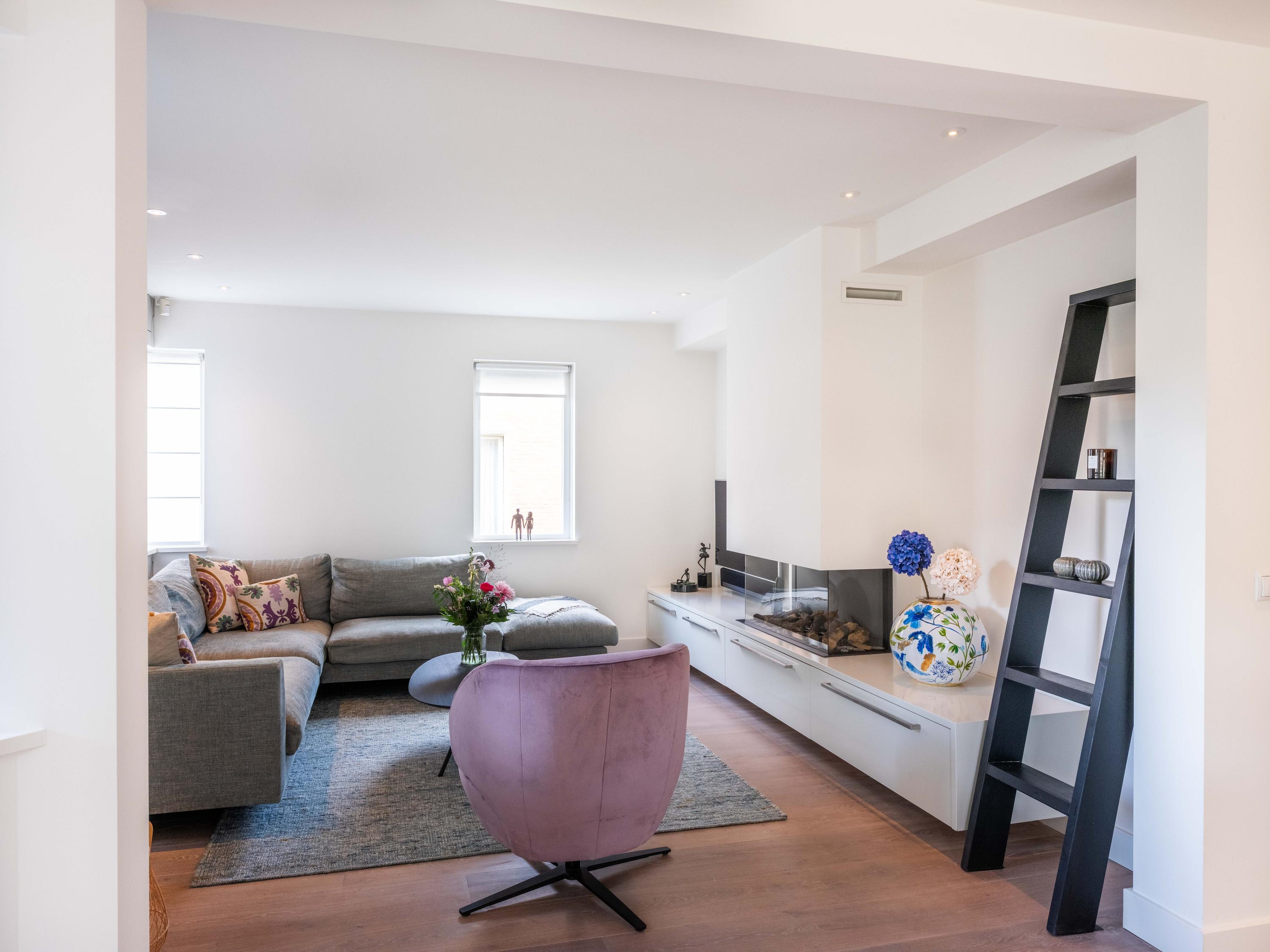 Double doors give access to the spacious L-shaped living room, where you are immediately welcomed by lots of light thanks to the large windows. In the corner is a cosy sitting area with an attractive gas fireplace. The oak laminate flooring in combination with underfloor heating throughout the ground floor creates a warm and comfortable atmosphere.