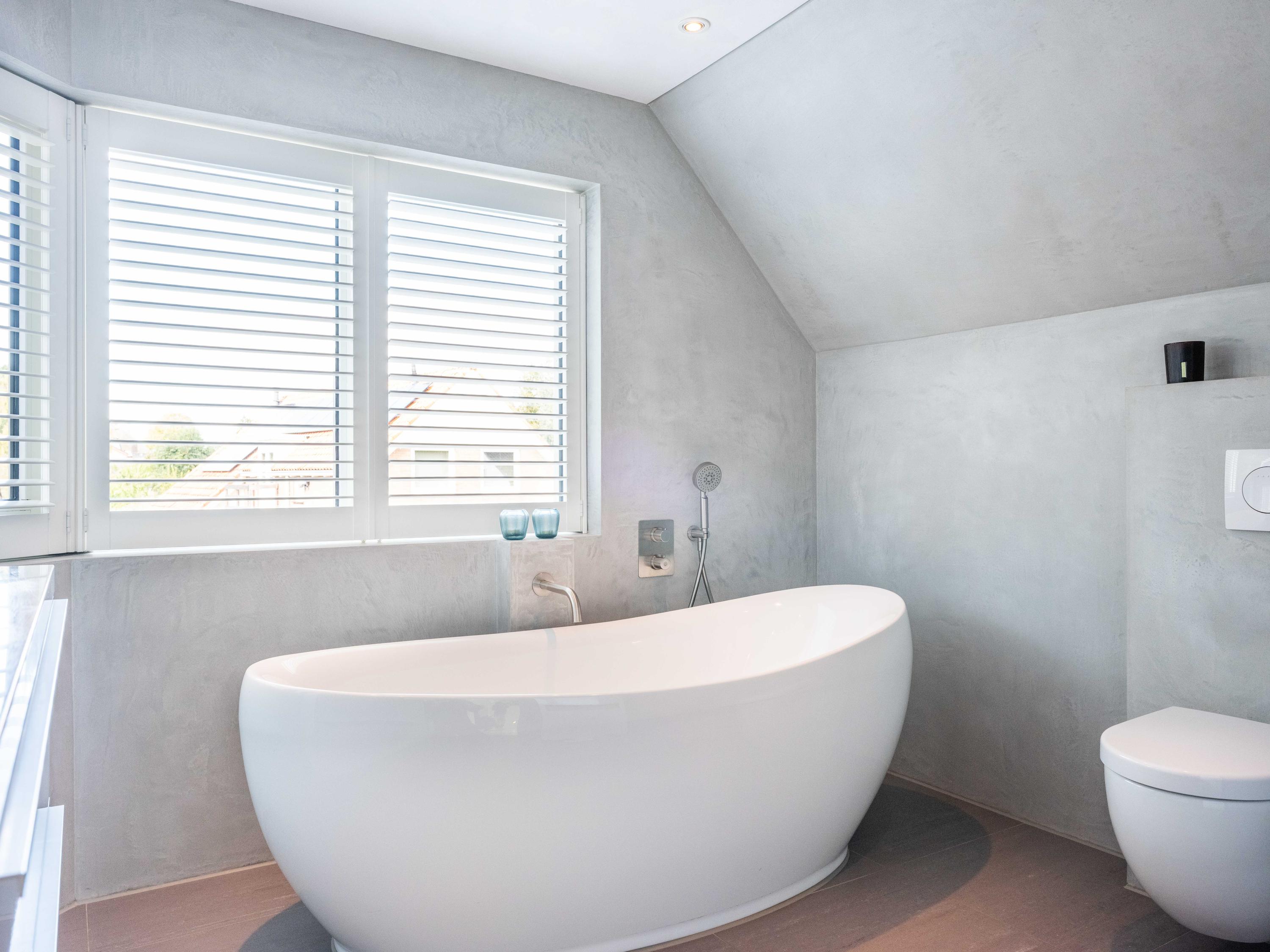 On the first floor, there are three bedrooms and a spacious bathroom with double sink, toilet, bathtub and a generous double walk-in shower. Underfloor heating is also present here, as well as a radiator. The master bedroom is spacious and has plenty of built-in cupboard space. There are two additional bright bedrooms, both with built-in cupboards and access to a private balcony. There is a handy storage cupboard under the stairs to the attic.