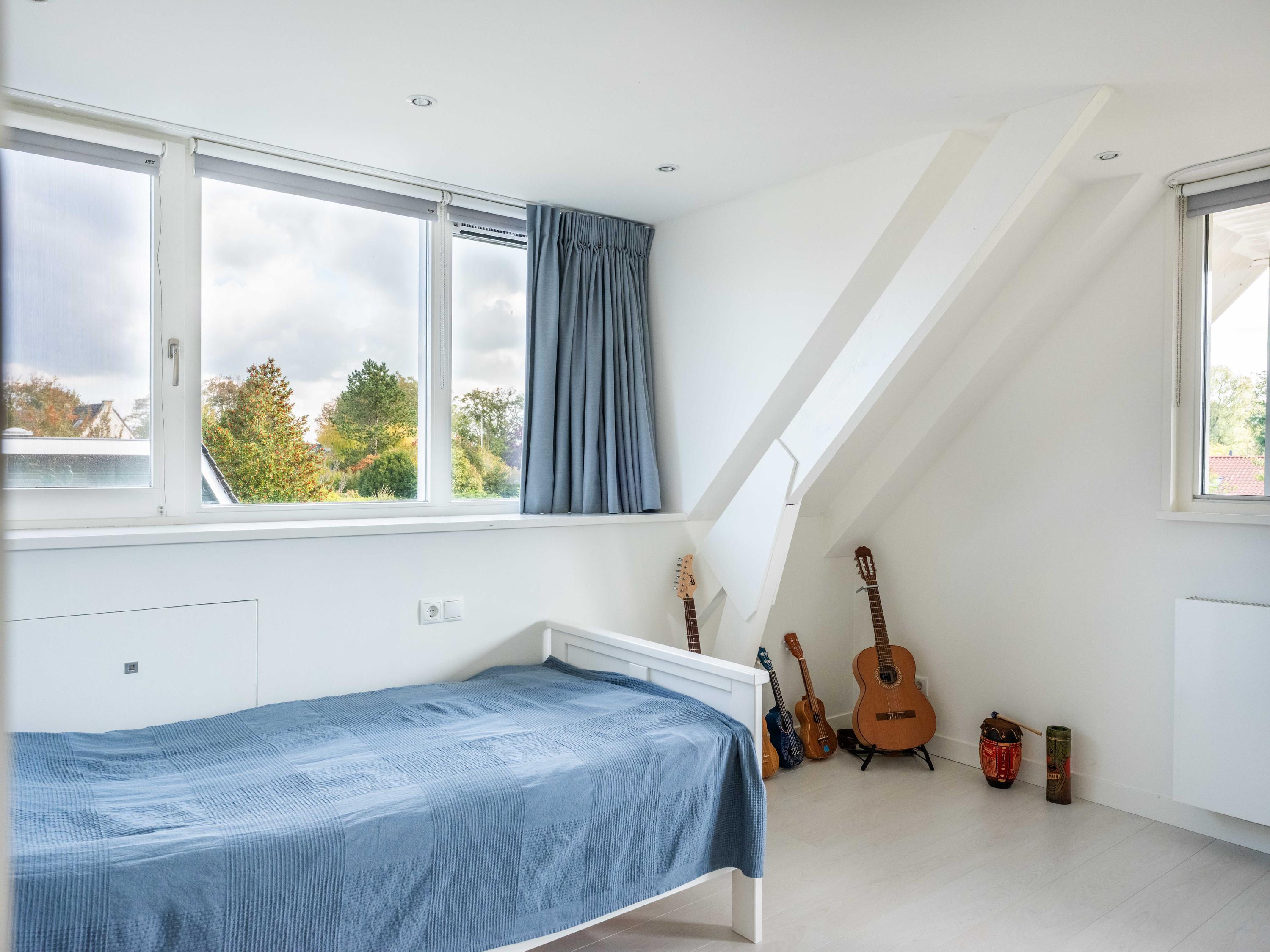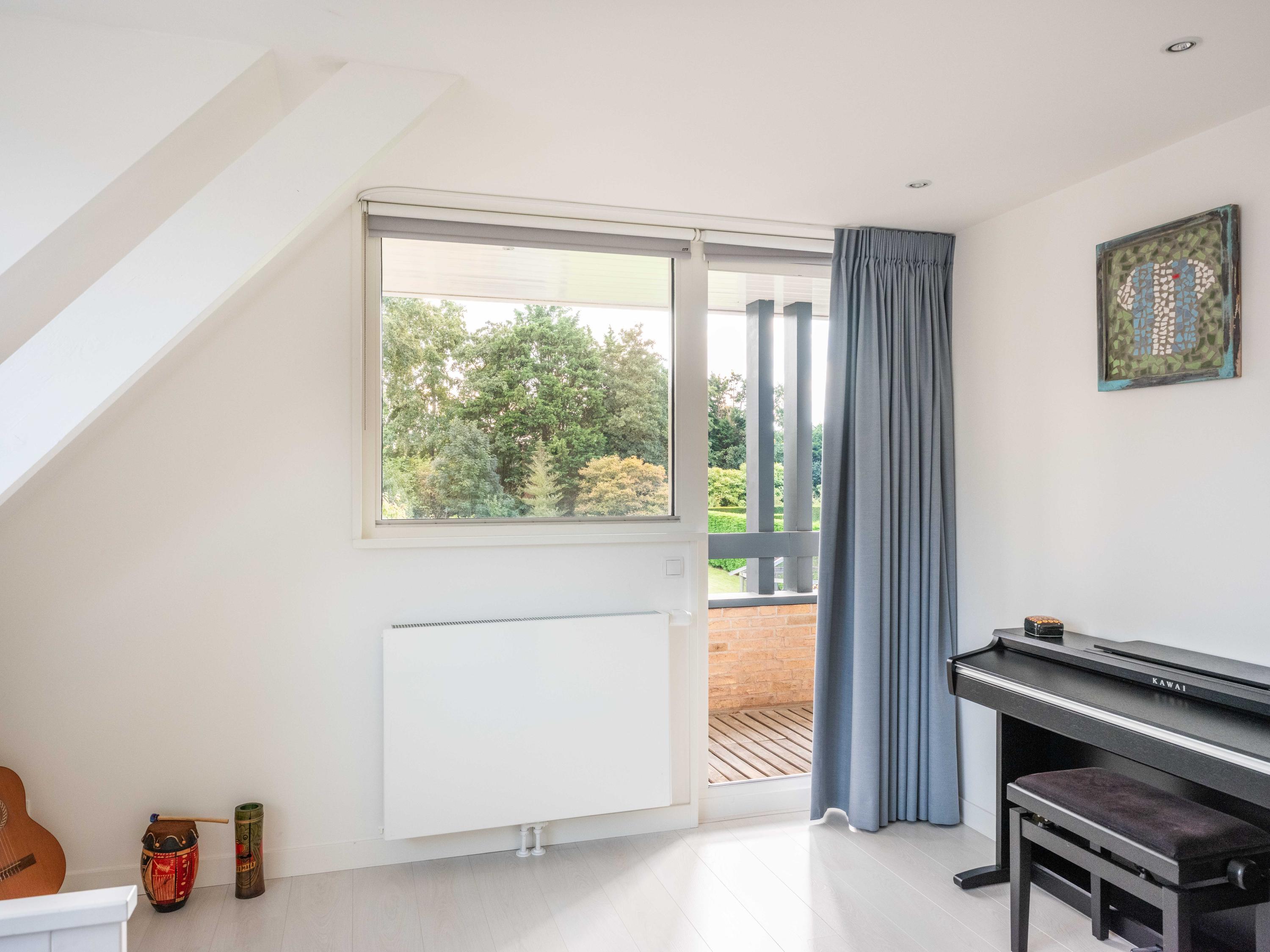 The open kitchen is attractively decorated and equipped with a cosy bar with seating. From the kitchen, you can enjoy a beautiful view of the garden and there is a direct connection to the living room. Thanks to the open layout and abundant light, everything feels spacious, fresh and inviting.
