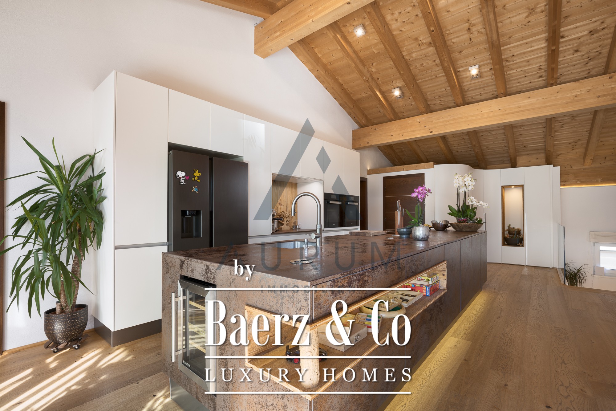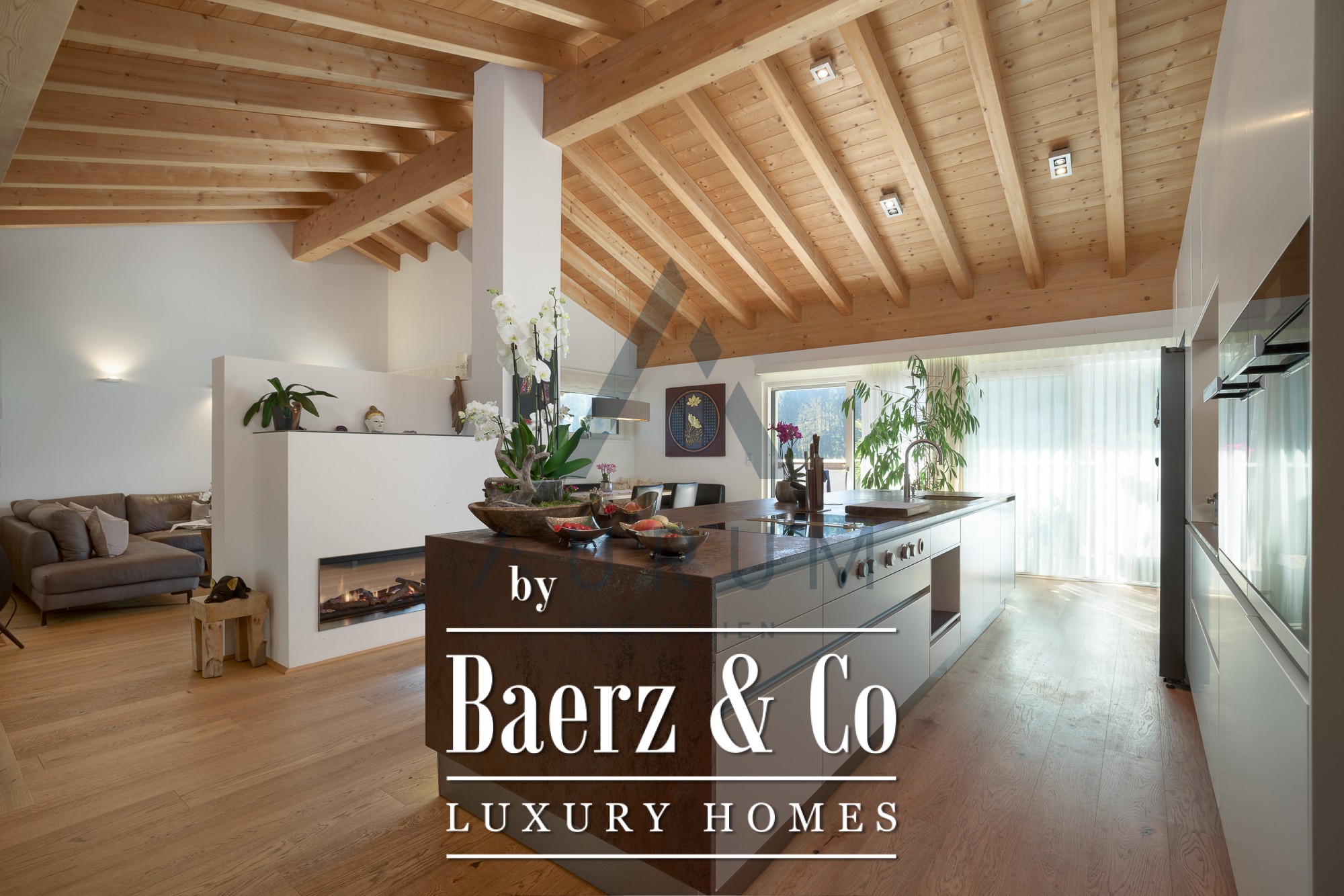 Apartment Schwoich with panoramic mountain views introduces a quiet grandeur shaped by light, volume, and alpine clarity. This 169 m² residence spans the second floor and attic, framing Tyrolean landscapes through expanses of glass and a wraparound terrace of 86 m². Upon entry, a sense of order prevails—oak floors lead to a master suite, spacious dressing room, en-suite bathroom, and direct balcony access. A second bedroom and bathroom complete the private lower floor.
