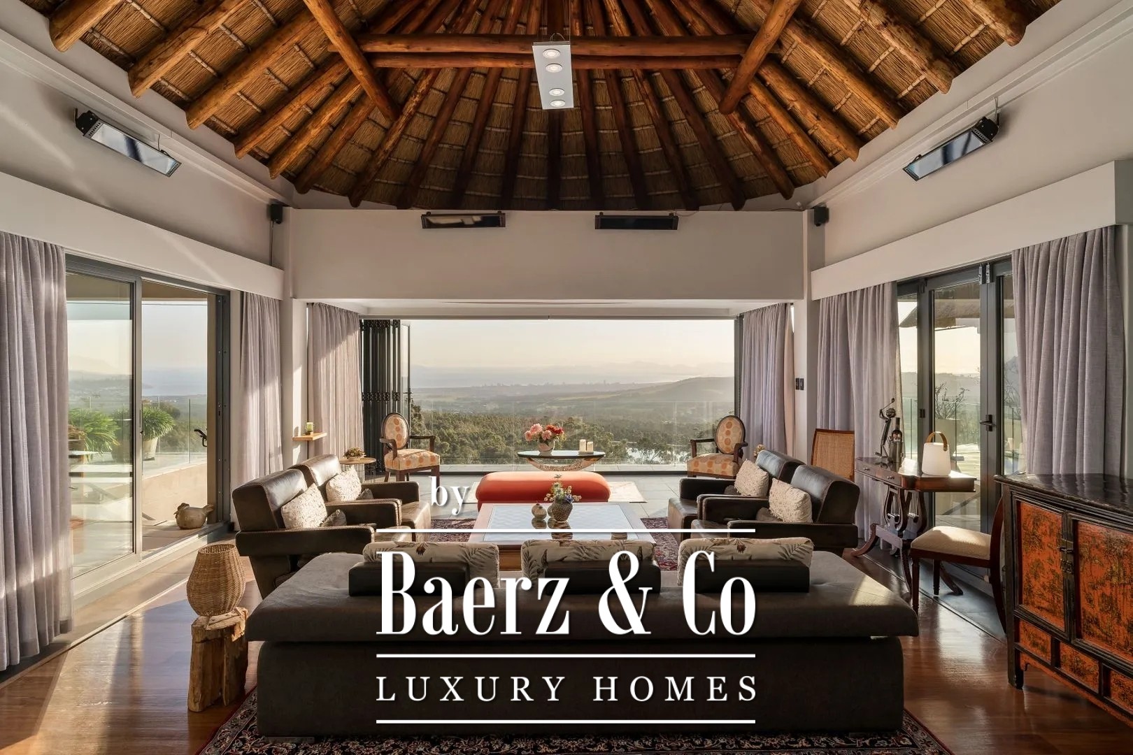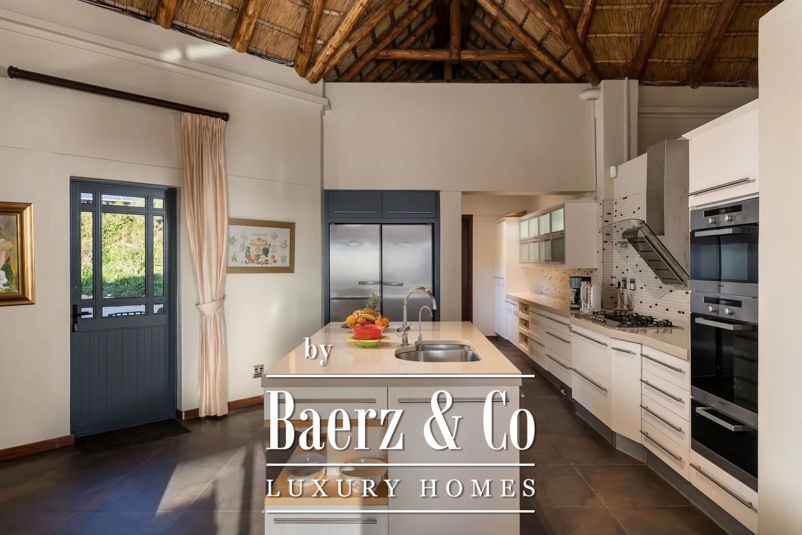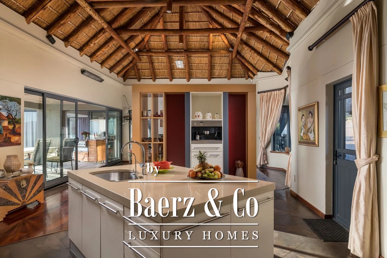 The Dutch owners built this fabulous thatched manor house in 2006, complete with gatehouse and a separately located guesthouse/manager’s residence on an extraordinarily beautiful site. The entire property is designed in the characteristic African rondavel style. It has become an extraordinary dream home offering all contemporary European luxury and comfort; nothing is lacking.