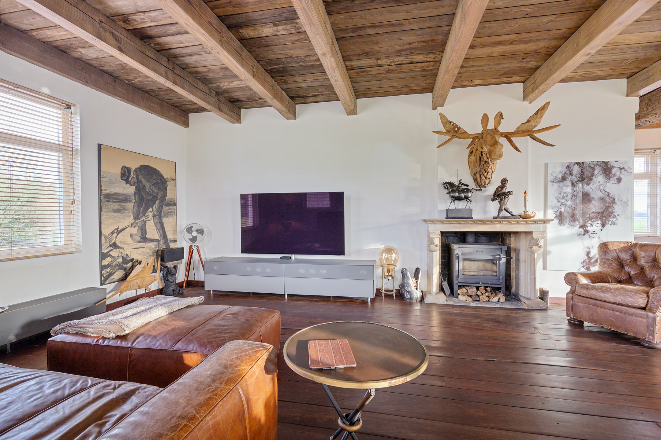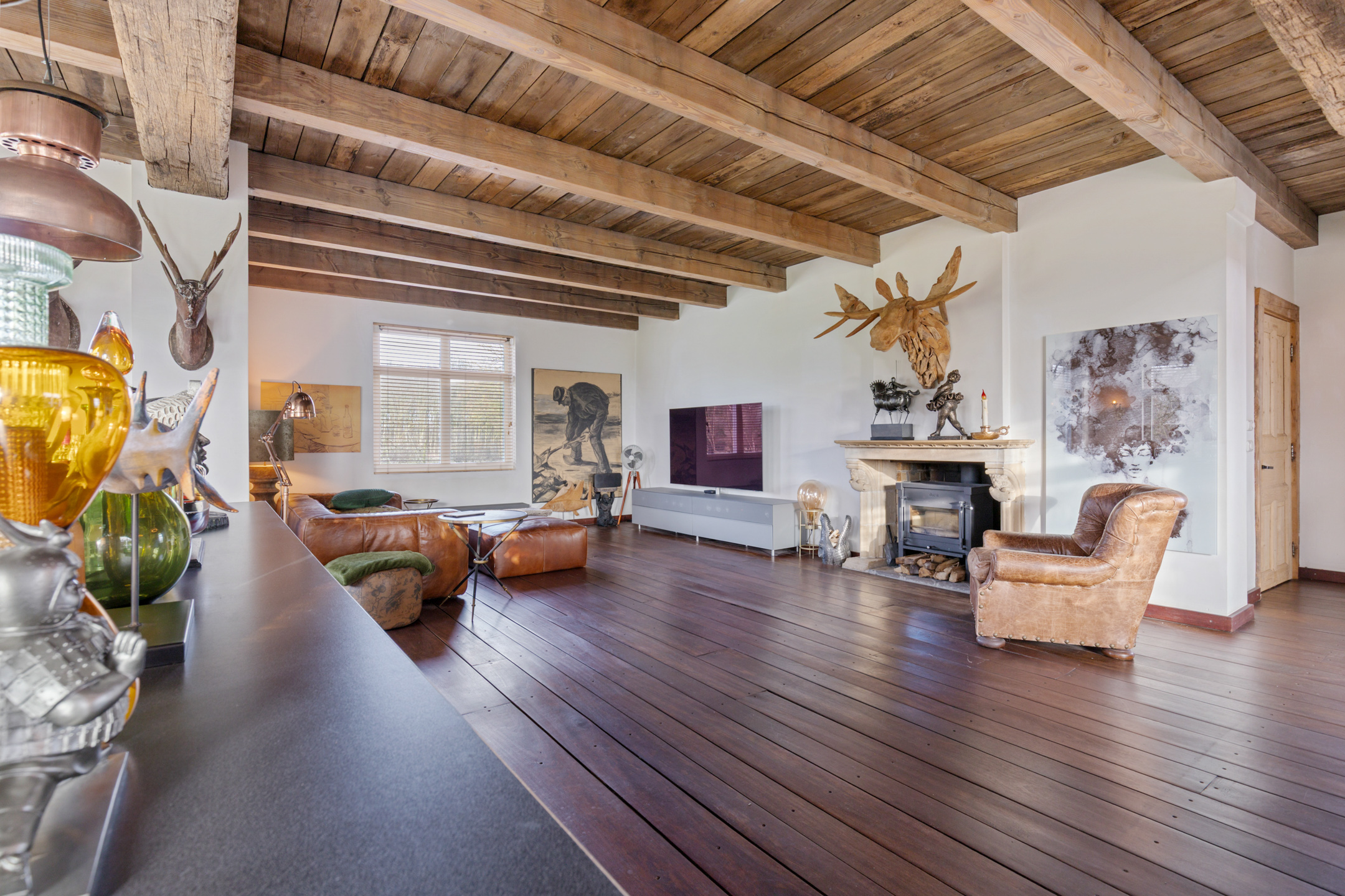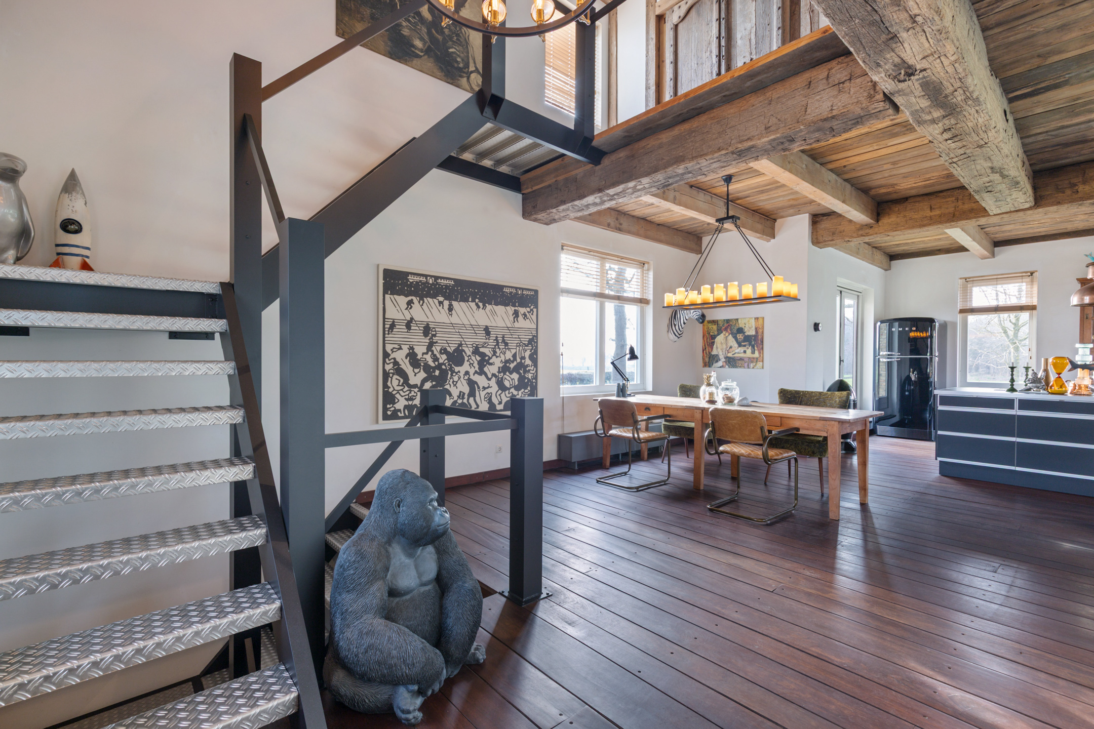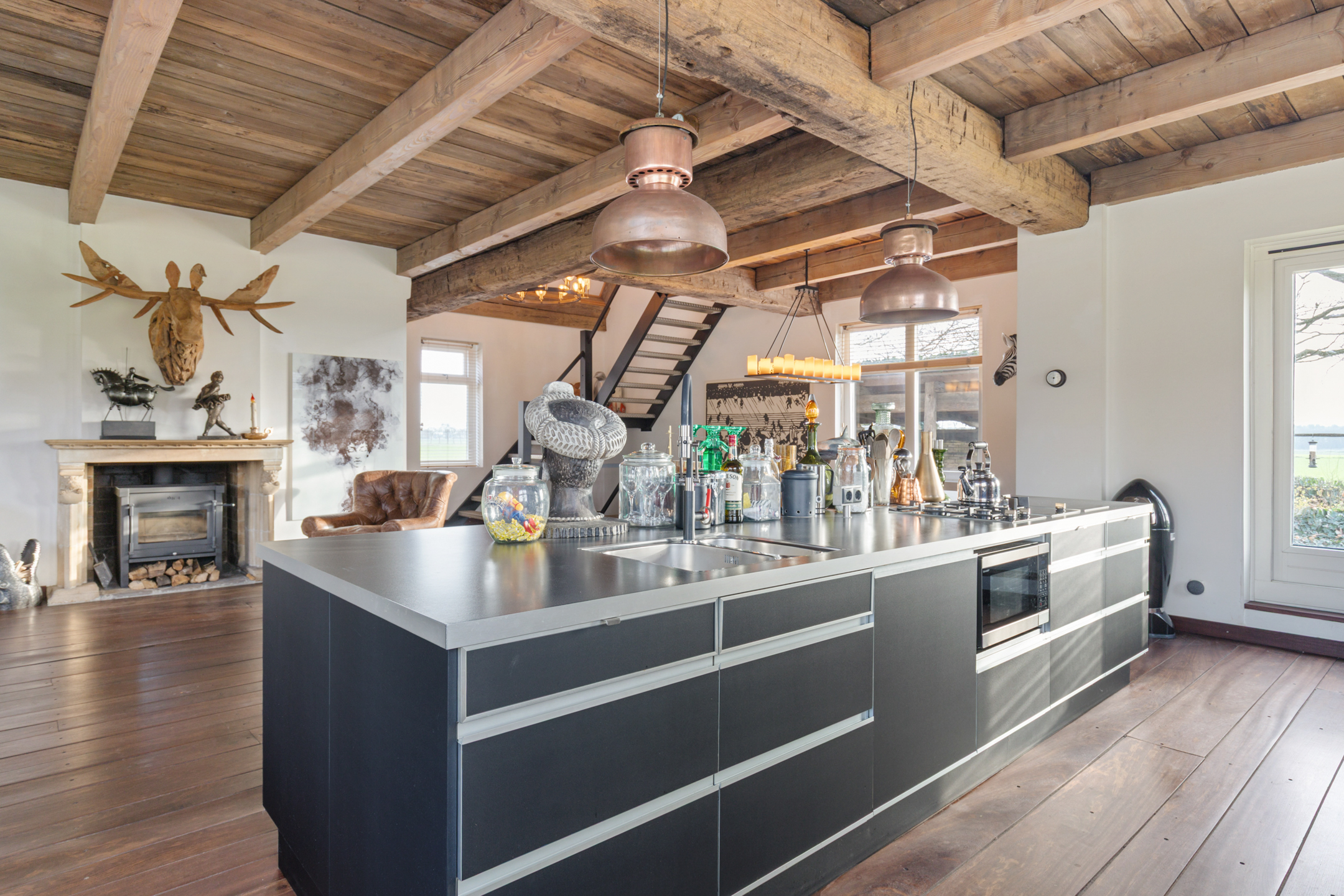 The spacious living room offers beautiful views of the Gaasterland natural landscape from virtually every window. Wherever you sit or stand, the surrounding nature becomes part of the interior experience. The atmosphere is defined by robust exposed beams, hardwood floors, a stylish fireplace with wood-burning stove and an impressive aluminium stair hall.