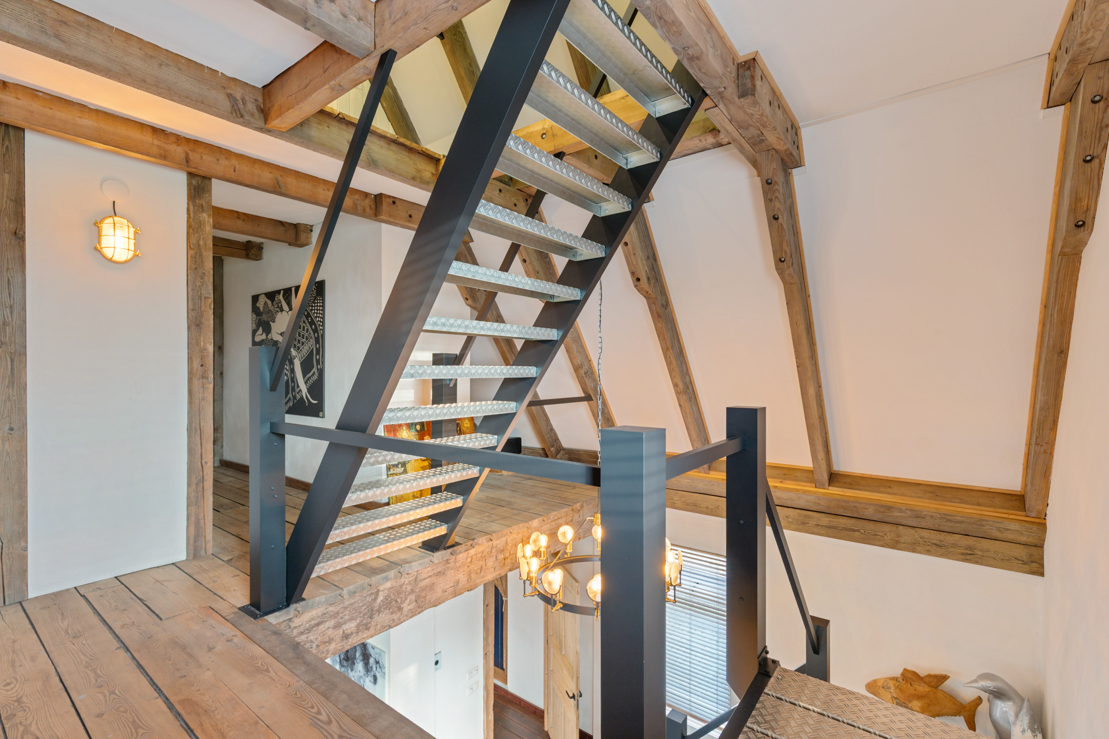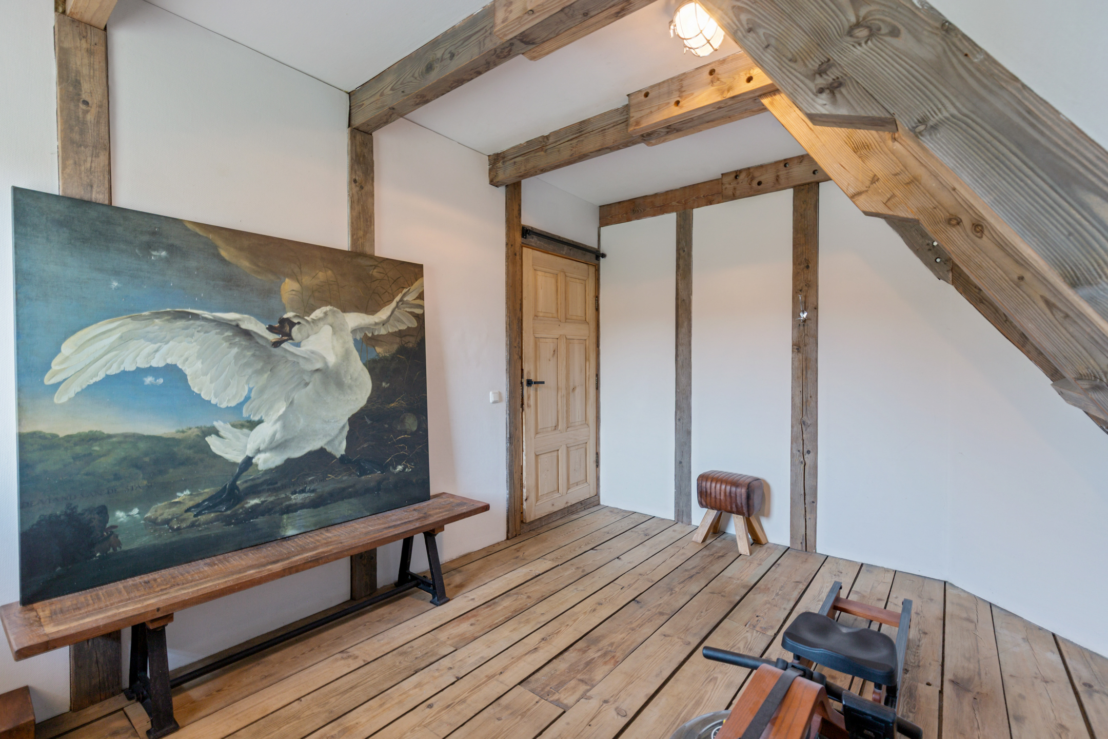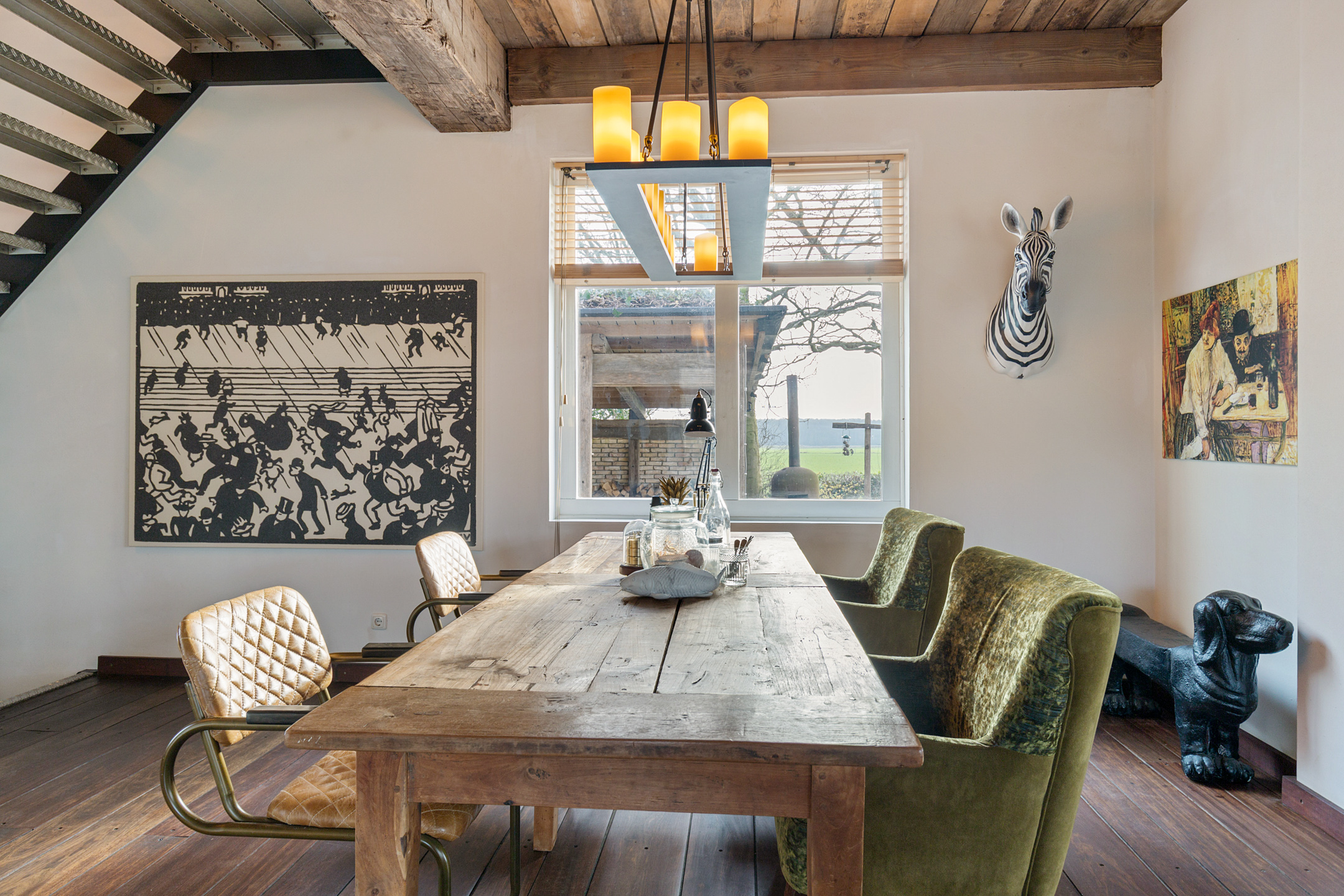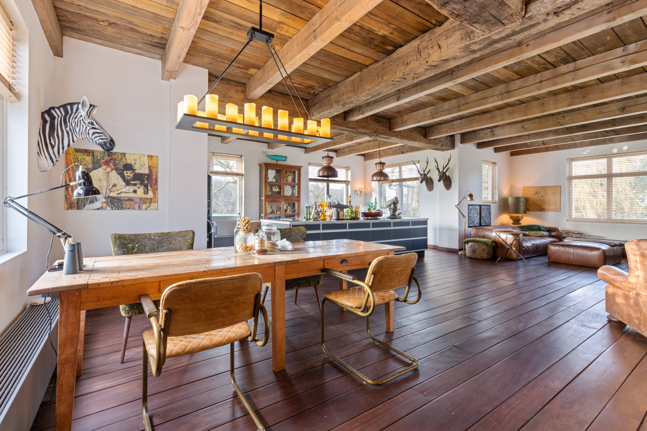 The spacious living room offers beautiful views of the Gaasterland natural landscape from virtually every window. Wherever you sit or stand, the surrounding nature becomes part of the interior experience. The atmosphere is defined by robust exposed beams, hardwood floors, a stylish fireplace with wood-burning stove and an impressive aluminium stair hall.