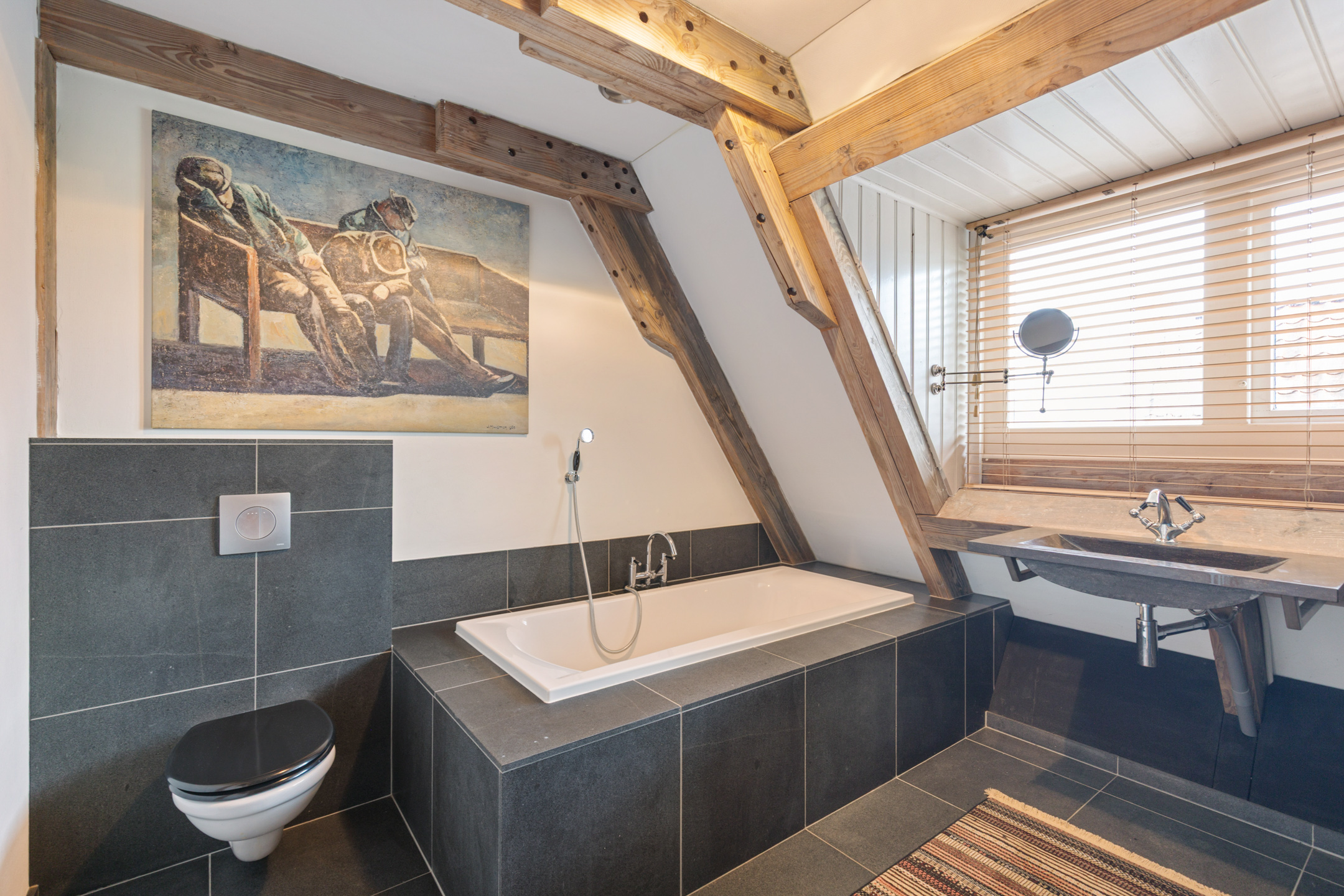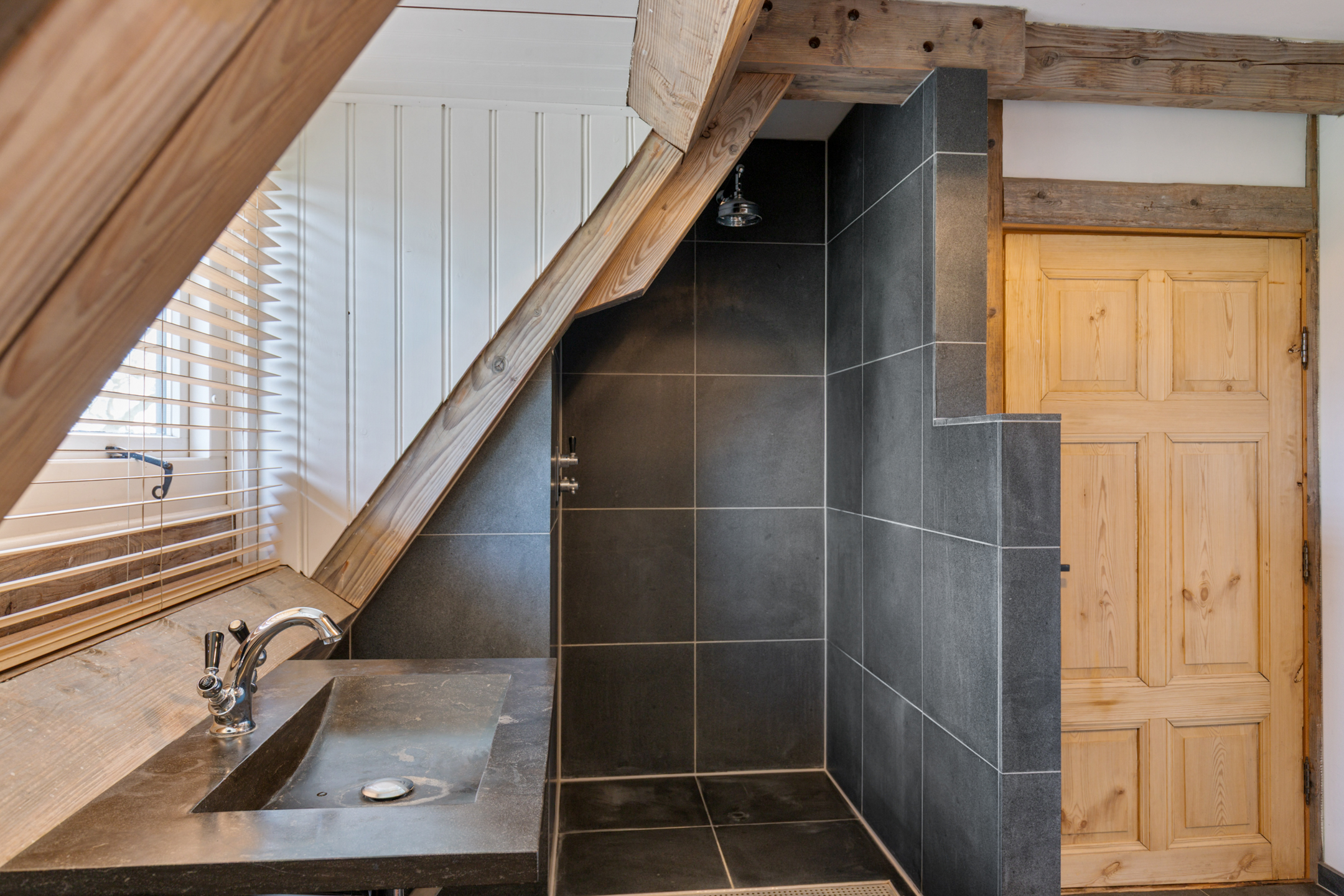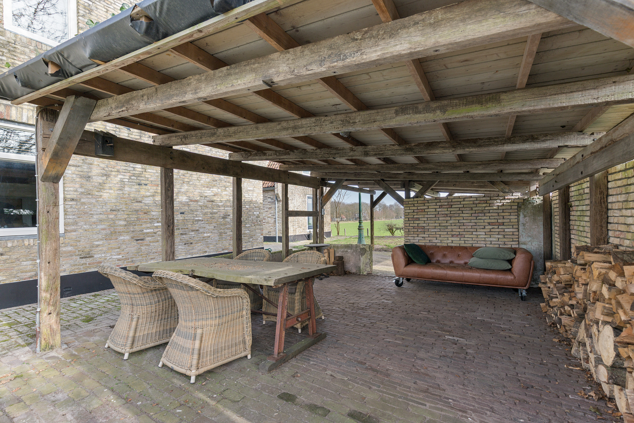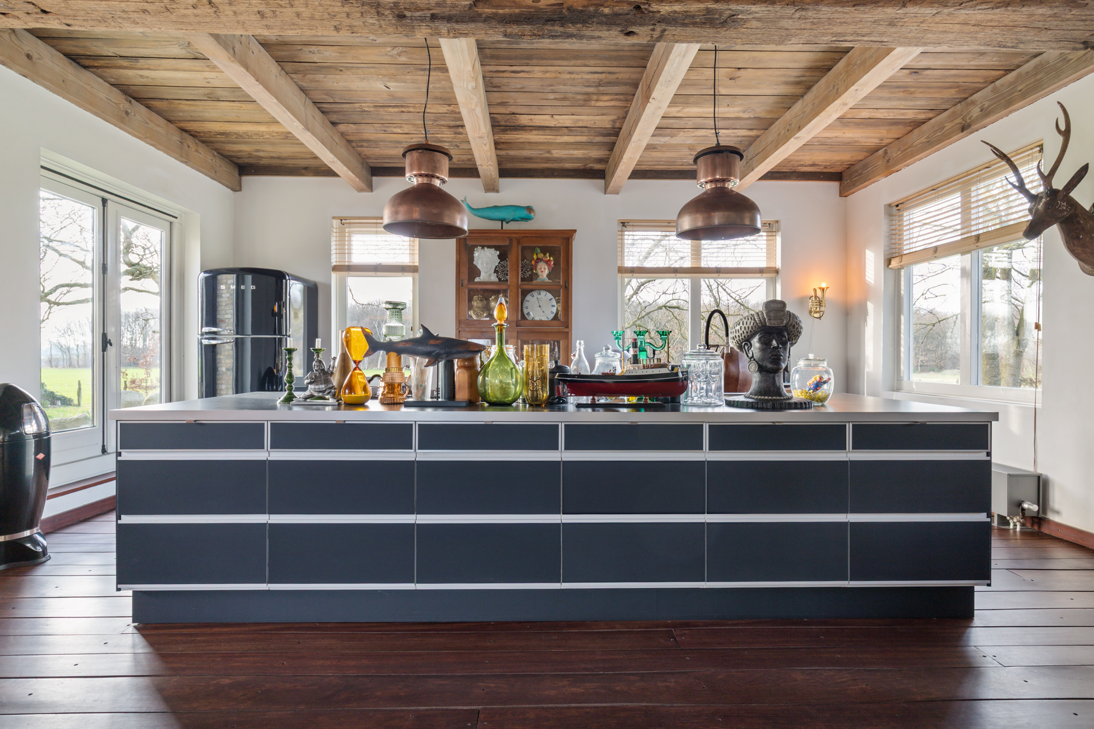 The spacious living room offers beautiful views of the Gaasterland natural landscape from virtually every window. Wherever you sit or stand, the surrounding nature becomes part of the interior experience. The atmosphere is defined by robust exposed beams, hardwood floors, a stylish fireplace with wood-burning stove and an impressive aluminium stair hall.