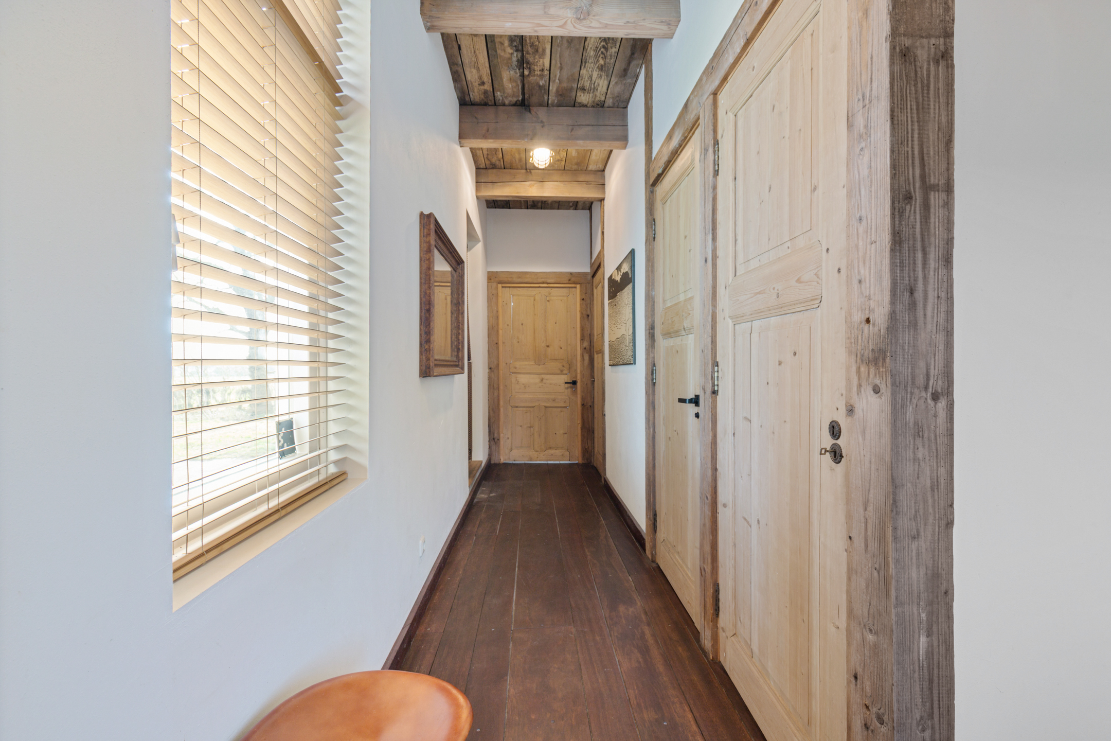 The landing with mezzanine leads to the master bedroom, a particularly atmospheric room thanks to the exposed beams, two dormer windows overlooking the garden and treetops, and the mezzanine level with a large walk-in wardrobe beneath.