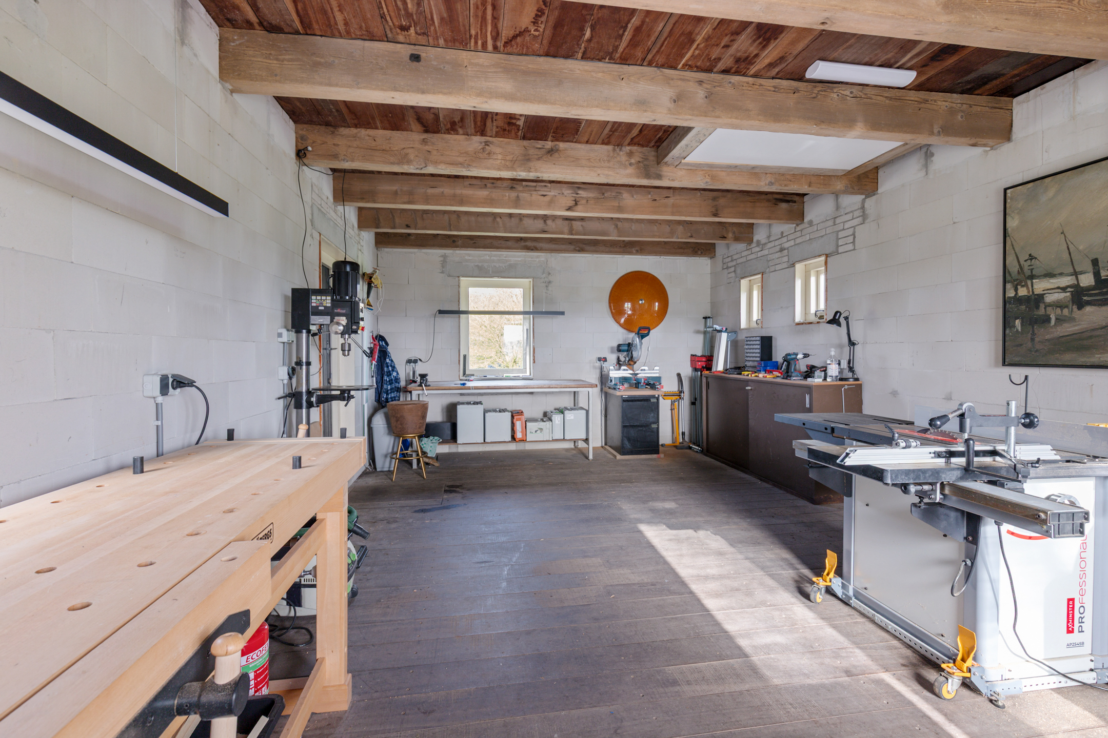 Currently it is used as a woodworking studio. The building is fully basemented and offers straightforward connection to the sewage system. Electricity and a new pellet stove are already installed, while a water connection can easily be realised via the existing PVC conduit to the main house.
