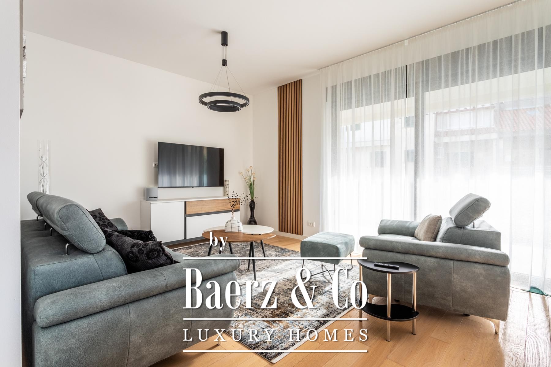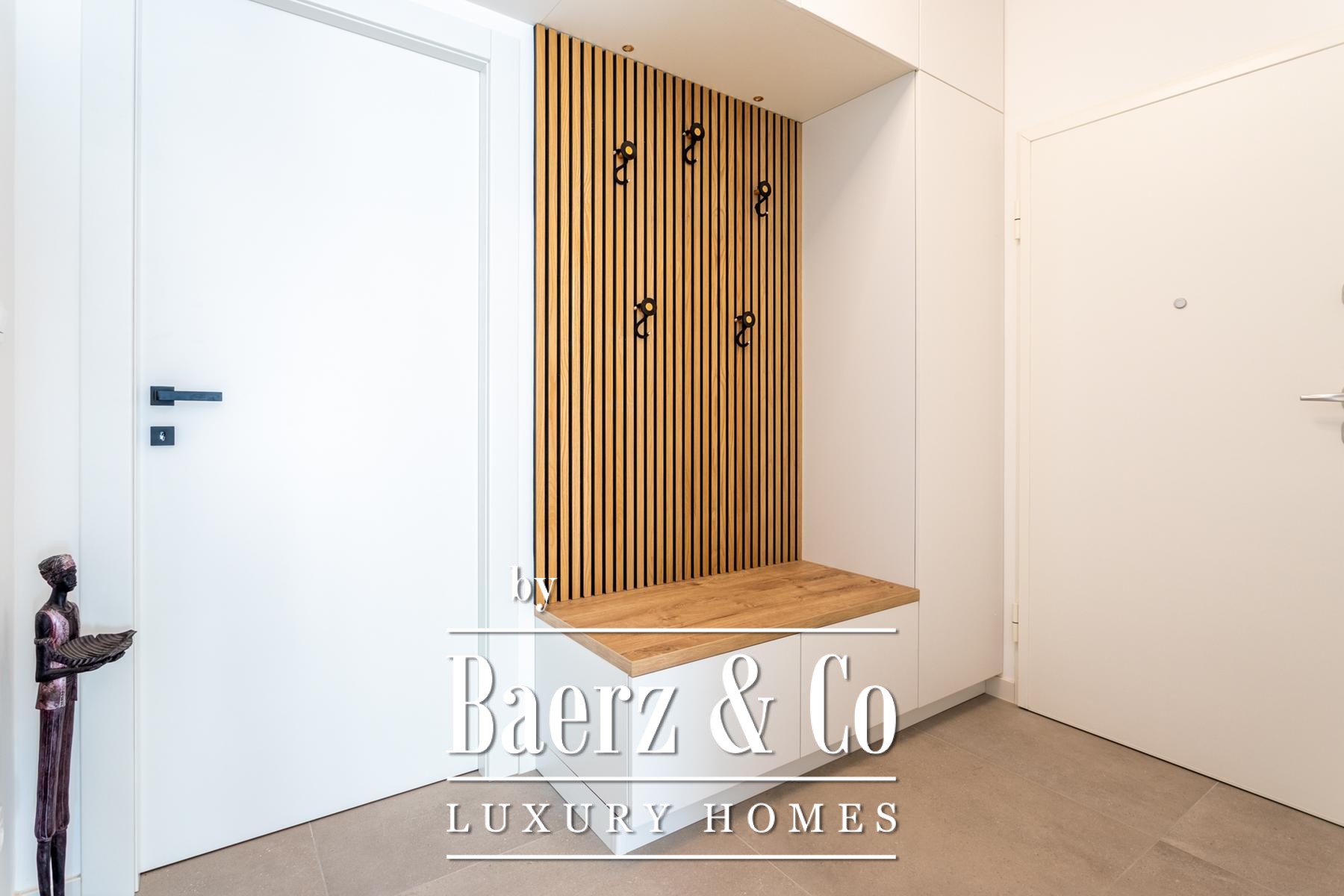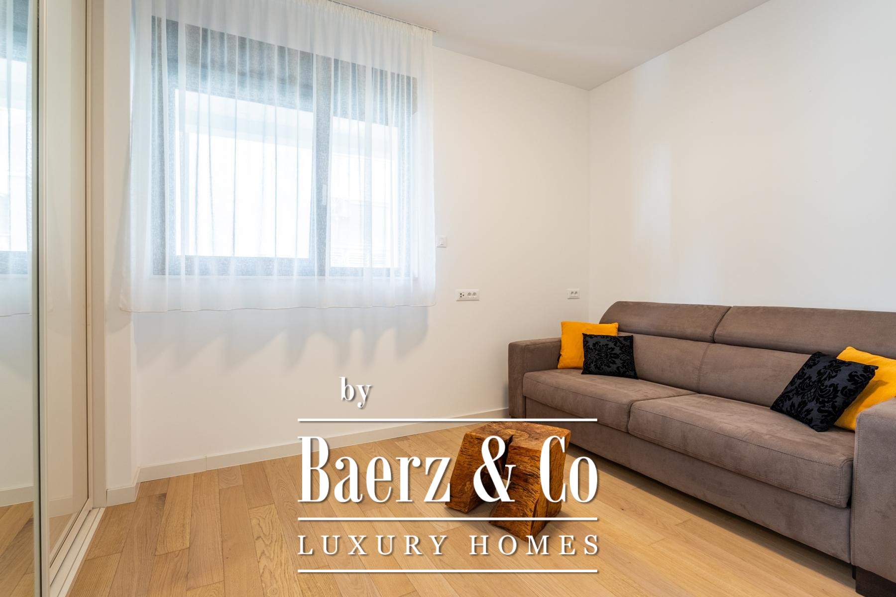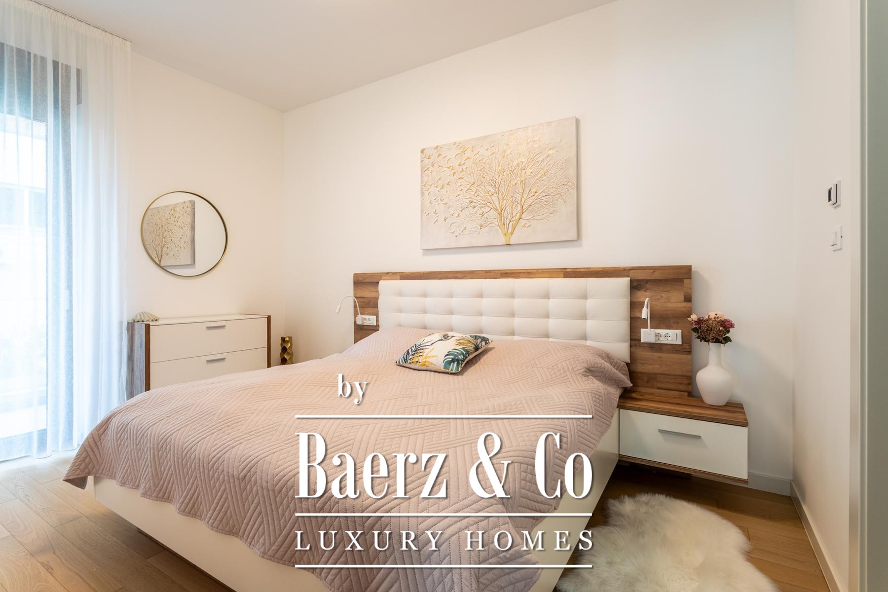 A spacious balcony extends the living space outdoors, while practical features such as two garage parking spaces and a storage room support both convenience and security. The apartment is fully and modernly furnished, with underfloor heating in bathrooms and kitchen, electric shutters, and a premium Daikin air-conditioning system, ensuring year-round comfort. Each bedroom enjoys its own wall-mounted unit, and the living areas are serviced by a floor-mounted system.