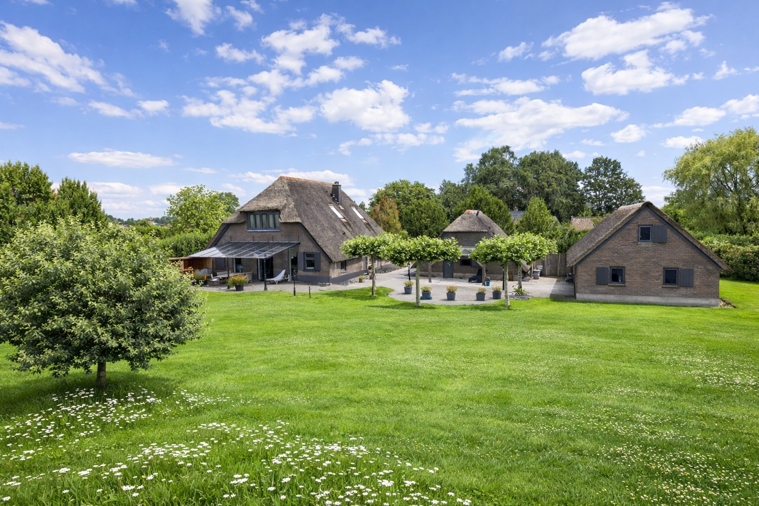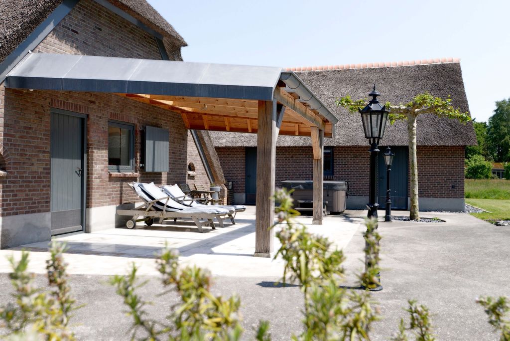 Accessed via an impressive entrance gate from the Quabbenburgerweg through the Wellinkhofweg, the estate immediately conveys a sense of exclusivity. The ensemble comprises a characterful main residence, a stylish detached guest house with veranda and sauna, and a substantial thatched double garage with loft, all designed in harmonious architectural style.