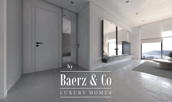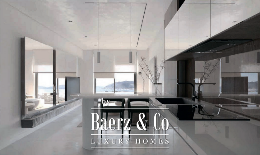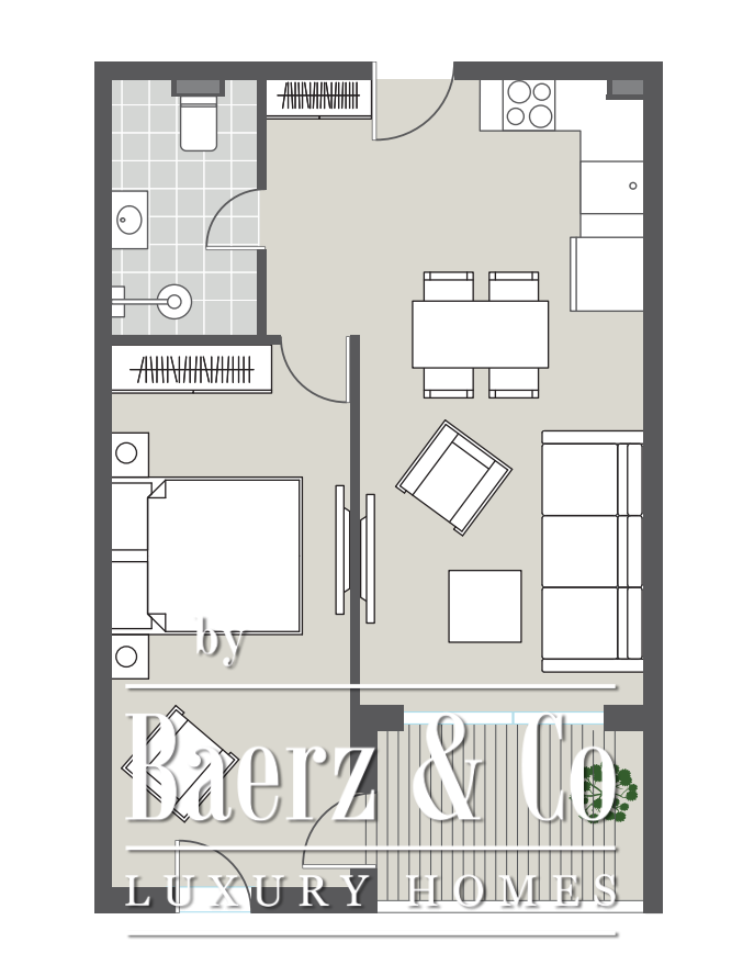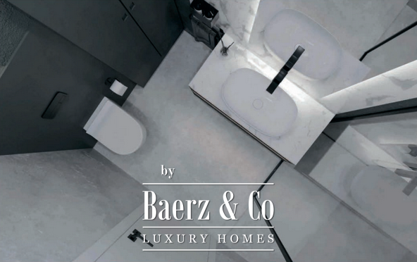 Located on the first floor, the apartment features a bright living room with kitchen and dining area, one bedroom, a bathroom, and a terrace. The turnkey concept delivers bespoke interiors curated by ANSER & Partners, furnished with pieces by Old Hara, and complemented by integrated household appliances and smart home systems. Every detail, from Villeroy & Boch fixtures to Samsung WindFree climate control, is designed for understated comfort and technological ease.