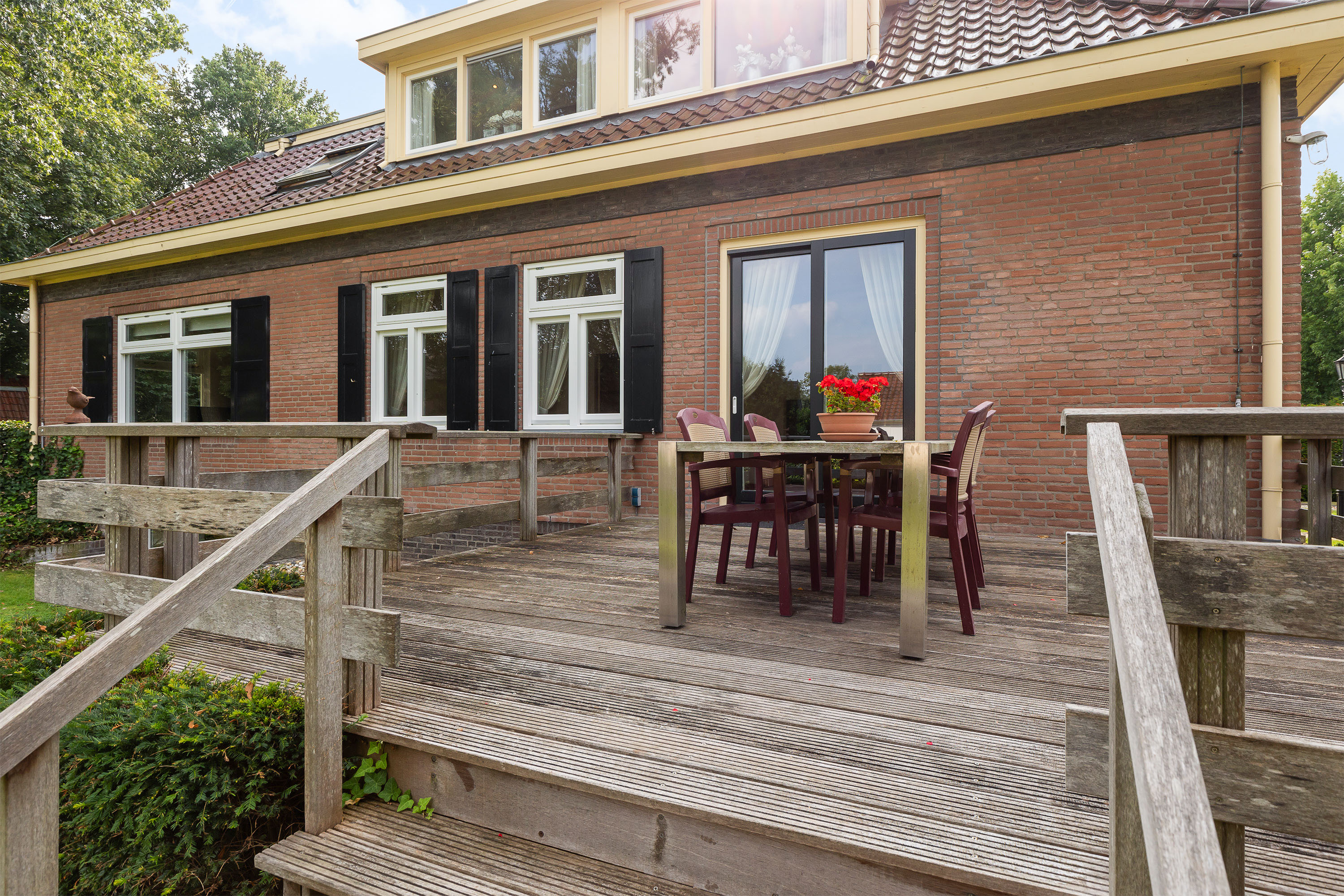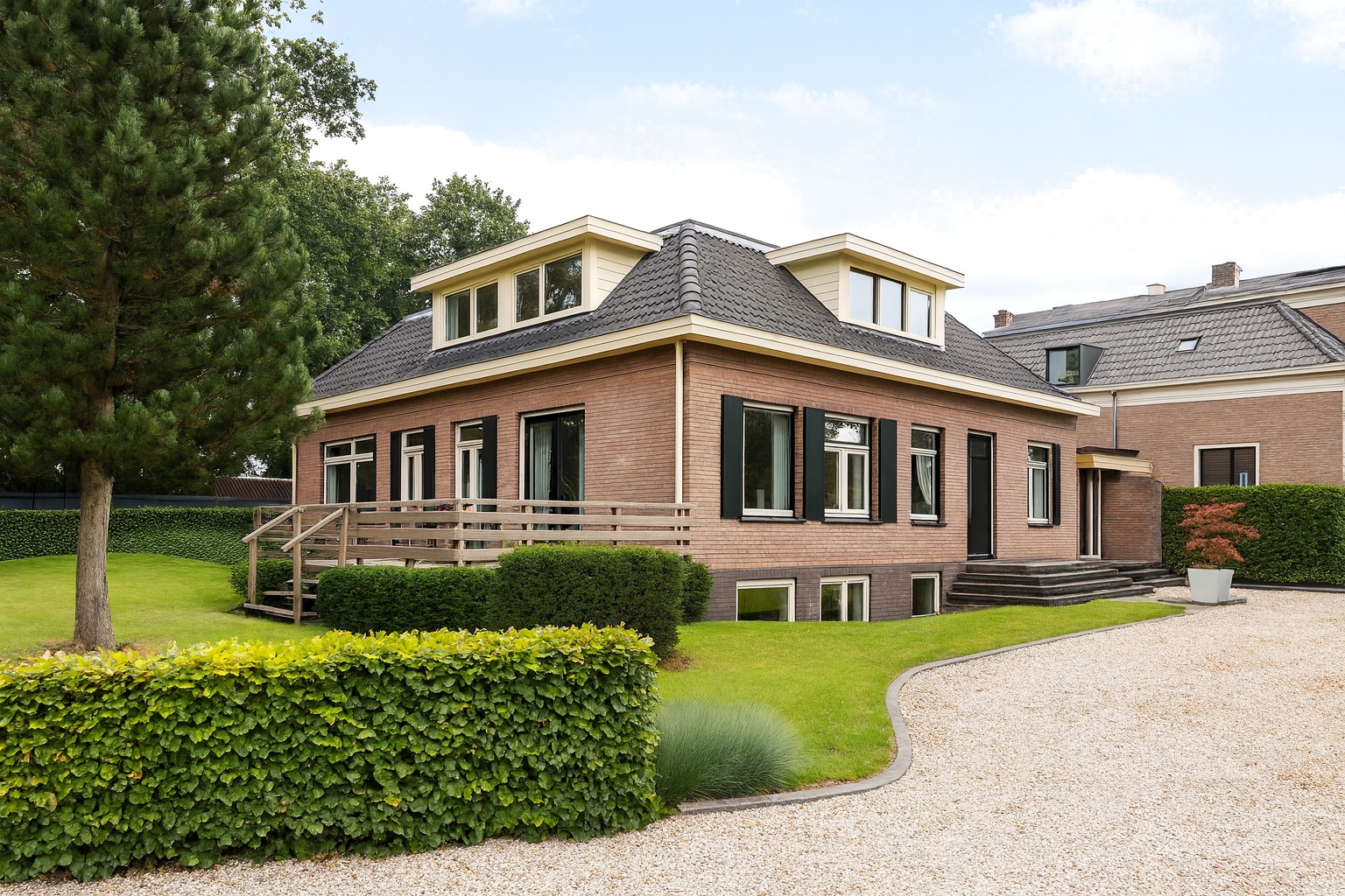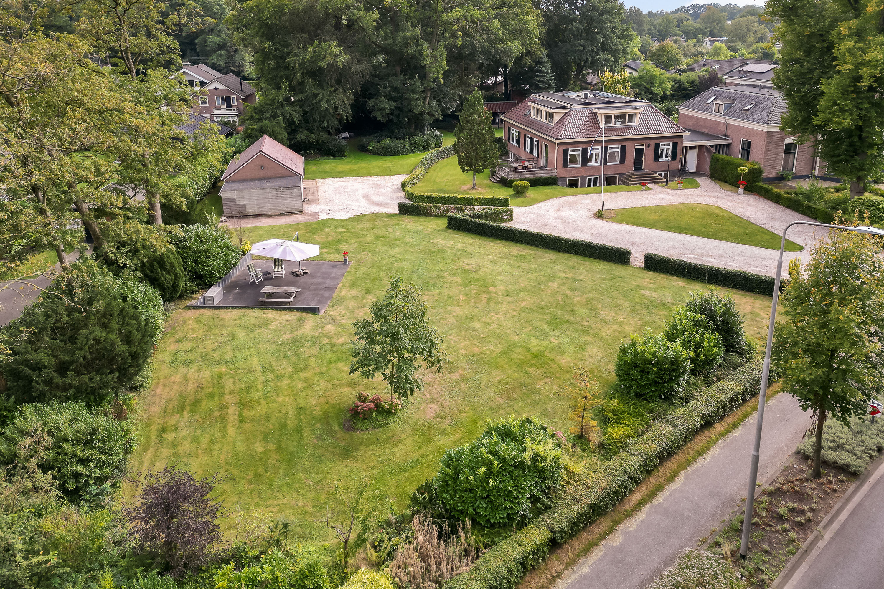 The house is surrounded by a generous garden with three terraces, each offering its own ambience and privacy. The driveway at the front has an impressive appearance with a greenery plantation and tall flagpole, surrounded by eight parking spaces. The driveway also leads to the detached garage with generous storage, carport and a third private parking space. At the back of the garden is a gazebo with tiled roof, ideal as storage space or cosy veranda. The garden itself offers plenty of opportunities for relaxation and recreation, with lush hedges, decorative paving, a large lawn and mature trees providing shaded areas and privacy.