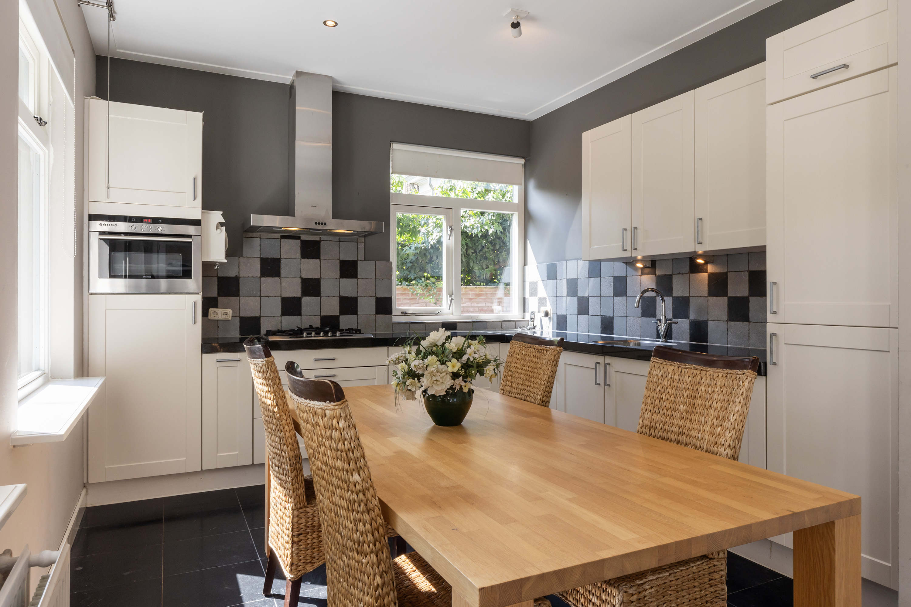The kitchen is located at the front of the house and overlooks the driveway and front garden. Although the kitchen layout is dated, the space is functional with several built-in appliances such as a fridge, freezer, gas cooker with oven and microwave. Adjacent is a modern, fully tiled toilet room and a bathroom with a walk-in shower, wash basin and connections for washing appliances.