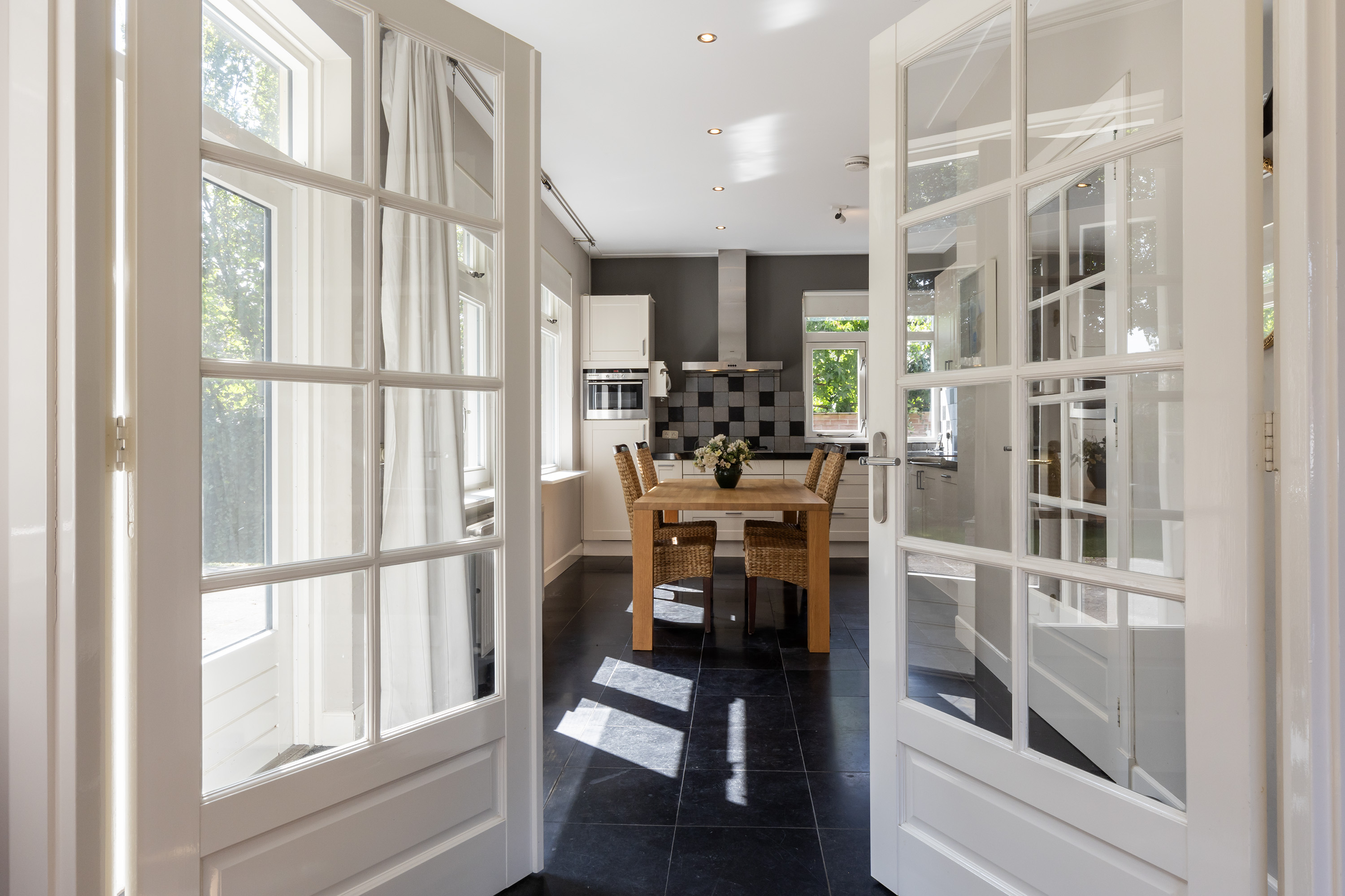 Upon entering the main house, you are welcomed in a vestibule, which leads to a central hall with access to all main rooms. The hall is the heart of the house and connects the spacious L-shaped living room on the left with the kitchen on the right. The living room is pleasantly bright thanks to large windows and French doors to the deck terrace, perfect for a cosy sitting and dining area.