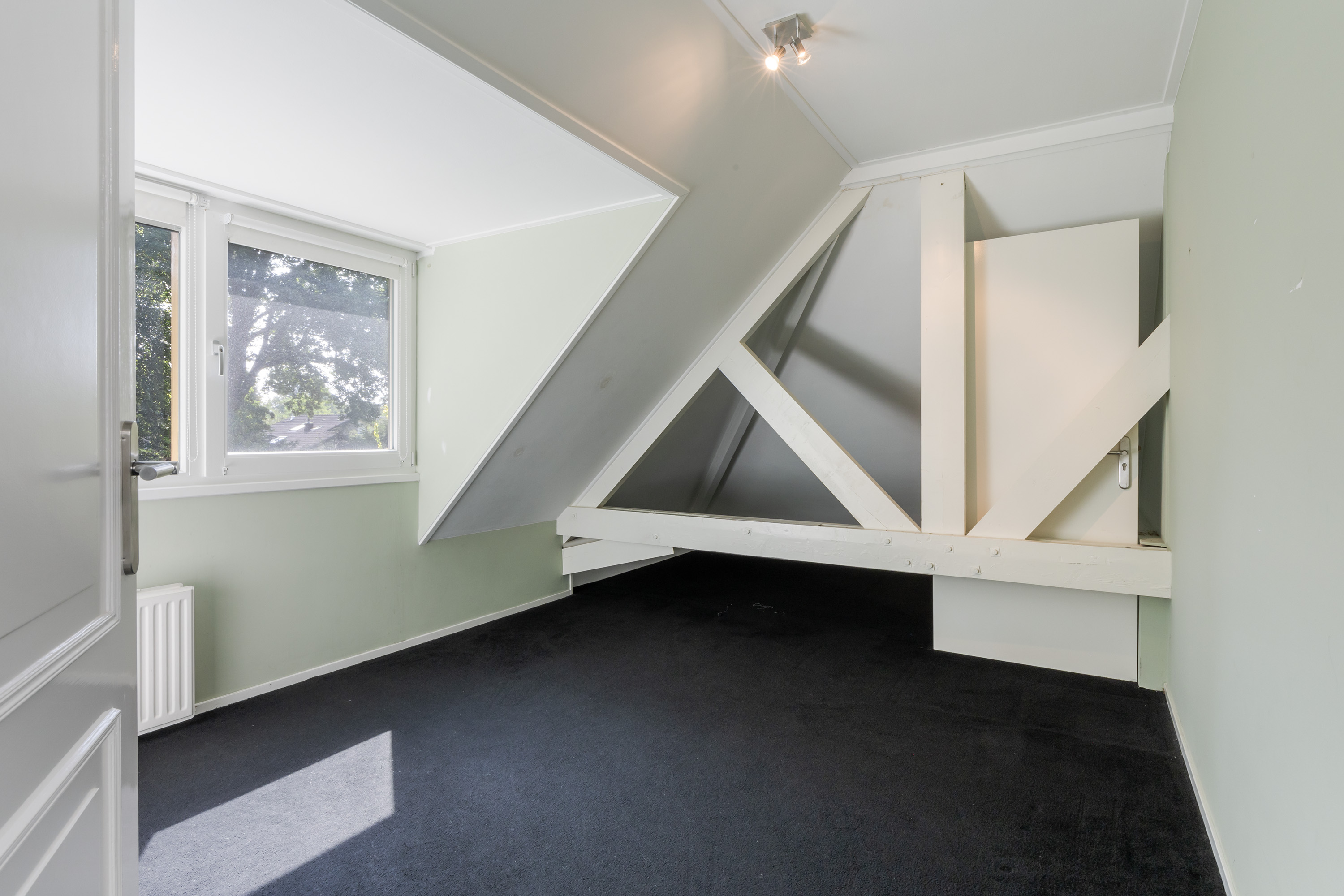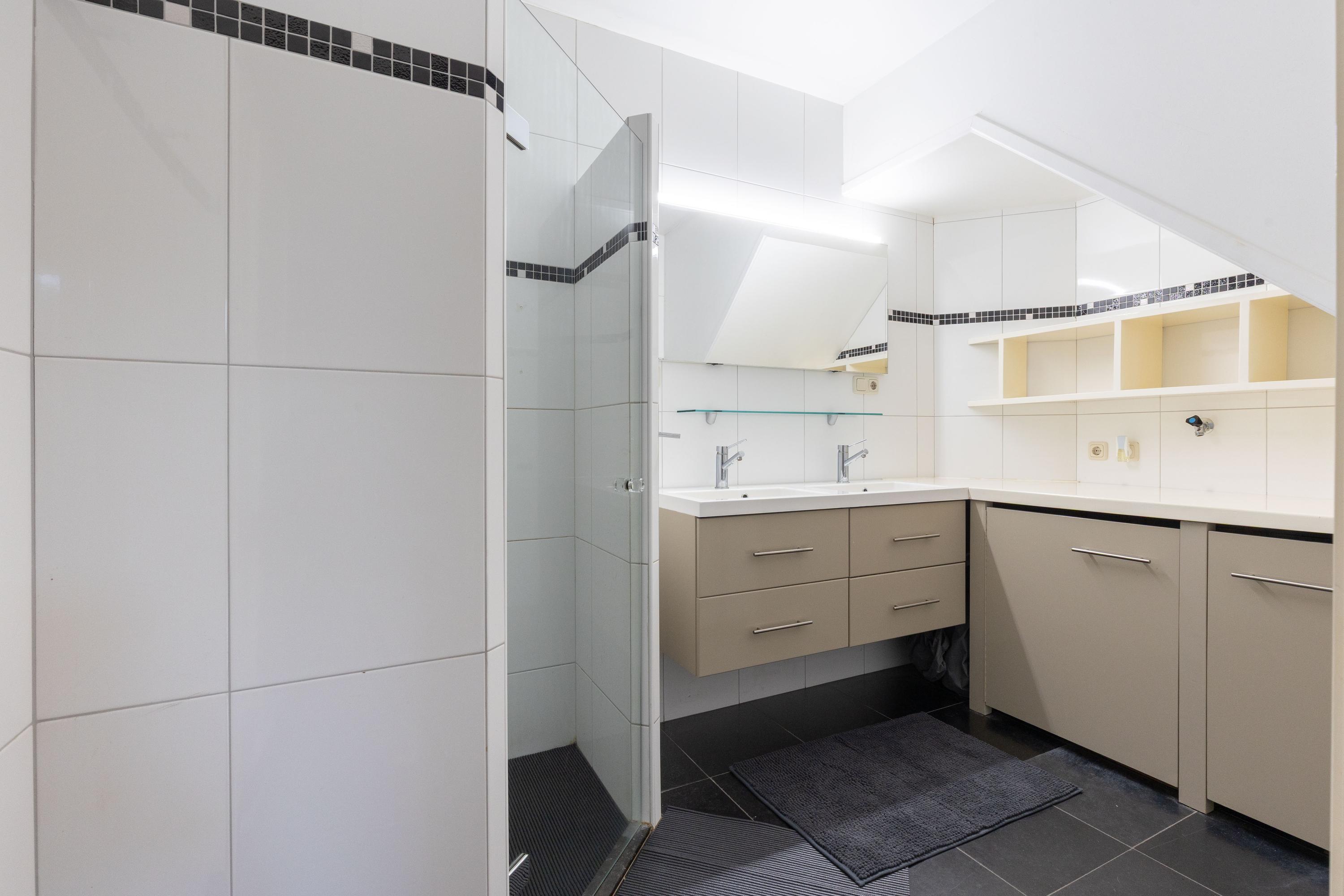On the first floor you will find two spacious bedrooms, including a generous master bedroom with air conditioning, large dormer windows and Velux skylights that provide an abundance of natural light. This room offers ample space for a sitting or working area. The second bedroom is also suitable for a double bed and has a dormer window. A modern bathroom with walk-in shower, washbasin and second toilet completes the comfort.