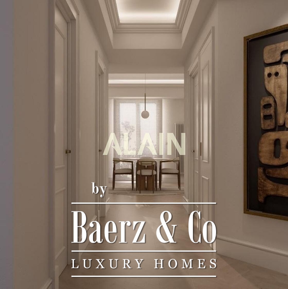 The property offers three bedrooms, including a master suite with a private dressing room and en-suite bathroom. The two additional bedrooms provide large built-in wardrobes, while the master bedroom enjoys direct access to a private balcony. Five French doors usher in persistent daylight, animating both shared and private interiors.