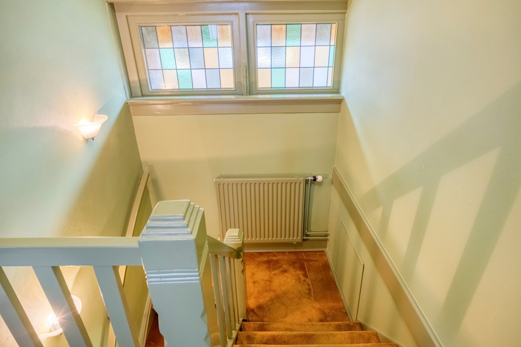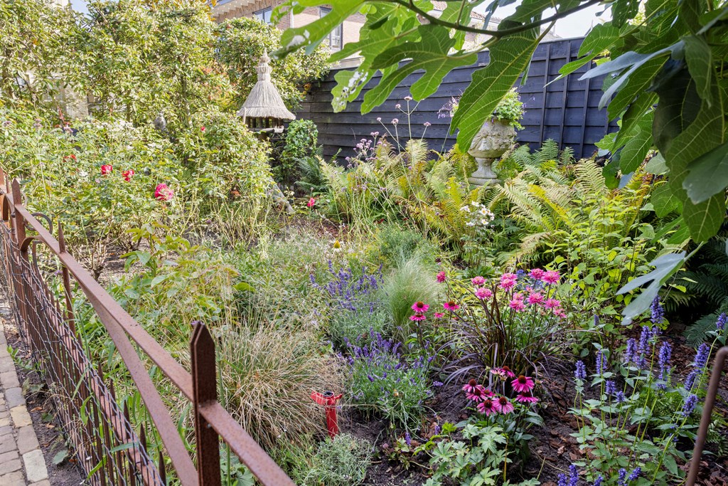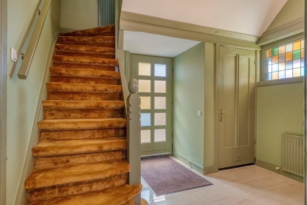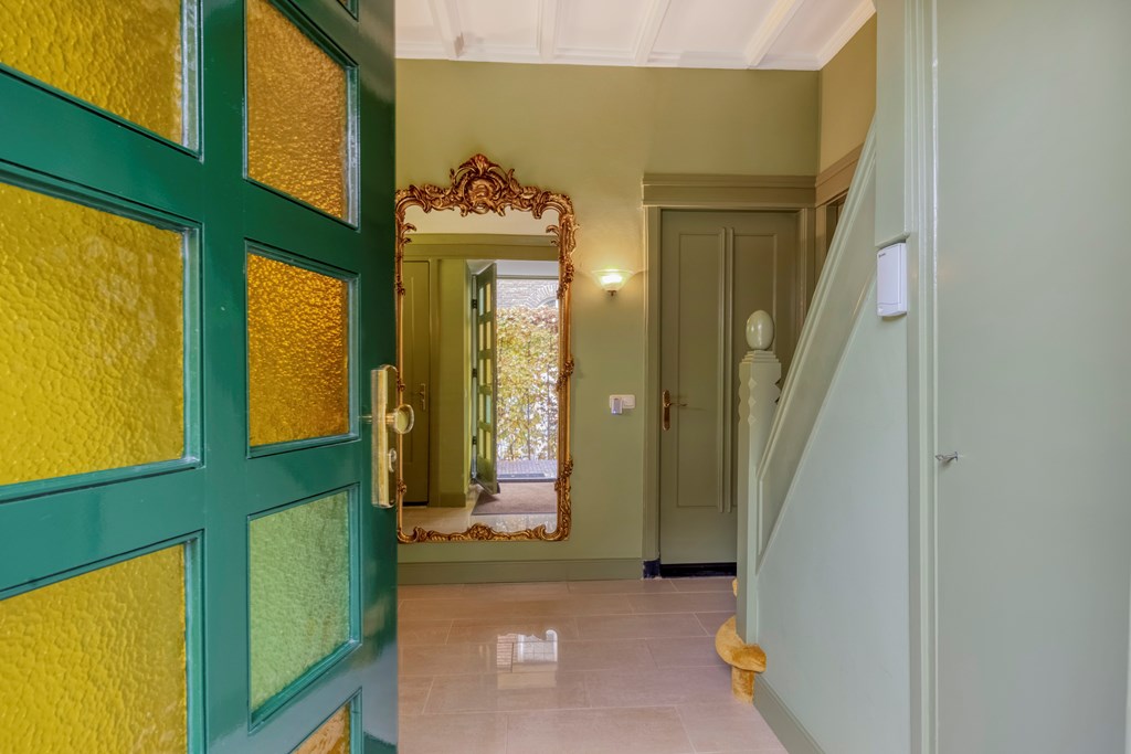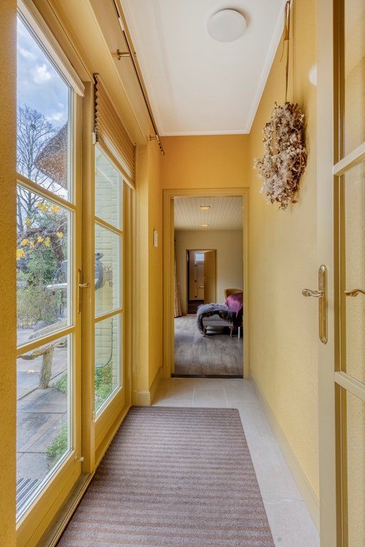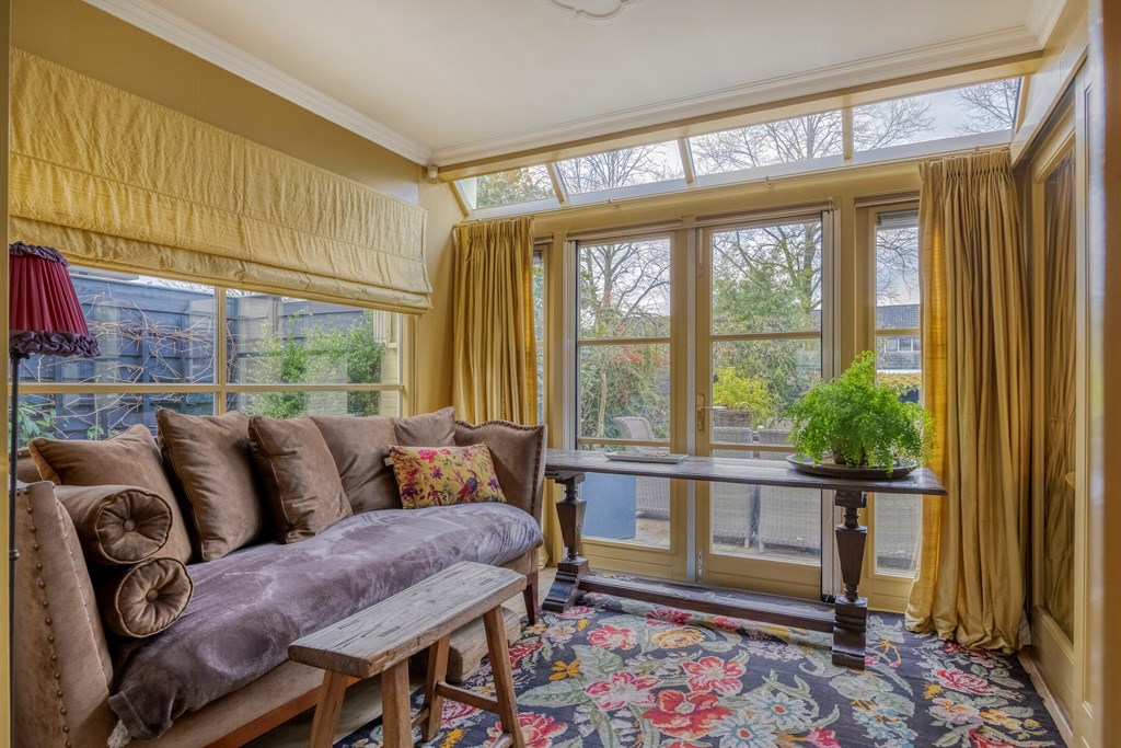 You enter via the side of the house into the hallway, where the first 1920s details immediately reveal themselves: warm materials, lovely natural light, stained-glass windows and a pleasant flow towards the basement and living area. The toilet is modern and the staircase is authentic. The living room extends deep into the house and is wonderfully bright thanks to the large windows, bay window and the conservatory at the rear. The sense of warmth comes from the wooden floors, the elegant fireplace surround and the different seating areas that make the whole intimate and inviting. The conservatory is a delightful addition; here you can easily create a cosy seating area, with views of the garden through the French doors.