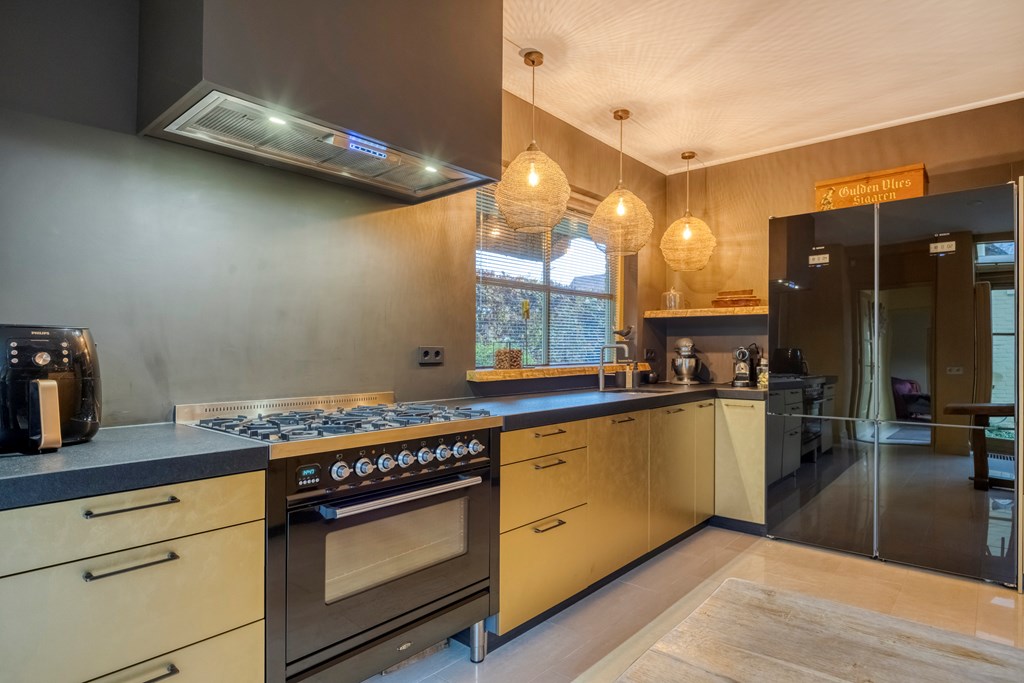 The live-in kitchen is modern and fitted with luxury appliances such as a large gas stove, a canopy extractor, dishwasher, fridge and freezer, air conditioning and a Quooker tap. Here you cook with a view of the garden, while natural light beautifully glides across the kitchen’s golden fronts. The conservatory and back garden can also be accessed via the kitchen. Adjacent, you reach on one side the practical utility room with laundry connections, and on the other a very spacious bedroom with an equally spacious walk-in closet and an en-suite bathroom. Sliding doors connect the bedroom to the garden, and the garden can also be easily reached via the walk-in closet. The generous bathroom features light tiling and a skylight, a whirlpool bath, double vanity, walk-in shower, wall-hung toilet and plenty of storage space.