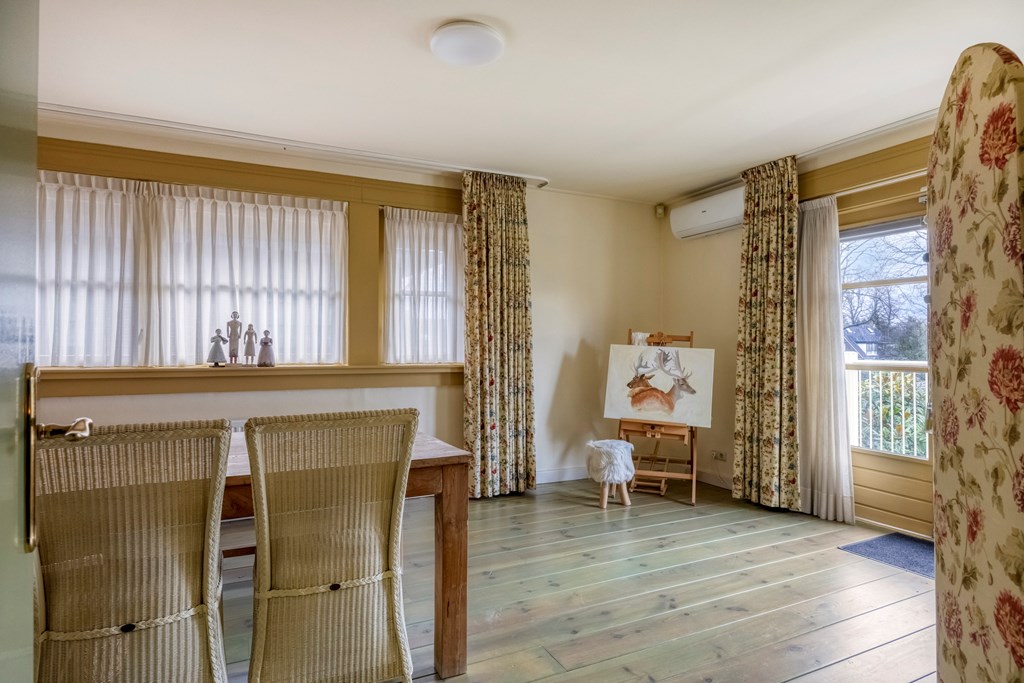 The first floor brings you to the bright landing with air conditioning and connects to three spacious bedrooms and a second bathroom. Each room has its own charm and a convenient washbasin unit. The largest room also has air conditioning and offers access to the generous balcony through French doors, overlooking the deep garden. The bathroom on this floor is practically laid out with a washbasin, shower and toilet. The floor feels airy thanks to the space and the abundance of daylight throughout.