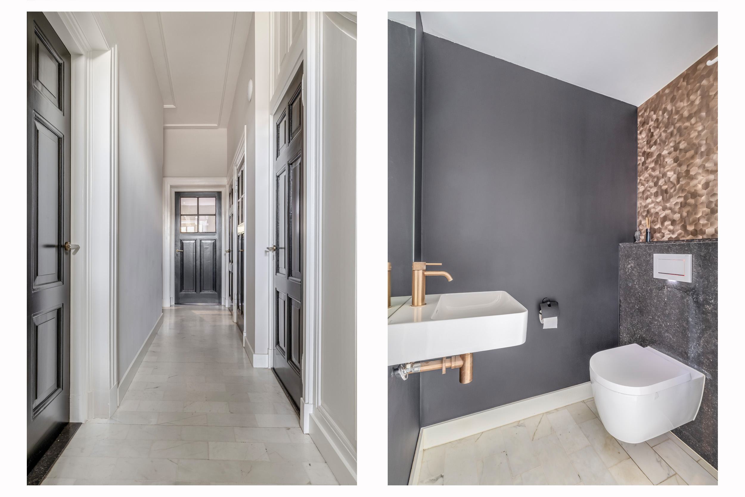 Townhouse Venlo is a remarkable example of 1920s architecture set in the heart of the city, combining historic character with contemporary comfort and a privileged outlook over the Rosarium. This residence spans 225 m² across three levels, offering five bedrooms, two bathrooms, and an abundance of natural light throughout. From the wide entrance hall with its Bianco Carrara marble tile floor to the spacious living room finished in French oak herringbone parquet, every space resonates with quiet refinement and authenticity.