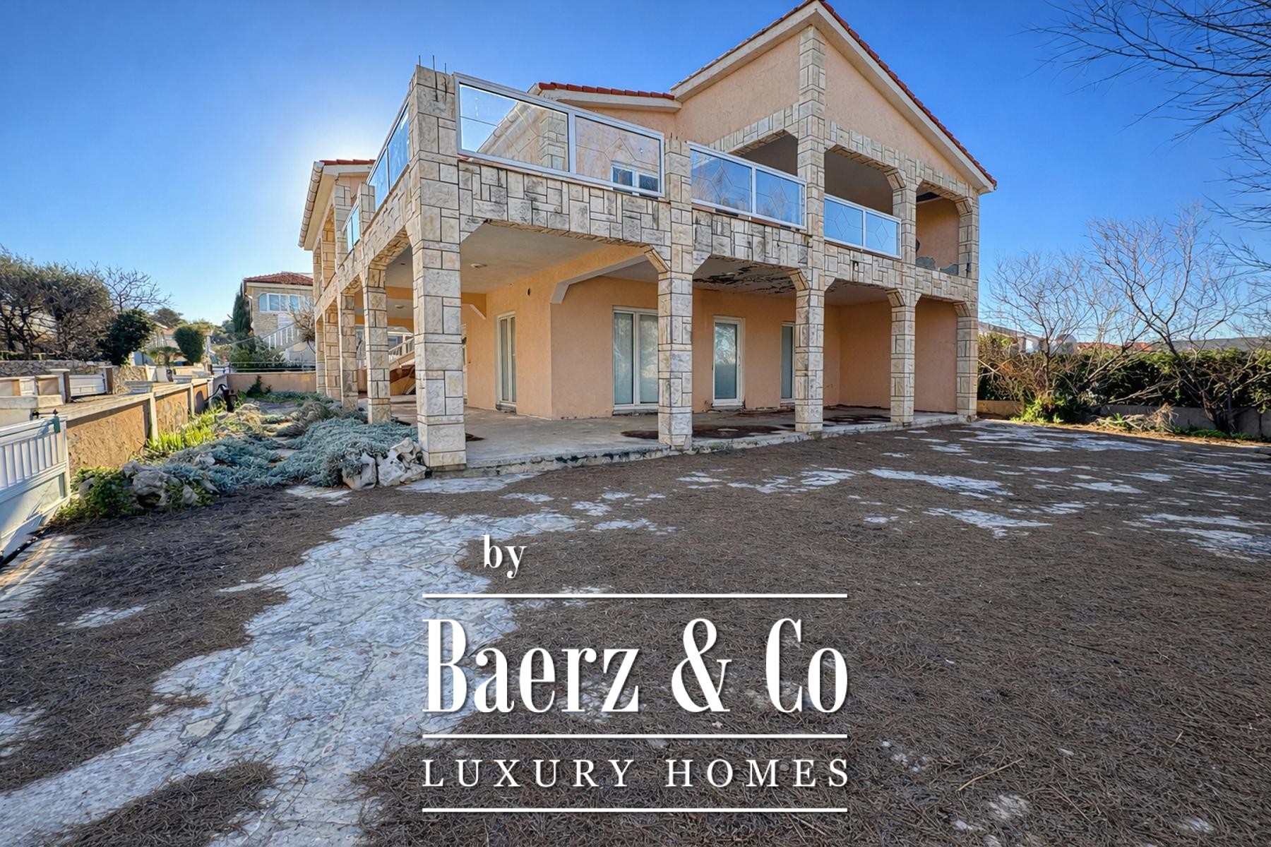 Built in 2006 and never lived in, the house awaits renovation, allowing for bespoke adaptation to individual taste and vision. The home rises over two floors: the ground level presents an open kitchen, dining and living area, bedroom, bathroom, terrace, and garage. The first floor opens to an additional kitchen, living and dining space, four bedrooms, two bathrooms, two separate toilets, and a terrace that commands unobstructed views of sea and sky.