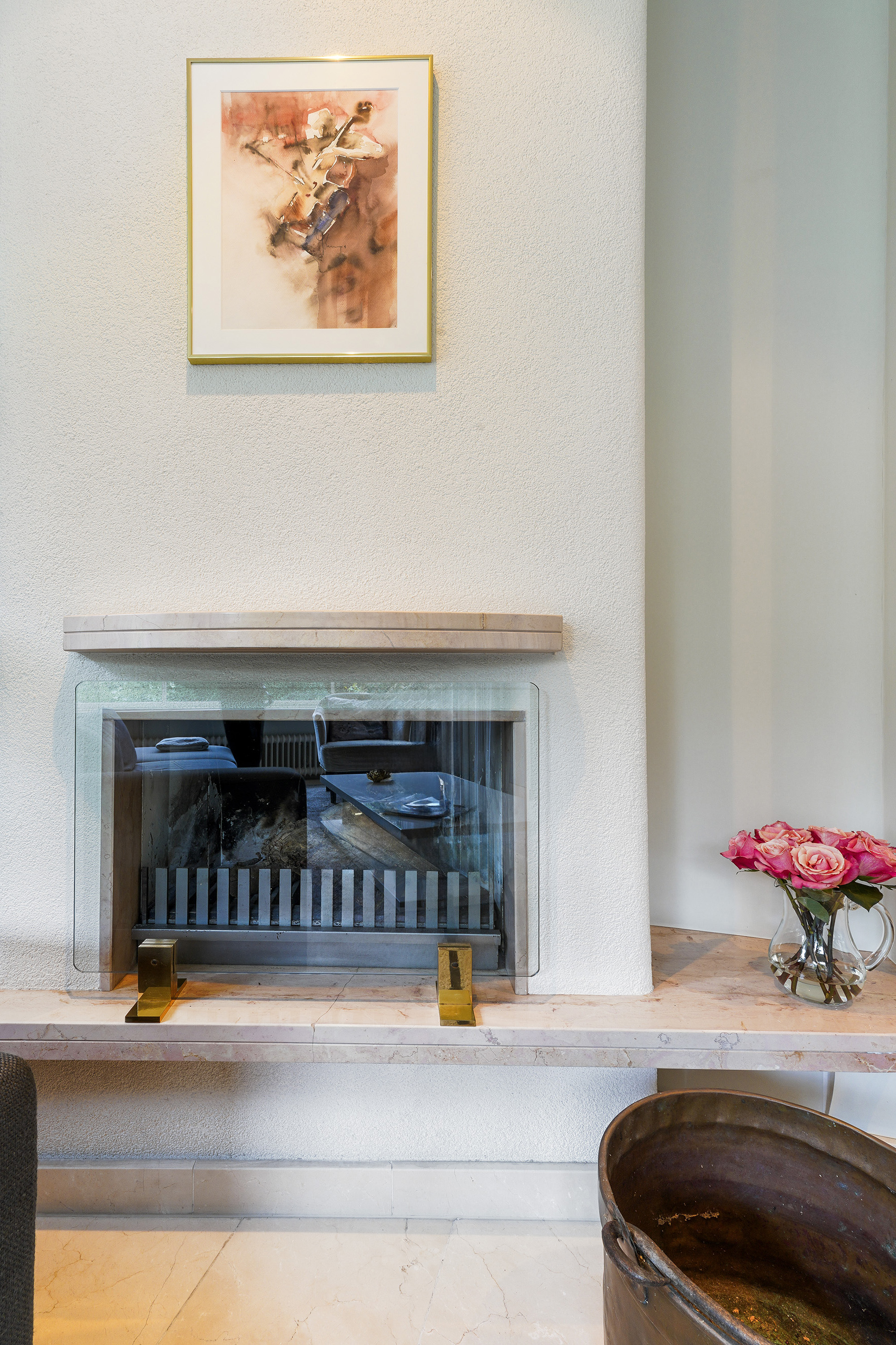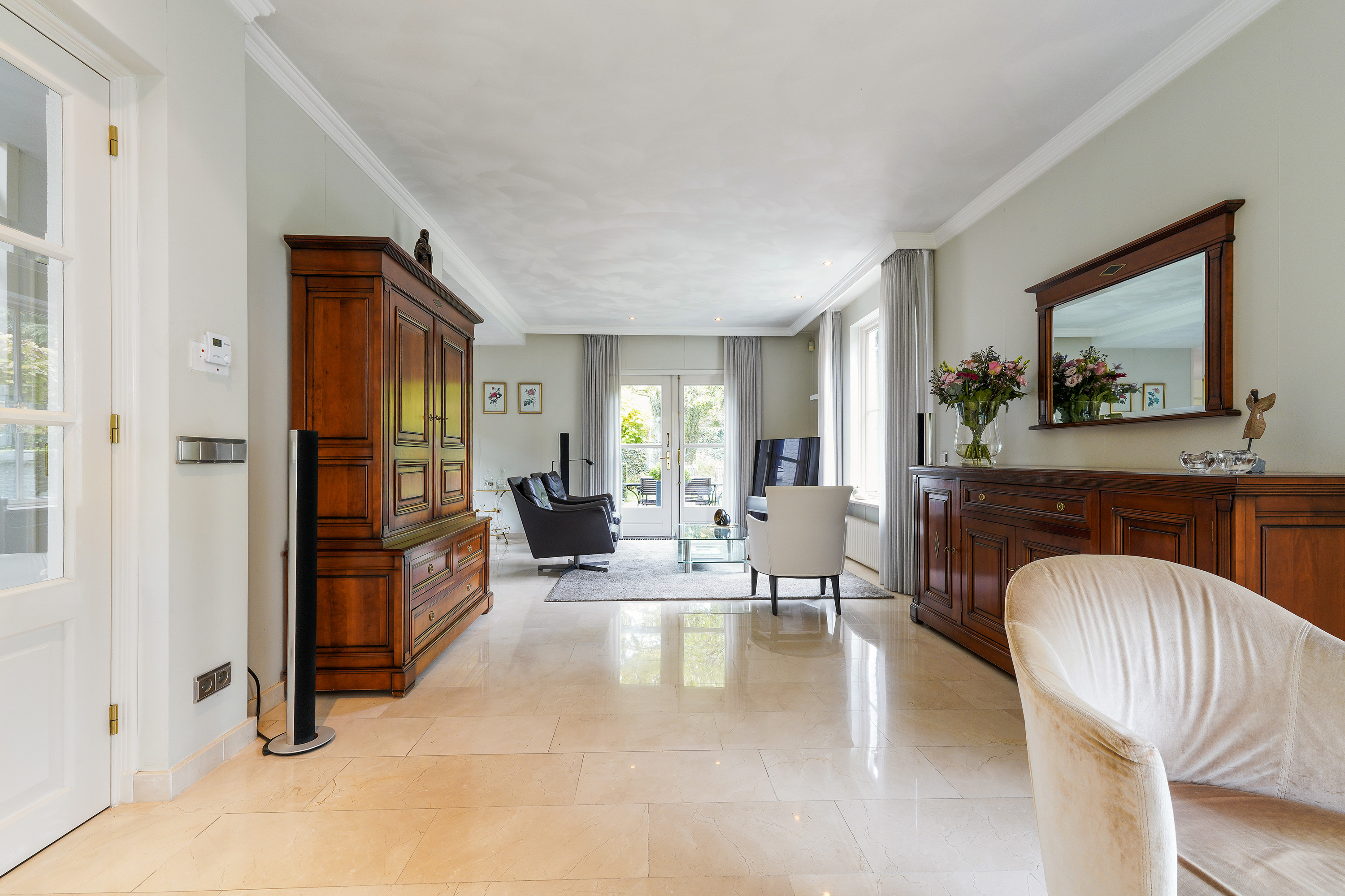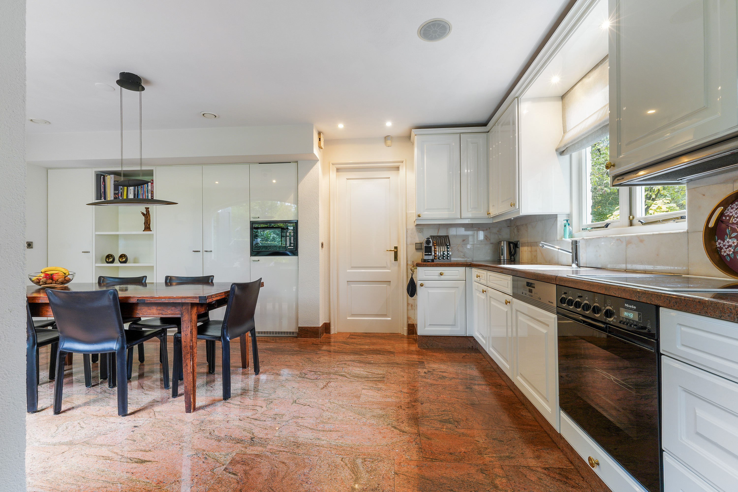 The ground floor exudes a sense of space and elegance. The expansive living area of around 70 m² is divided into a sitting room, dining area and open-plan kitchen — all seamlessly connected yet each with its own atmosphere. Large windows allow for an abundance of natural light and offer stunning views of the green surroundings. The travertine floor, light walls and ceilings create a serene and stylish foundation.