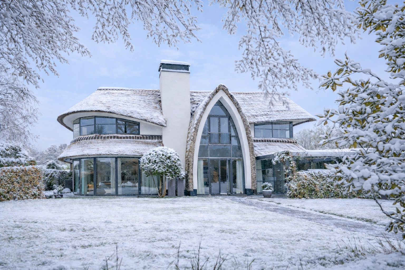 With its thatched roof, sculptural lines, and remarkable waterside position, this villa is a true landmark in the region — designed by Van Manen Architects, known for their timeless and elegant style.