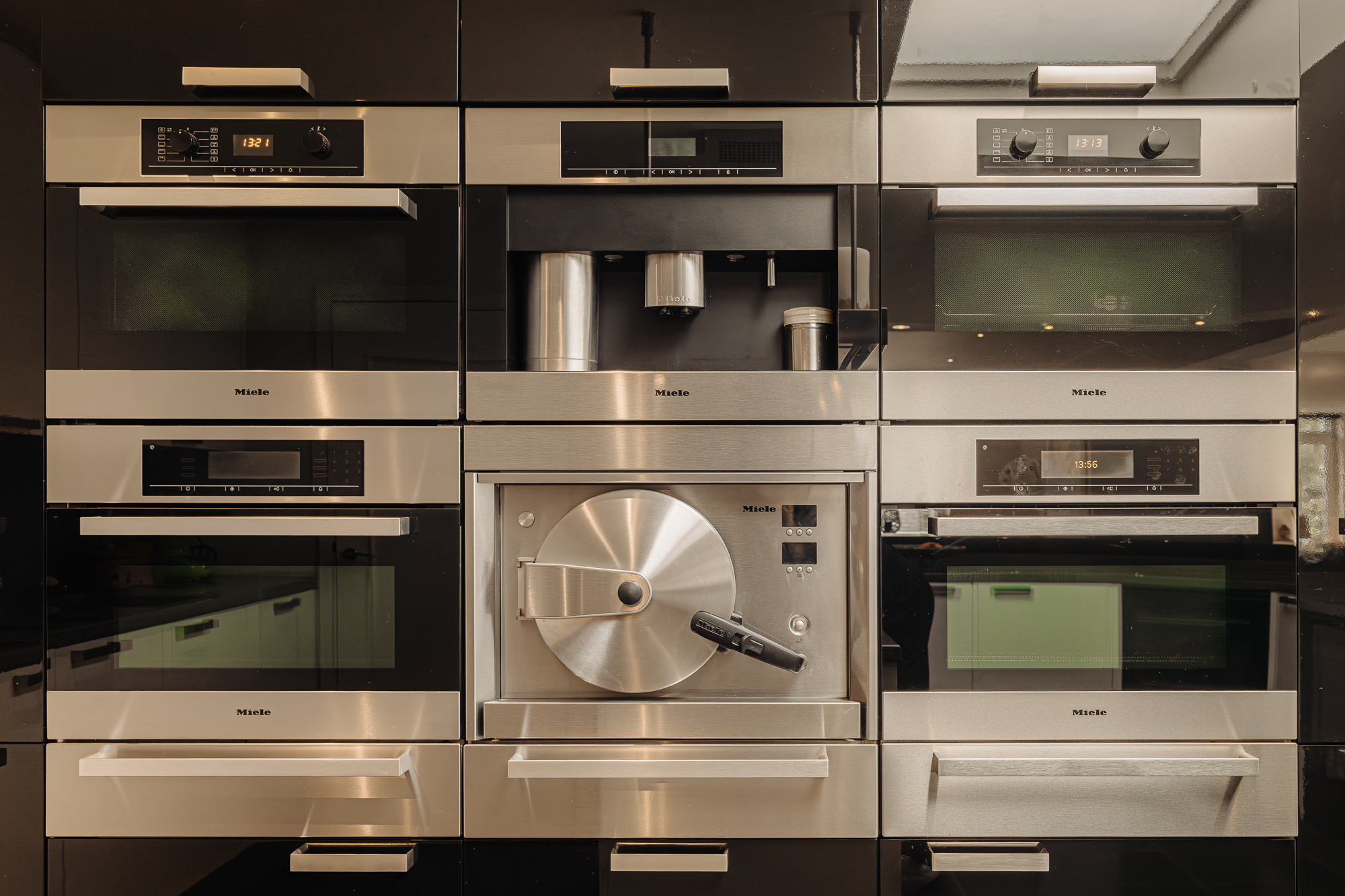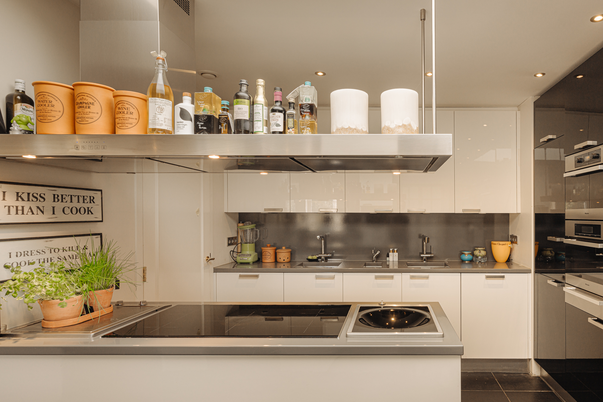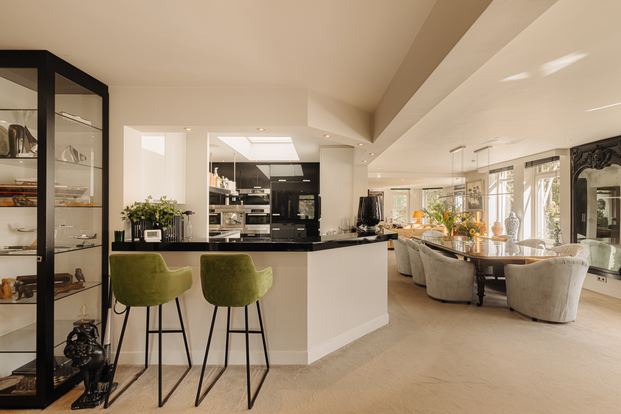 Spacious living room (three combined rooms) with a gas fireplace, large windows, and stunning views. Two balconies surrounded by greenery. The semi-open designer kitchen features high-quality Miele appliances, including two ovens, wine coolers, and a large bar.