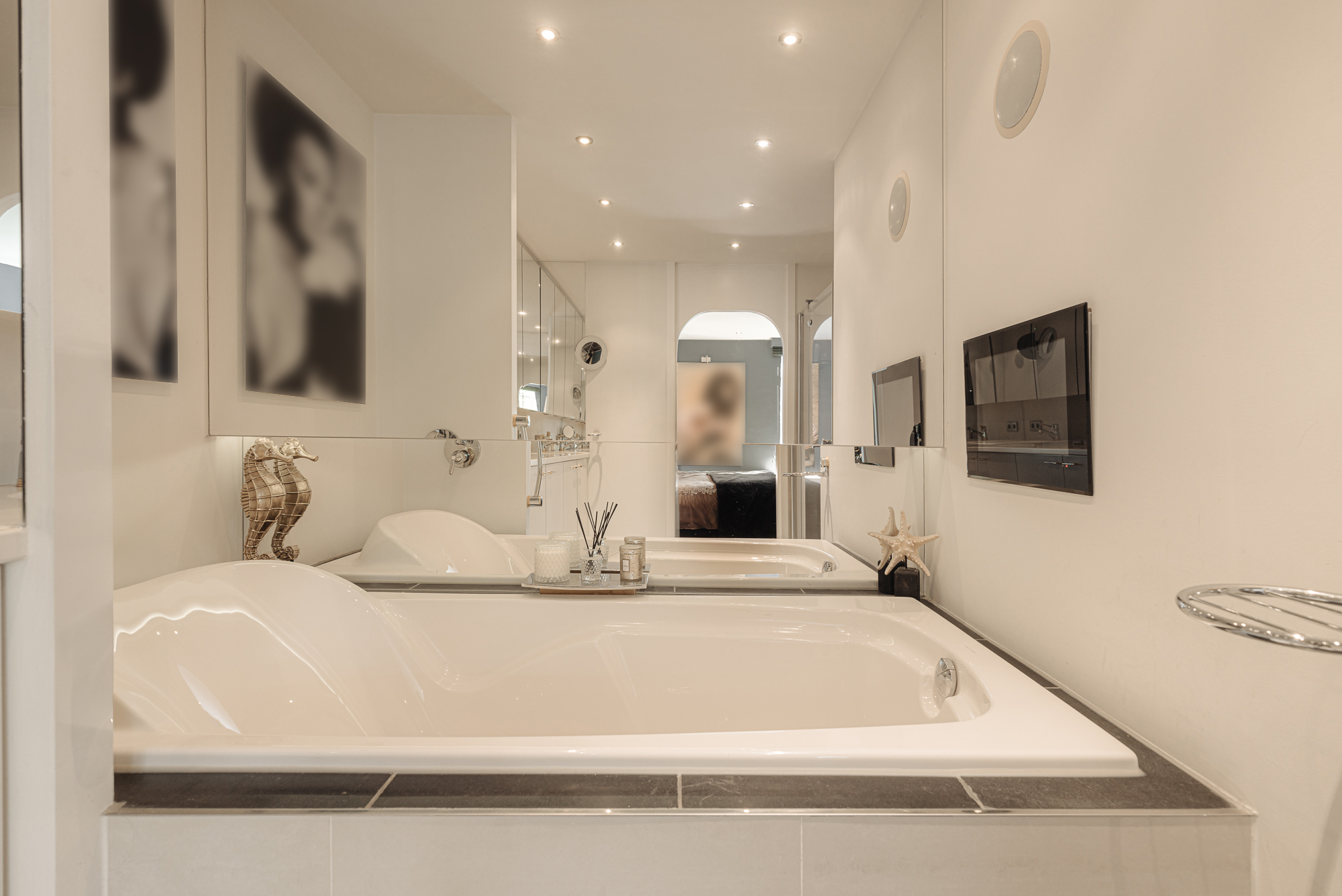 Master bedroom at the rear has an ensuite bathroom with a steam shower, spacious bathtub and double vanity. The second bedroom at the front also has its own bathroom.