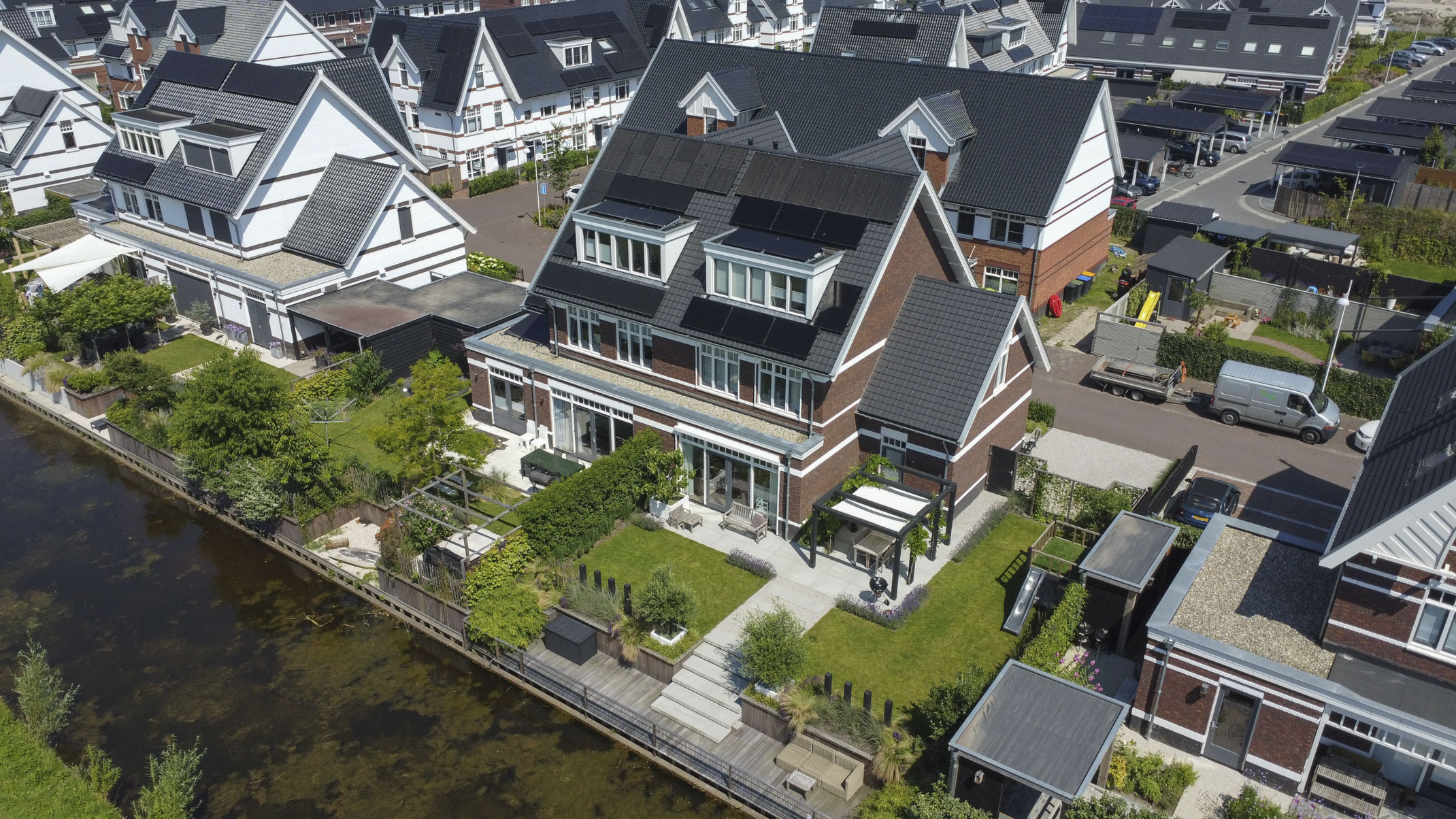 The sunny southwest-facing back garden is a true oasis, measuring over 15 meters wide and 8.5 meters deep. It is equipped with an irrigation system and a private jetty with direct access to navigable waters, allowing you to cruise onto the Gouw and, in the future, the River Vecht. The garden offers ample space to relax and enjoy the surroundings.