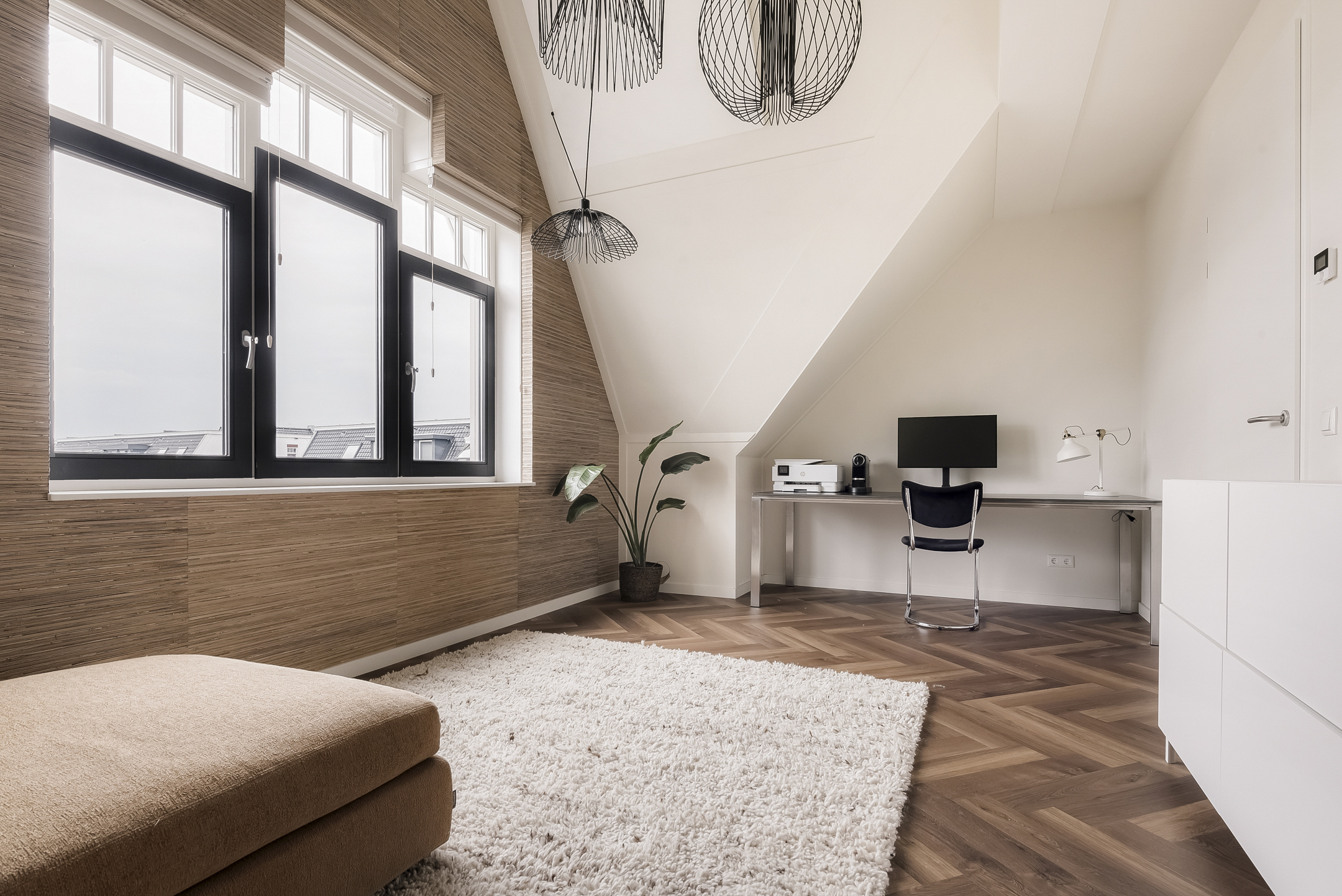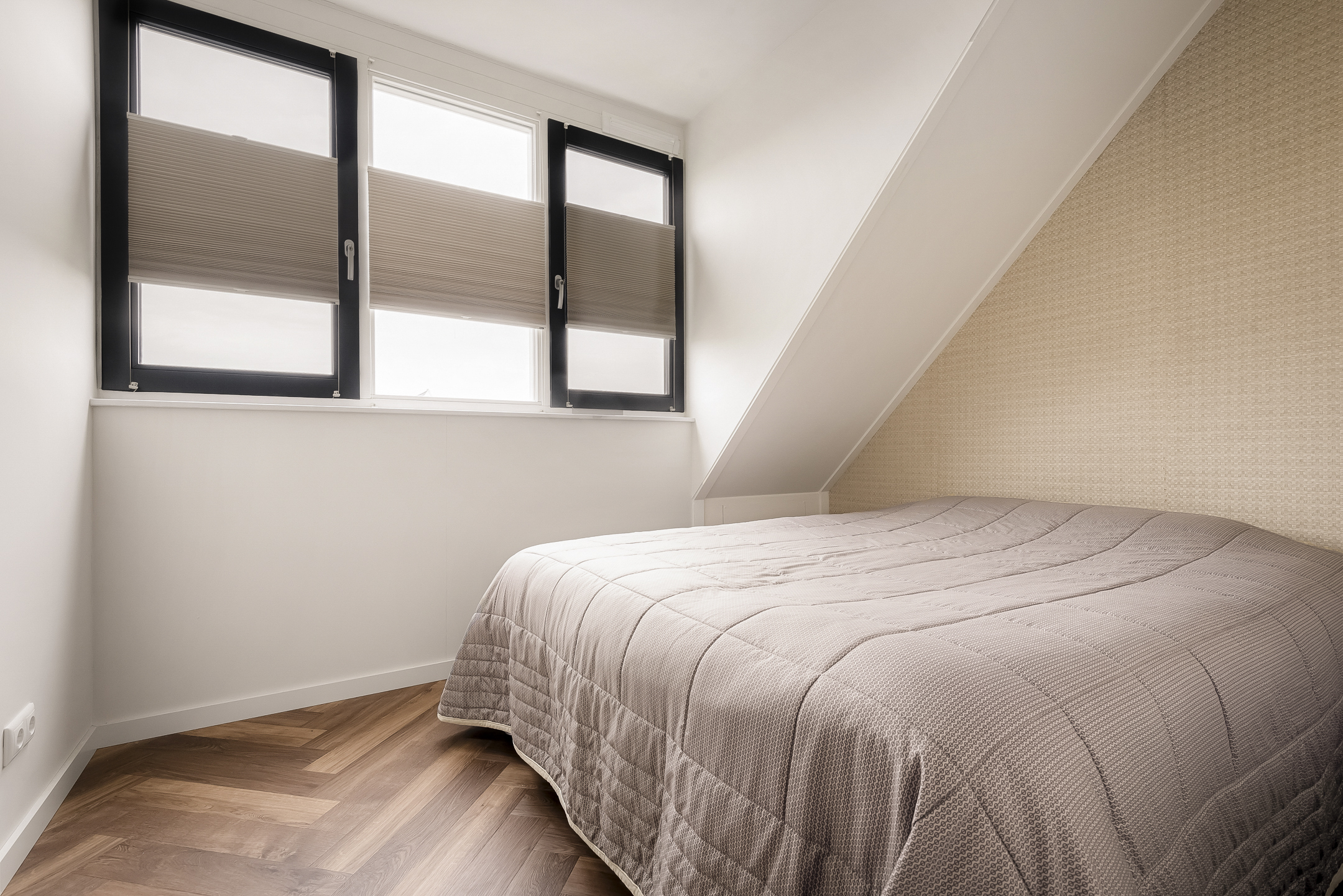 The front bedroom is particularly impressive due to its ceiling height of no less than 4.5 meters, giving the room a spacious and distinctive character. At the rear is the second bedroom, located next to the bathroom.