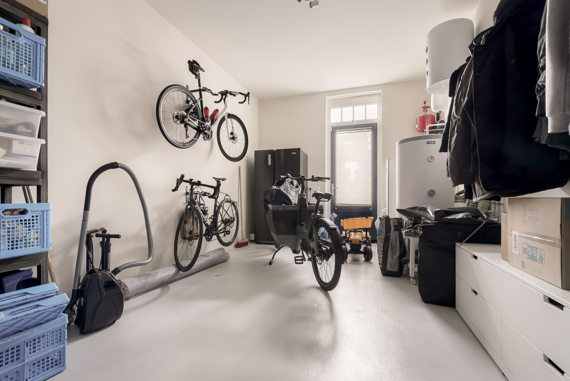 Upon arrival, the spacious front garden immediately stands out, featuring a private driveway with parking for two cars. The heated and insulated storage room, accessible through double doors, offers numerous possibilities such as storage or the creation of a home office or hobby space. From this storage room—where the heat pump and hot water boiler are also located—there is direct access to both the house and the back garden. This space can potentially be extended.