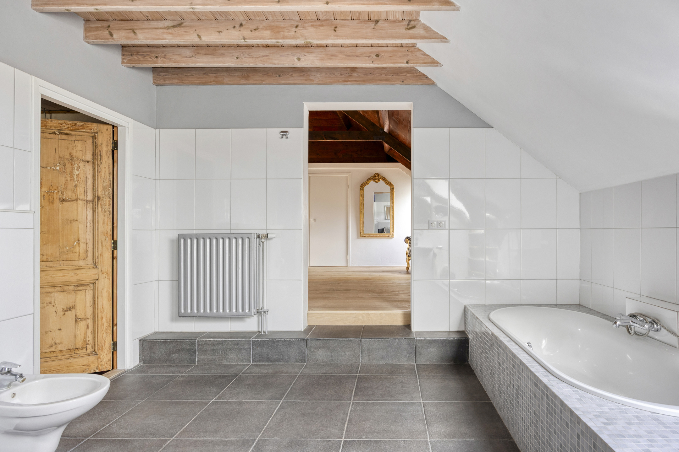 En-suite tiled bathroom with bathtub, shower cabin, second wall-mounted WC, bidet, double washbasin and underfloor heating controlled via the central heating system;