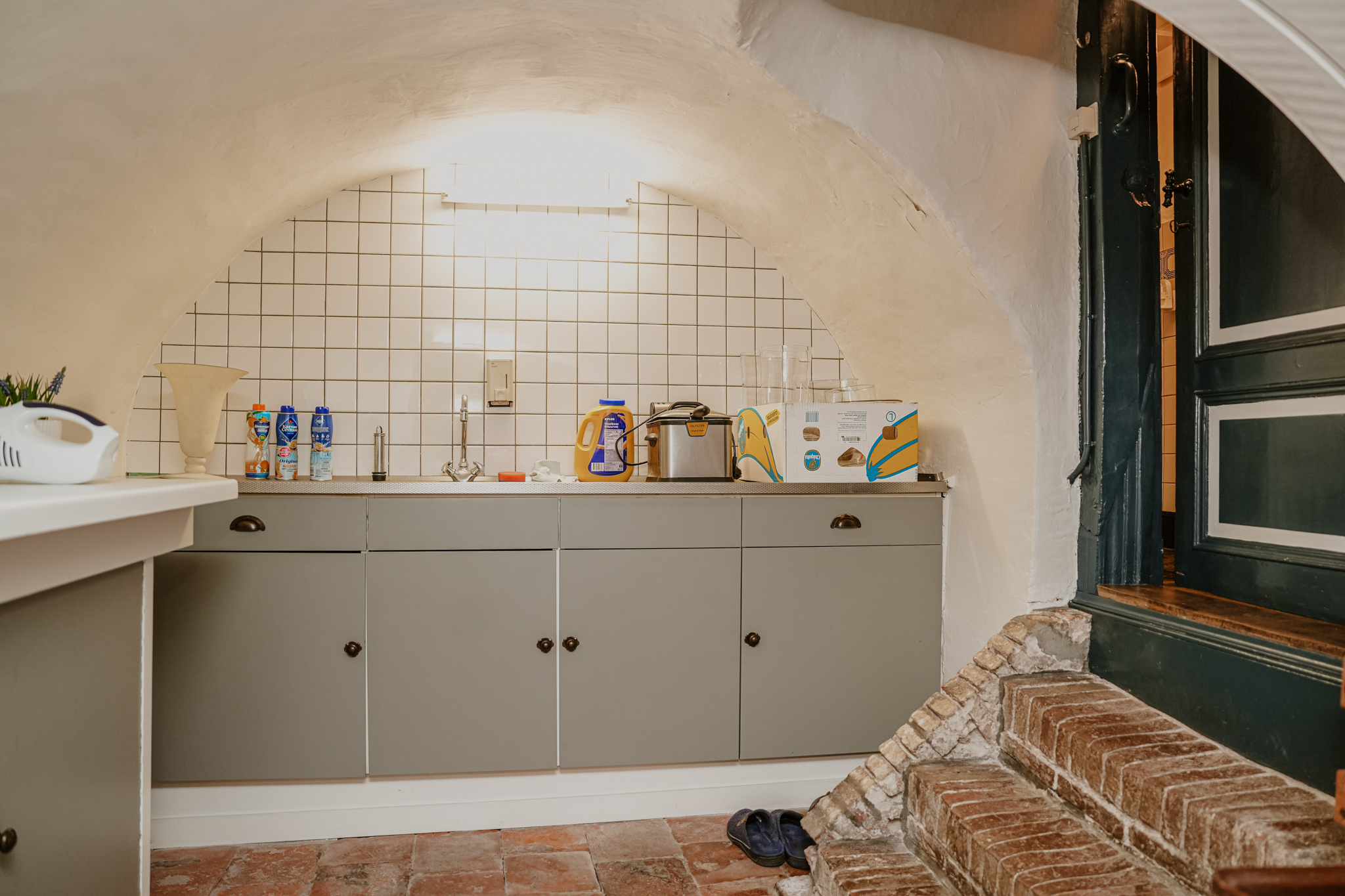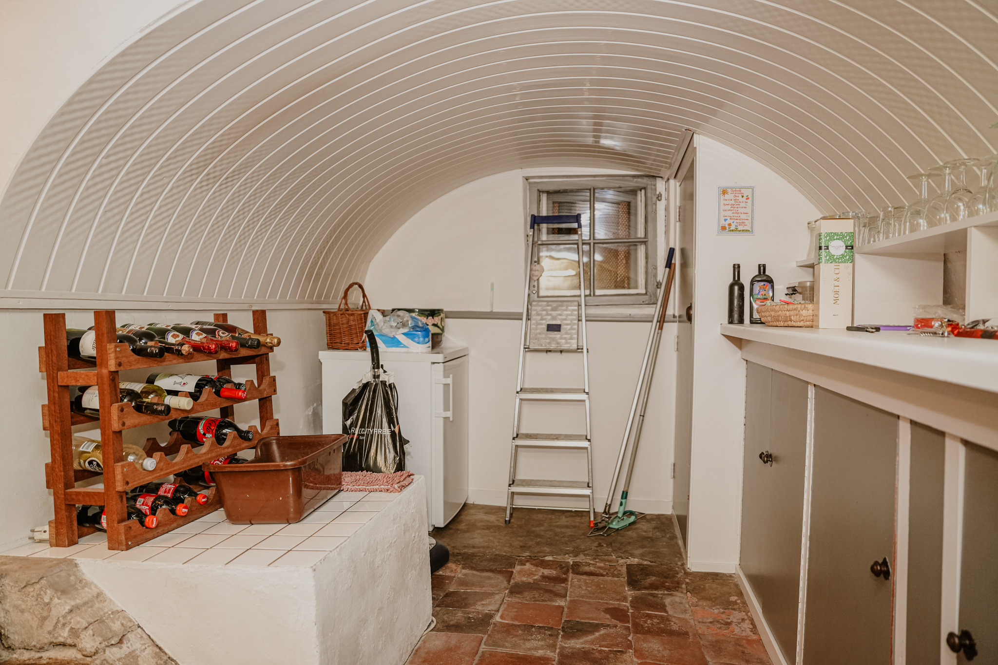 Adjoining the hallway are the cellar, utility room, and dining kitchen. A glass panel in the cellar floor reveals the historic water well below. The utility room occupies the former outdoor space of what was once the western house when the property consisted of two separate homes. The hallway retains the original 18th-century pump with a stone basin and brass taps. The dining kitchen is furnished with a classic kitchen unit featuring built-in appliances and a terrazzo countertop. From the kitchen, there is a pleasant view of the garden.