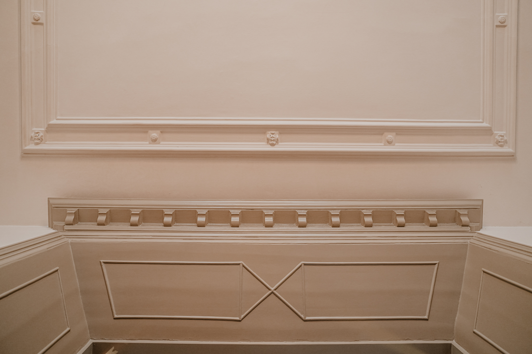 Large hallway, front room with high stucco ceiling, garden-facing rear room with fireplace, hallway, garden-facing dining kitchen, utility room, and pantry cellar on the ground floor