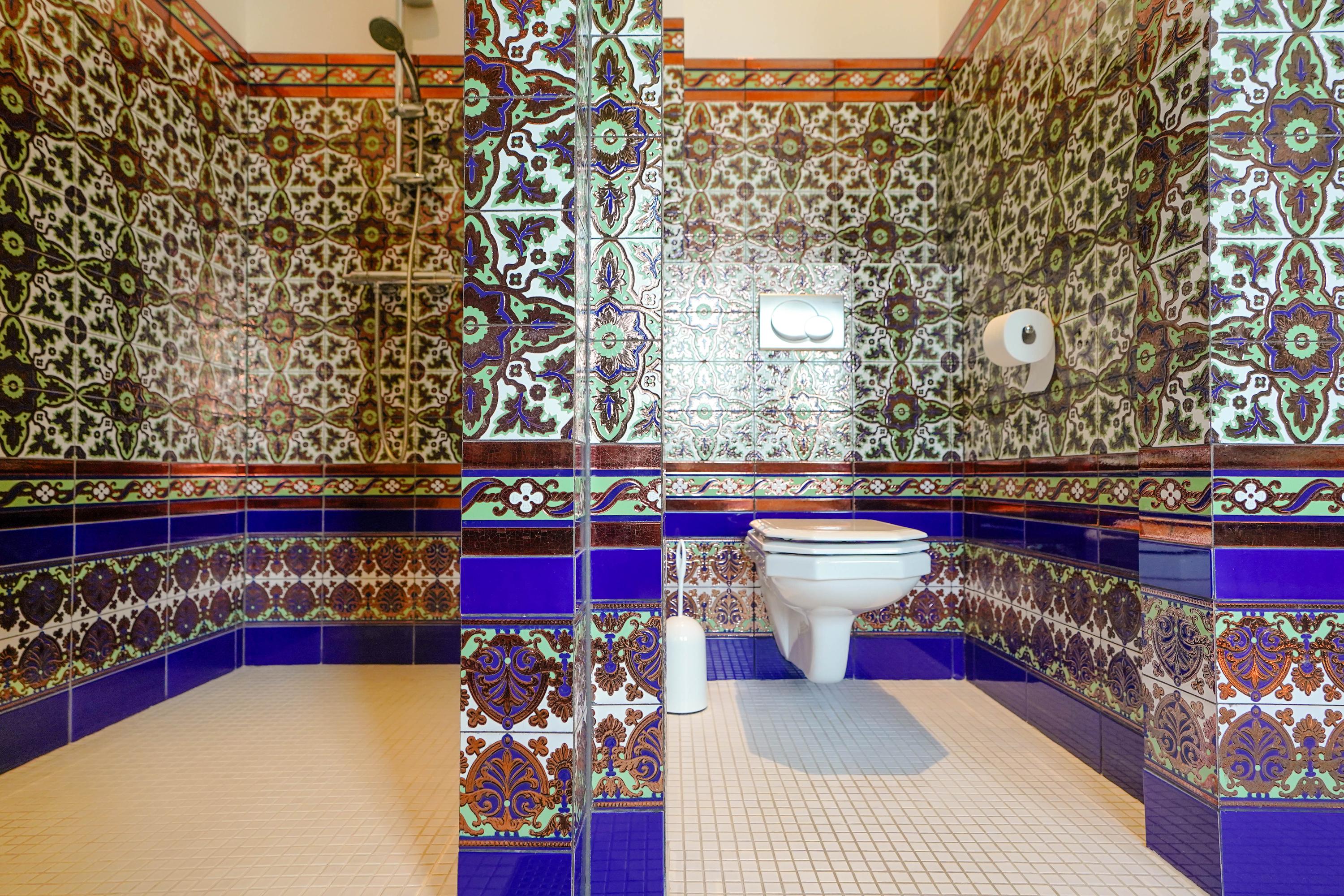 The luxurious bathroom is designed in Andalusian style and features a walk-in shower, jacuzzi bathtub, designer radiator, two Sphinx sinks, toilet, and matching Sphinx wall cabinets. The Andalusian wall tiles—meticulously laid in a patterned design—were imported from Mensaque Rodrigues, Triana/Seville, Spain.