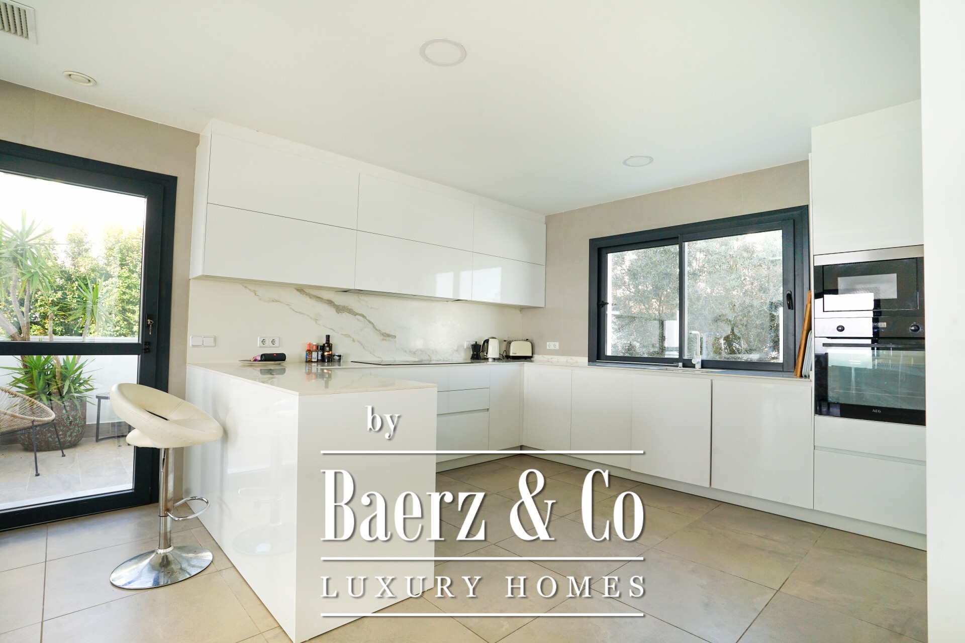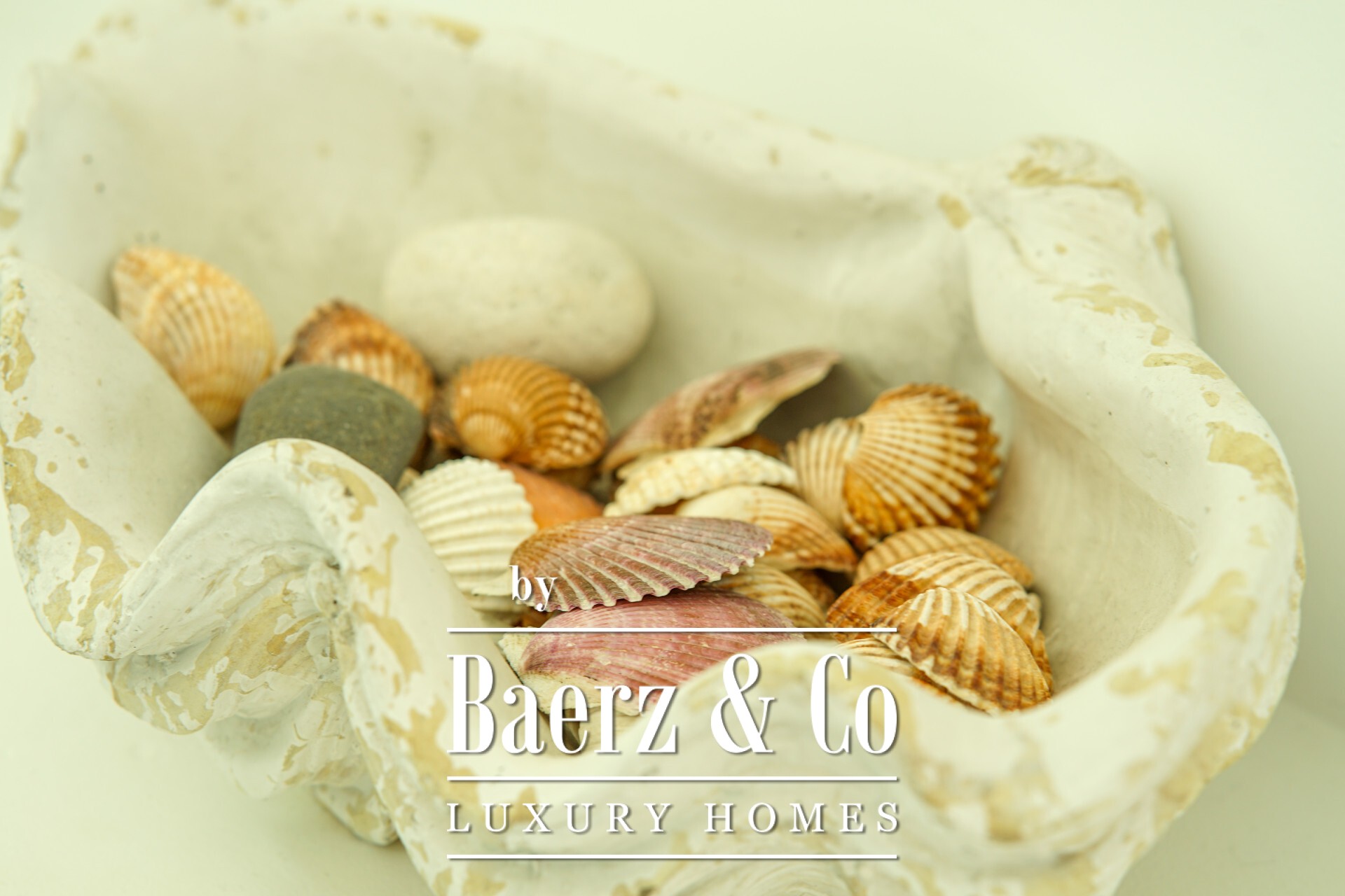 De belangrijkste leefruimtes zijn open en verbonden, met kamerhoge glaspartijen die de royale lounge en eetruimte verbinden met overdekte buitenzones. Een elegante, volledig uitgeruste keuken met hoogwaardige apparatuur grenst aan een buitenbarbecue, terwijl een aparte tv-kamer, privé gym, stoombad en kantoor bijdragen aan optimaal wooncomfort. Vier slaapkamers en vijf badkamers, waarvan drie en suite, bieden flexibiliteit en privacy; het kantoor kan eenvoudig als vijfde suite dienen.