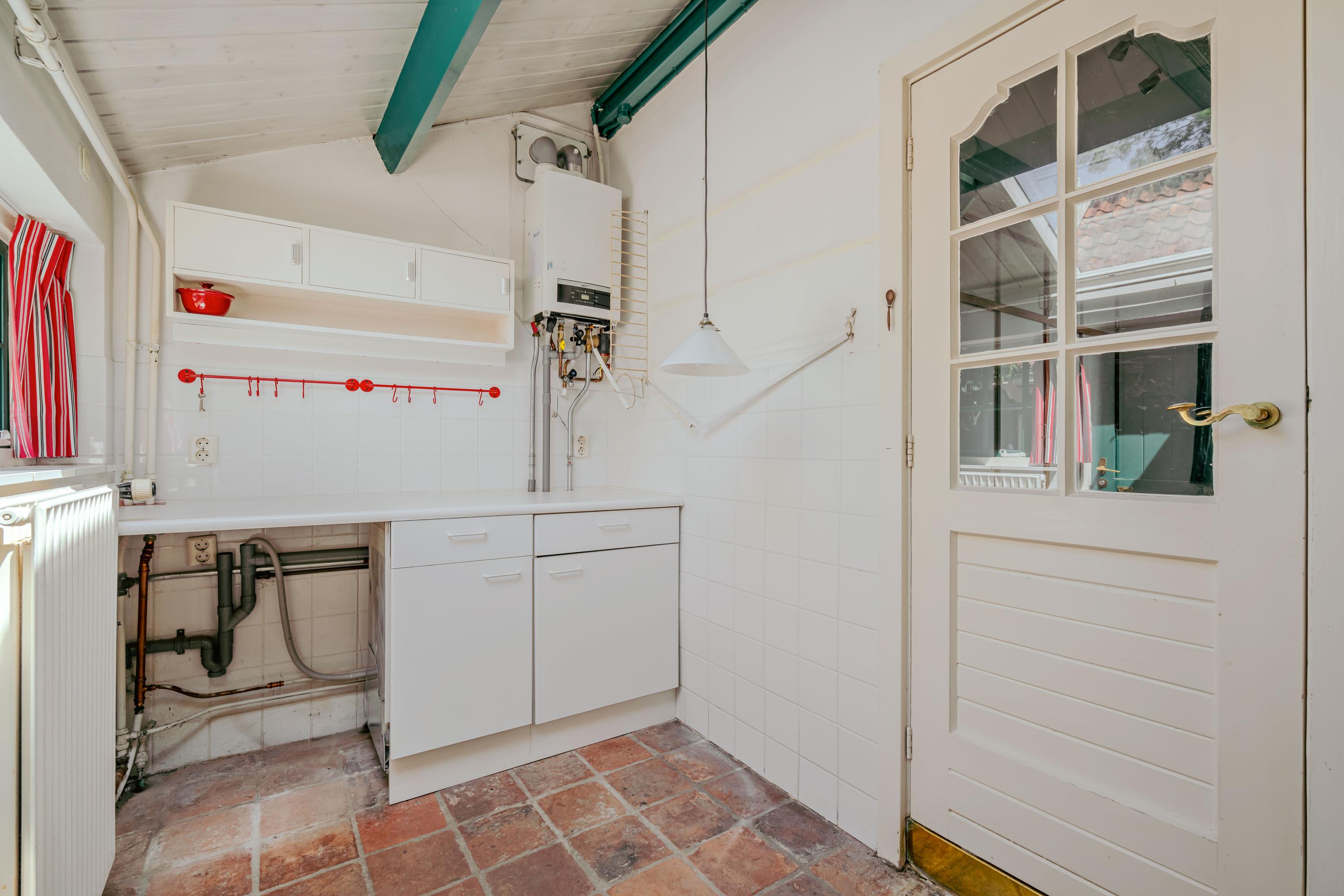 Vanaf de binnenplaats is het woonhuis toegankelijk via twee deuren. De linker deur leidt naar de keuken, waar veel daglicht binnenvalt via dakramen. De keuken is uitgerust met een spoelbak, vier gaspitten, een oven en diverse kasten en lades. Hier bevinden zich ook de cv-ketel en wasmachineaansluiting. Aansluitend ligt de woon- en eetkamer aan de voorzijde van de woning. Deze ruimte heeft houten balken, vaste kasten en ramen met uitzicht op het groen. De haard, houten afwerking en het zicht op de dijk geven de kamer een warme uitstraling. Via de hal met dakraam bereikt u het separate toilet met fonteintje en de badkamer met ligbad, douche en wastafelmeubel.