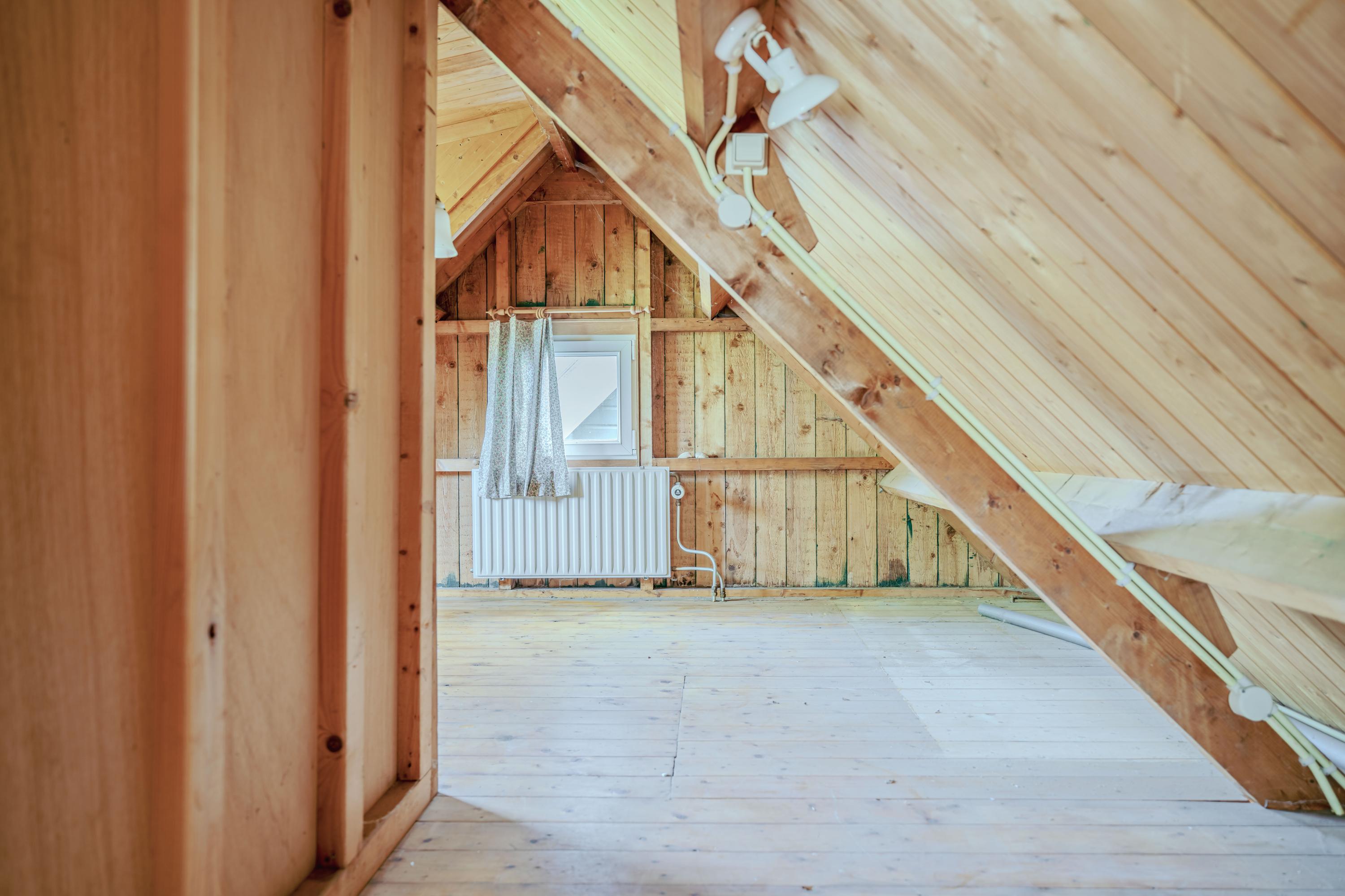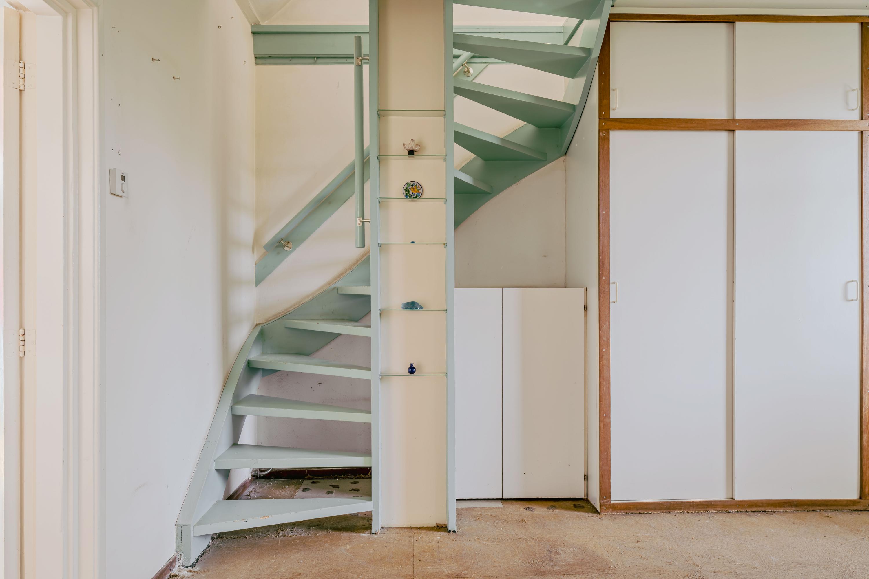 Een houten draaitrap leidt naar de verdieping, met een overloop en een ruime slaapkamer die de volledige etage beslaat. De kamer biedt uitzicht over de Amstel en het omliggende landschap. Onder de schuine daken zijn praktische bergruimtes gecreëerd. Aan de voorzijde bevindt zich een zitje in de raamnis met zicht op de rivier.