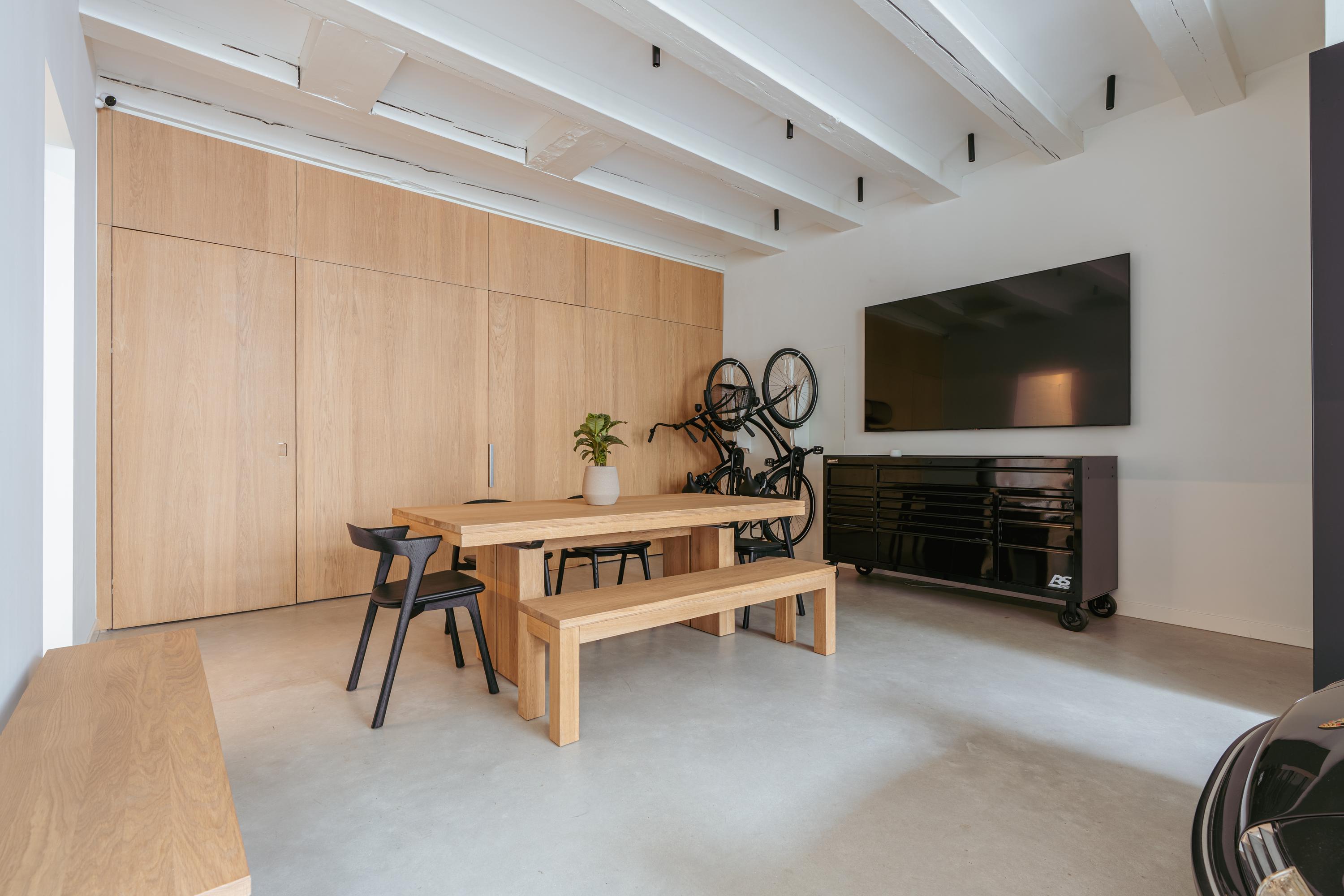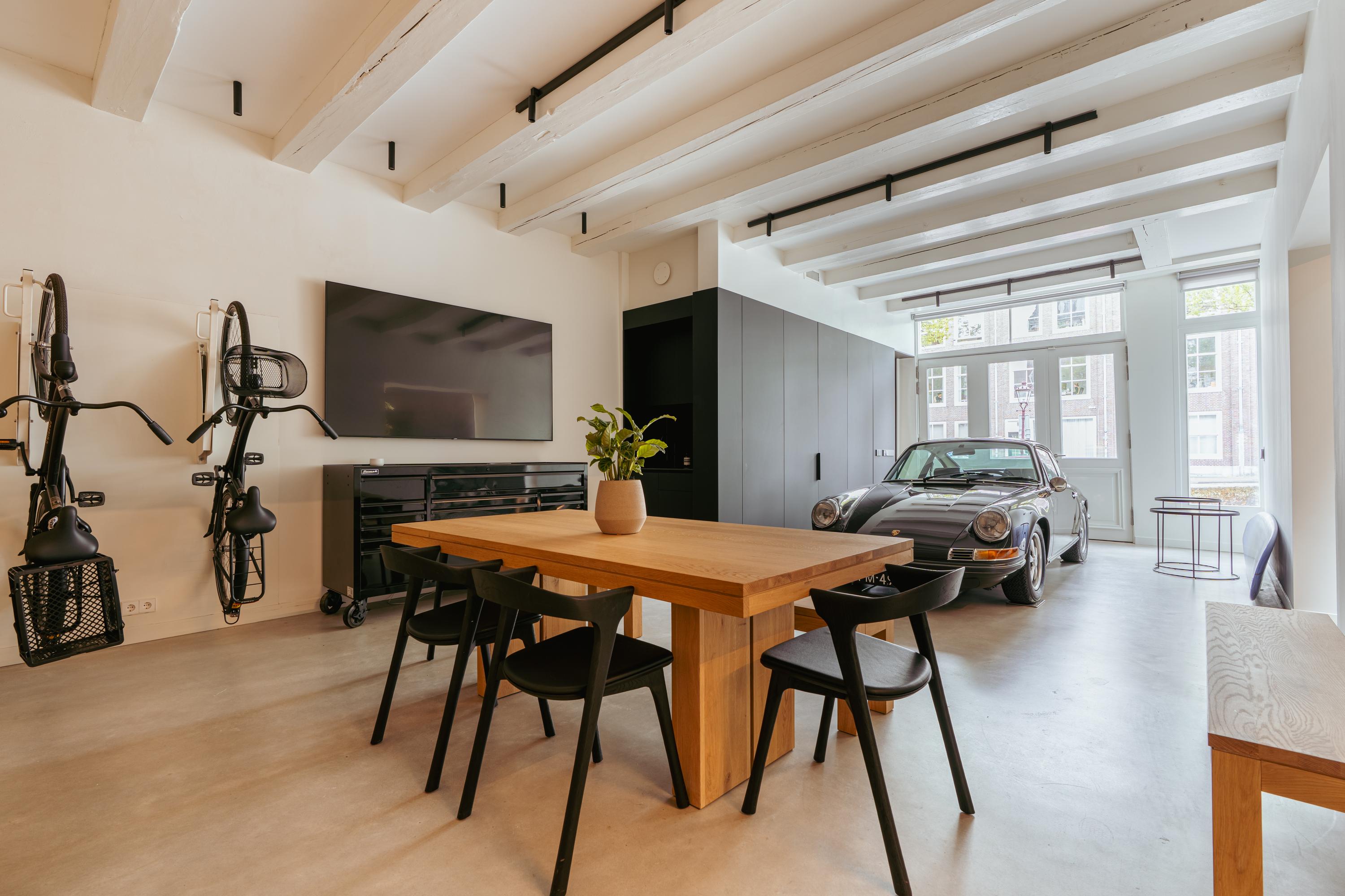 De entree van het pand biedt toegang tot zowel de woning als de multifunctionele bedrijfsruimte op de begane grond. Deze ruimte is met oog voor detail afgewerkt en ademt karakter dankzij de houten elementen, zichtbare plafondbalken en hoogwaardige materialen. Grote openslaande deuren aan de voorzijde maken het mogelijk om de volledige gevel te openen, wat zorgt voor een uitnodigende uitstraling en veel natuurlijk licht. Binnen is de ruimte praktisch en stijlvol ingedeeld. Een compacte maar luxe uitgevoerde kitchenette, een keurig toilet en een aparte was- en technische ruimte maken deze verdieping compleet. Een groot dakraam aan de achterzijde laat overvloedig daglicht binnen en geeft de ruimte een open en lichte sfeer. U heeft aan de achterzijde tevens toegang tot een buitenruimte. Daarnaast is er een tweede toegangsdeur vanaf de straatzijde, wat extra flexibiliteit biedt voor gebruik als praktijkruimte, atelier of kantoor aan huis.