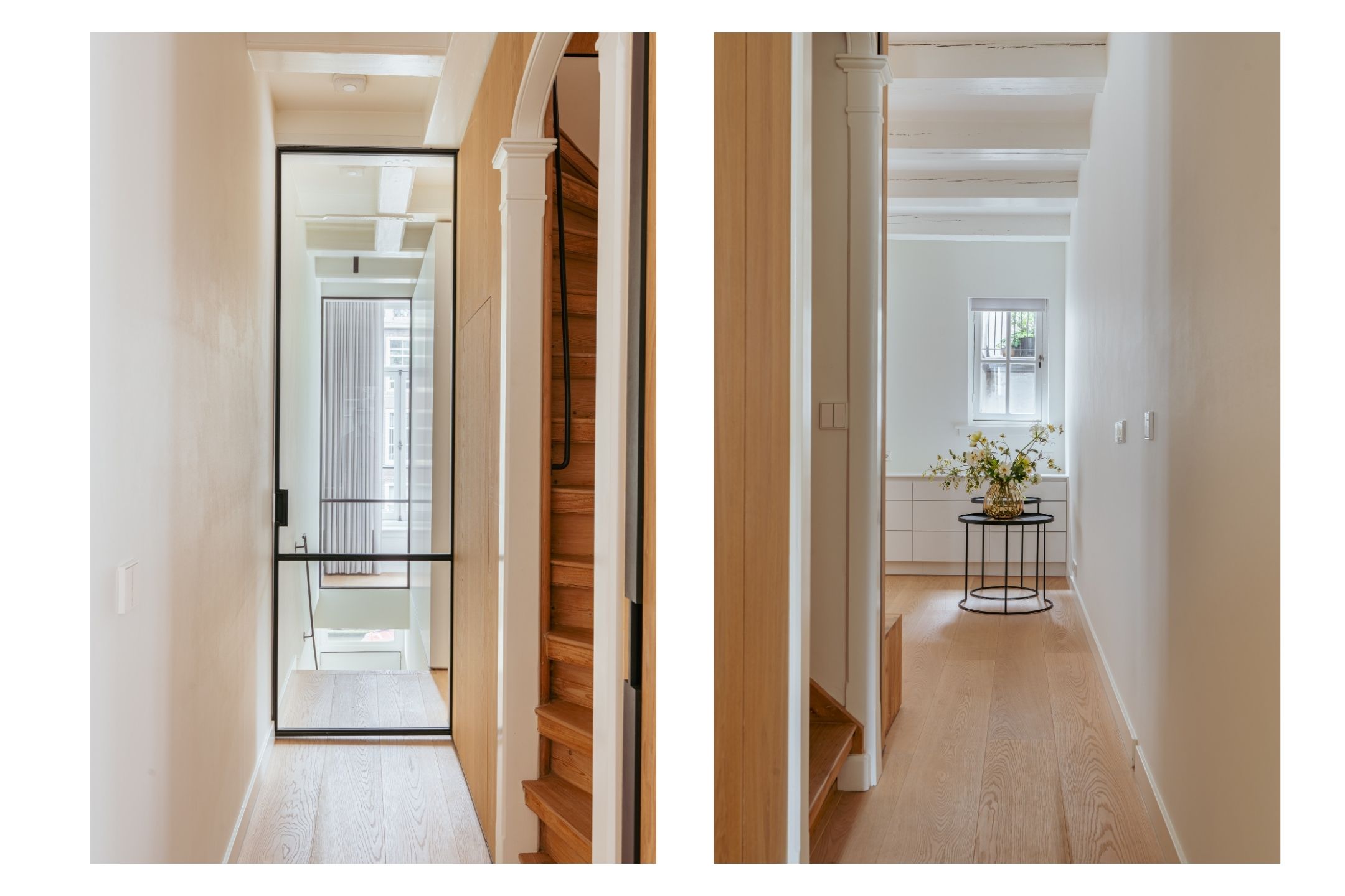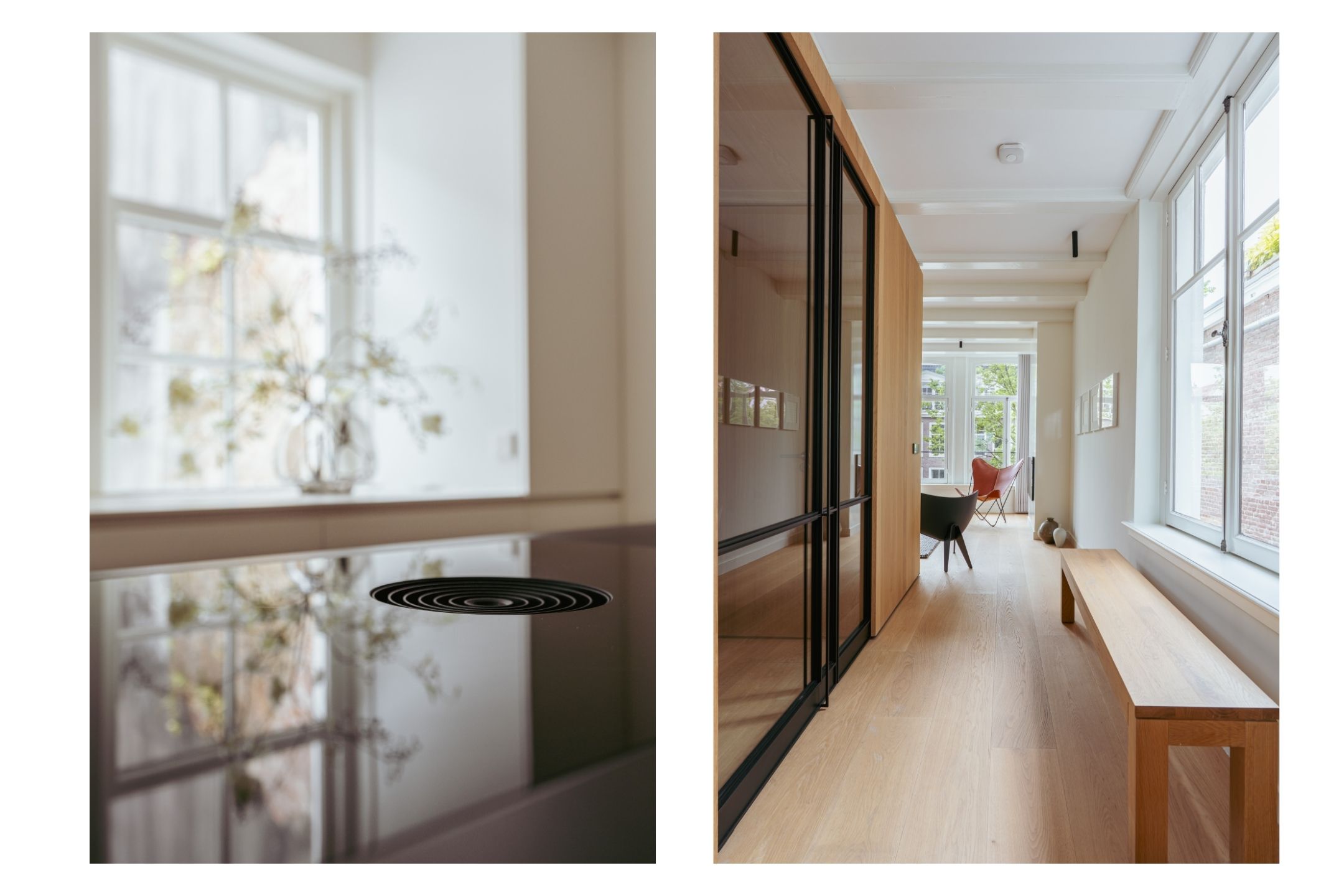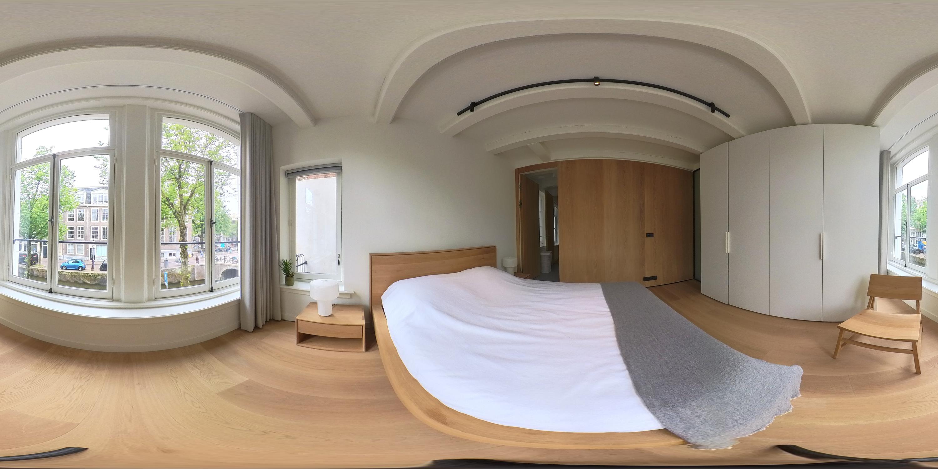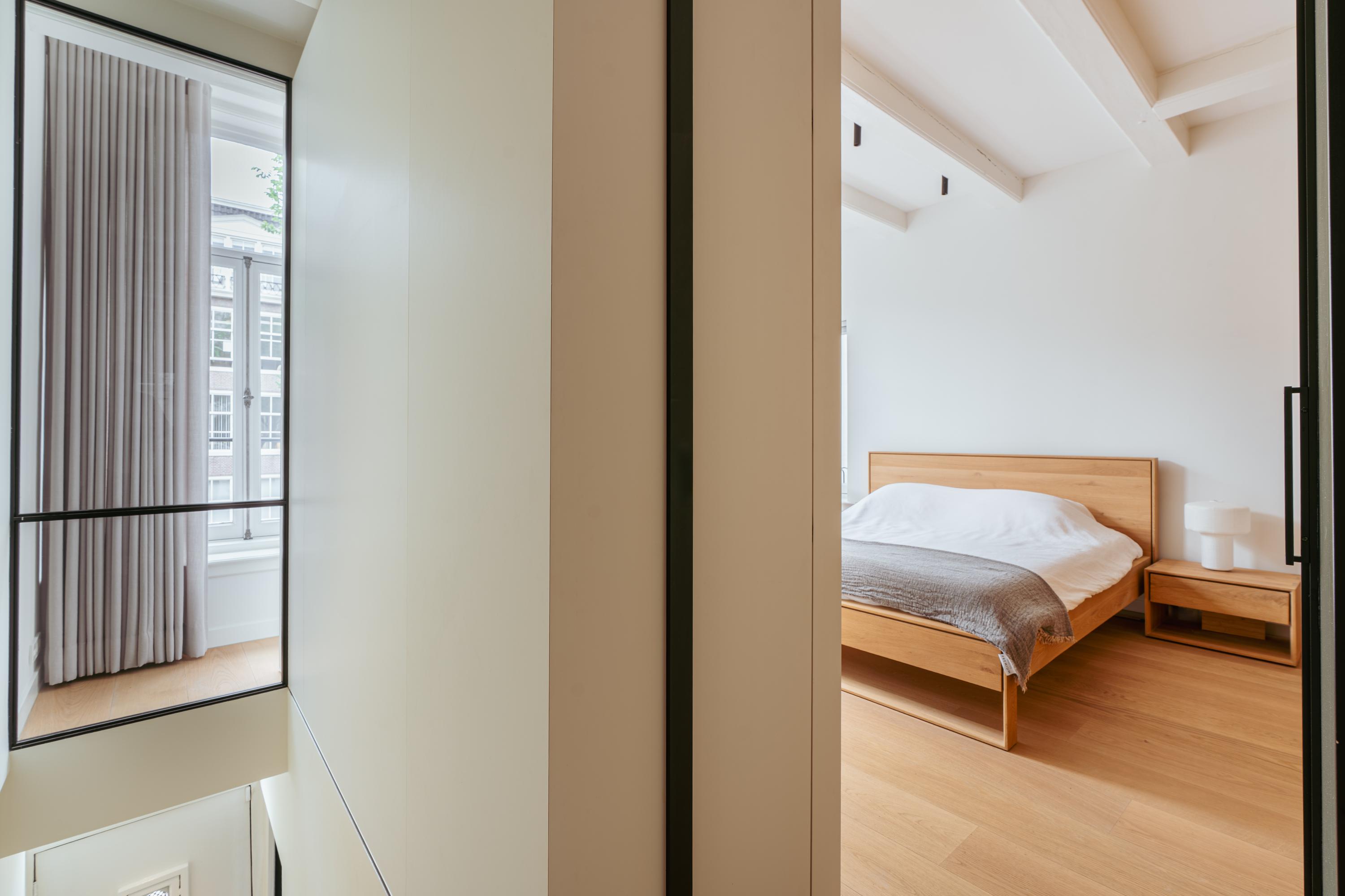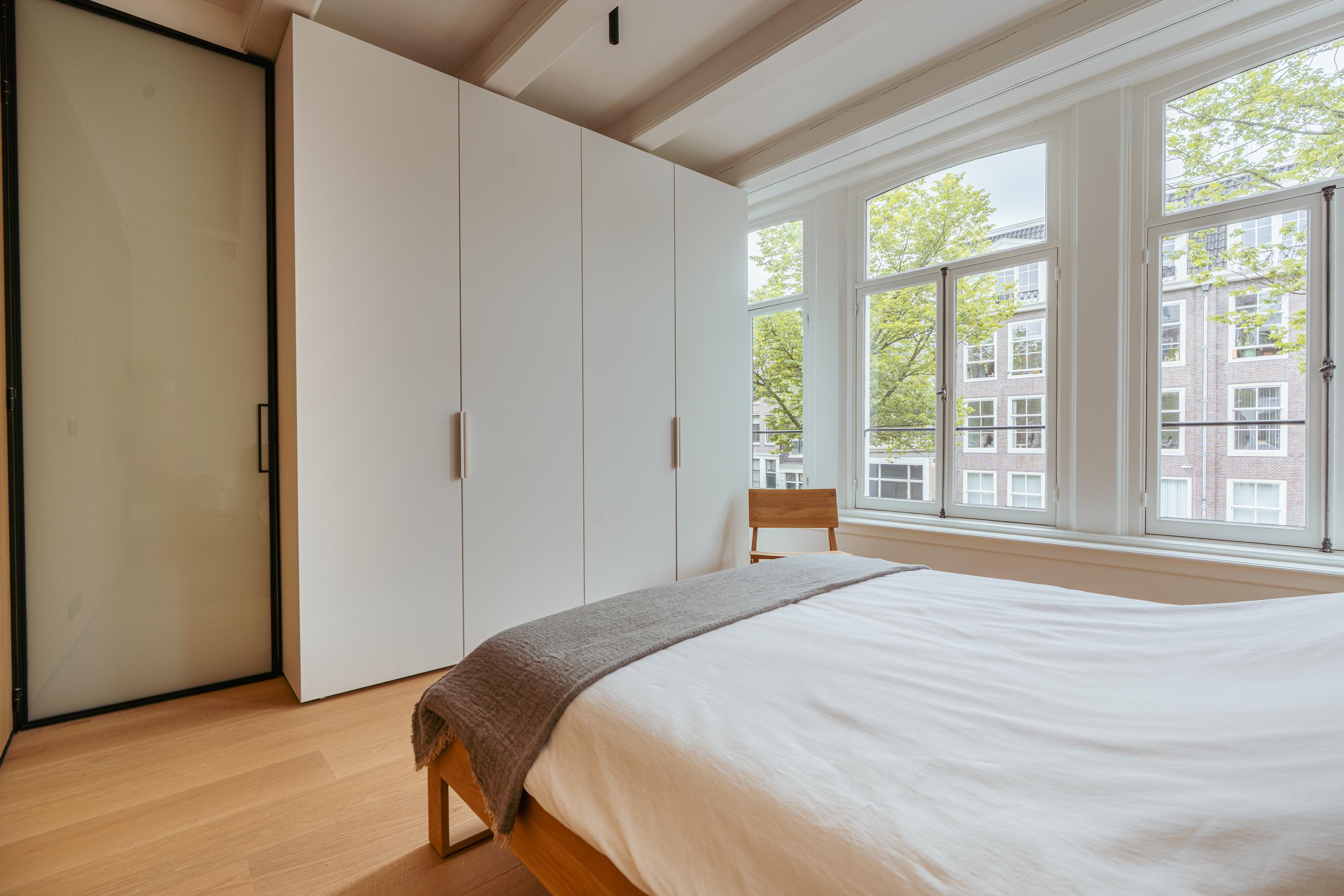 Via een nette overloop met ingebouwde opbergruimte bereikt u de beide slaapkamers. Deze verdieping is afgewerkt met een prachtige houten vloer en hoogwaardige materialen. Aan de voorzijde bevindt zich een royale slaapkamer met een maatwerk kastenwand die naadloos is geïntegreerd in het ontwerp. Grote raampartijen zorgen hier voor een overvloed aan natuurlijk licht en bieden een prachtig uitzicht op de gracht en de historische gevels van de stad. De tweede ruime slaapkamer, gelegen aan de achterzijde van de woning, beschikt eveneens over een ingebouwde kastenwand. Centraal op deze verdieping bevindt zich de modern uitgevoerde badkamer. Deze is uitgerust met een ruime inloopdouche, een strak wastafelmeubel en een stijlvol toilet, allemaal in een luxe en tijdloze afwerking. Wat deze verdieping extra bijzonder maakt, zijn de elegante stalen deuren waarmee beide slaapkamers stijlvol kunnen worden afgesloten – een combinatie van design en functionaliteit die perfect aansluit bij de rest van het interieur.