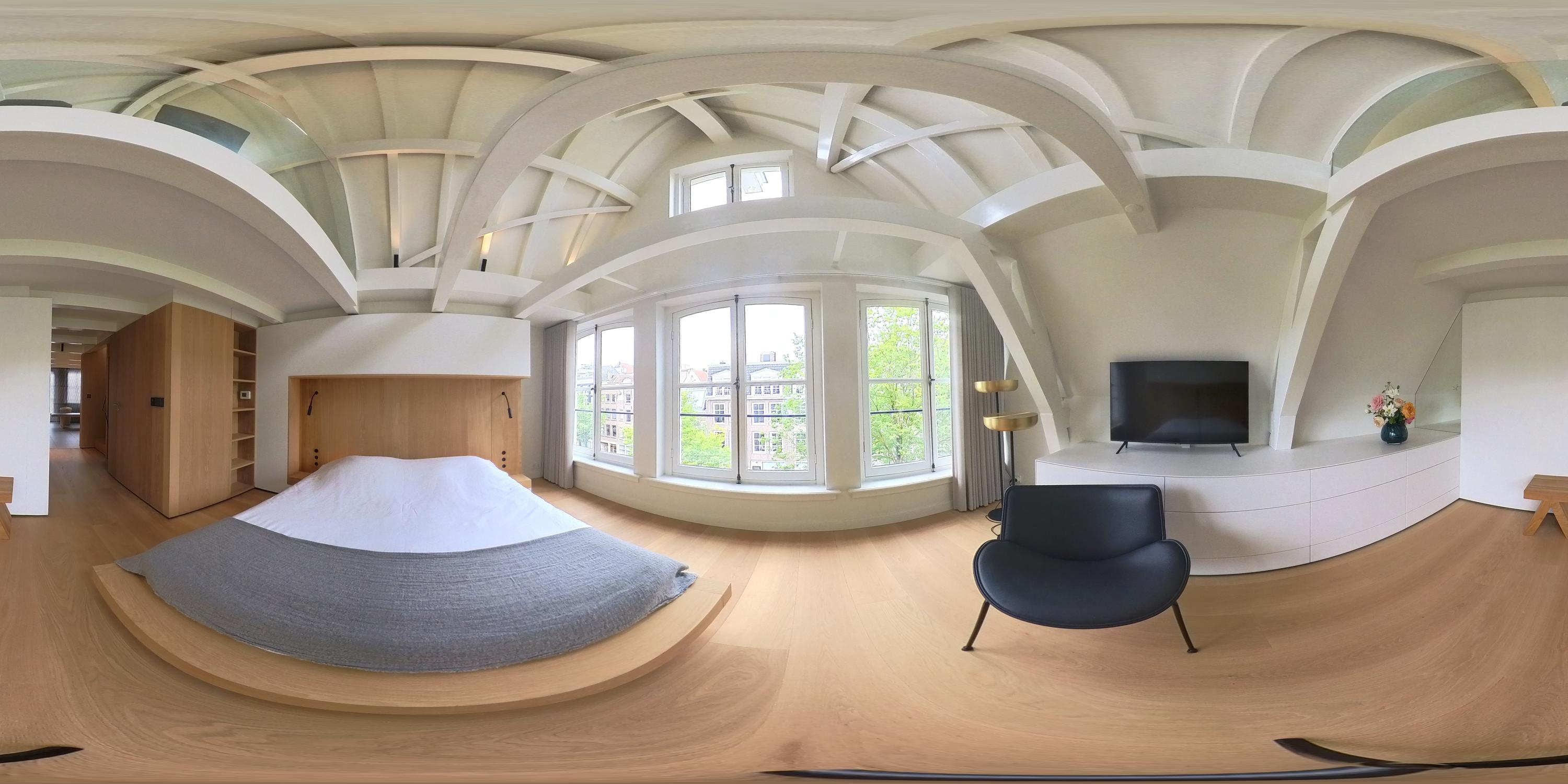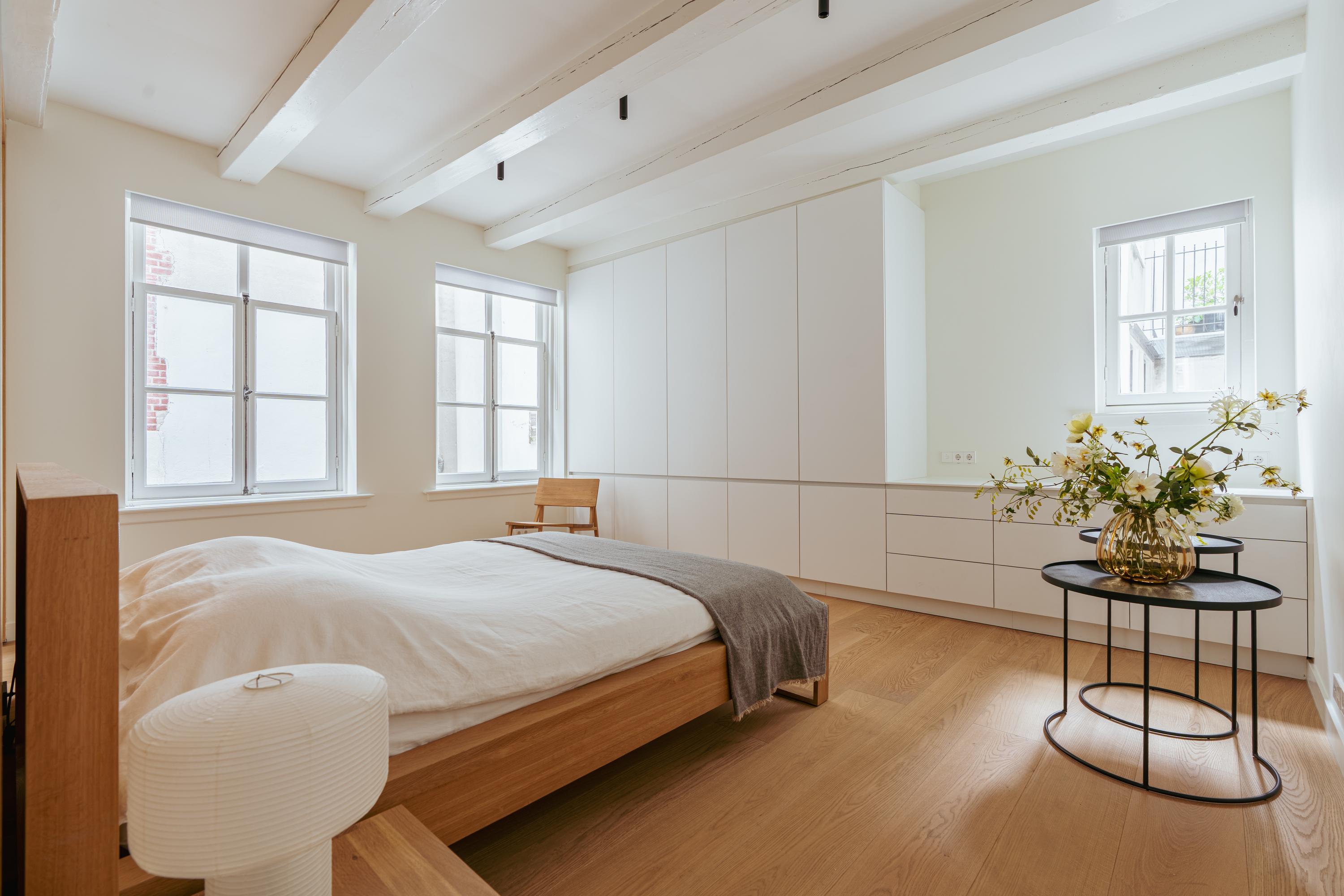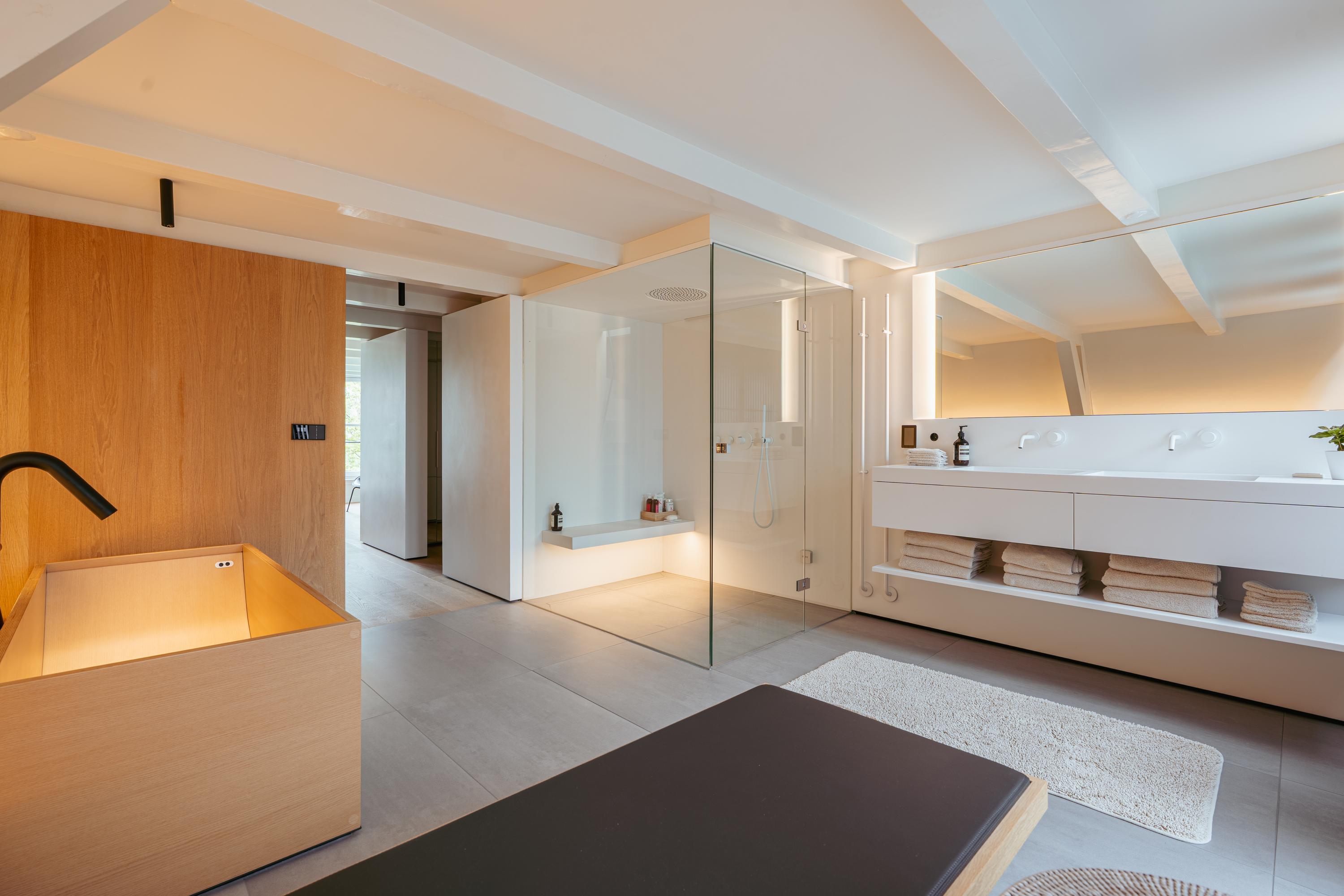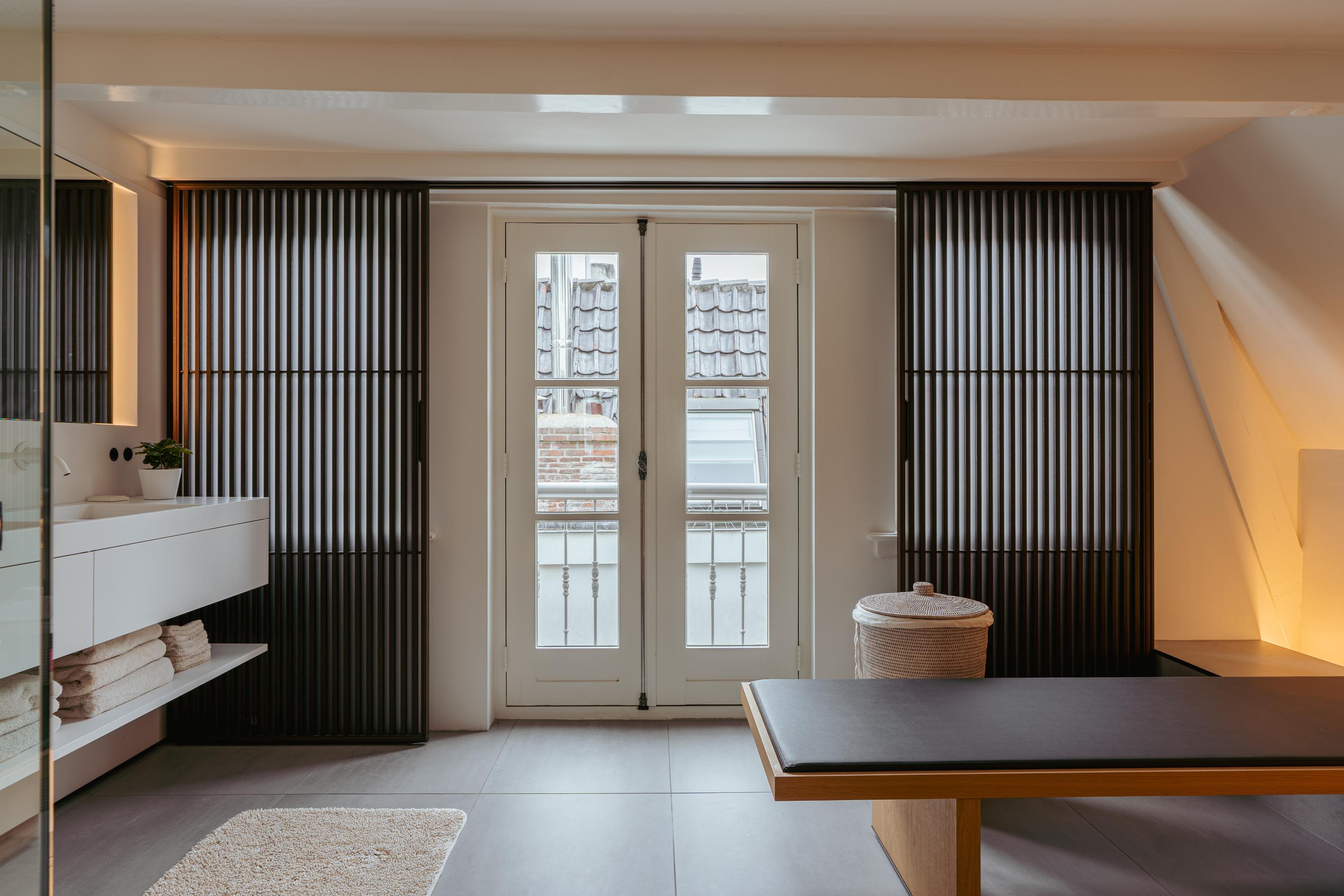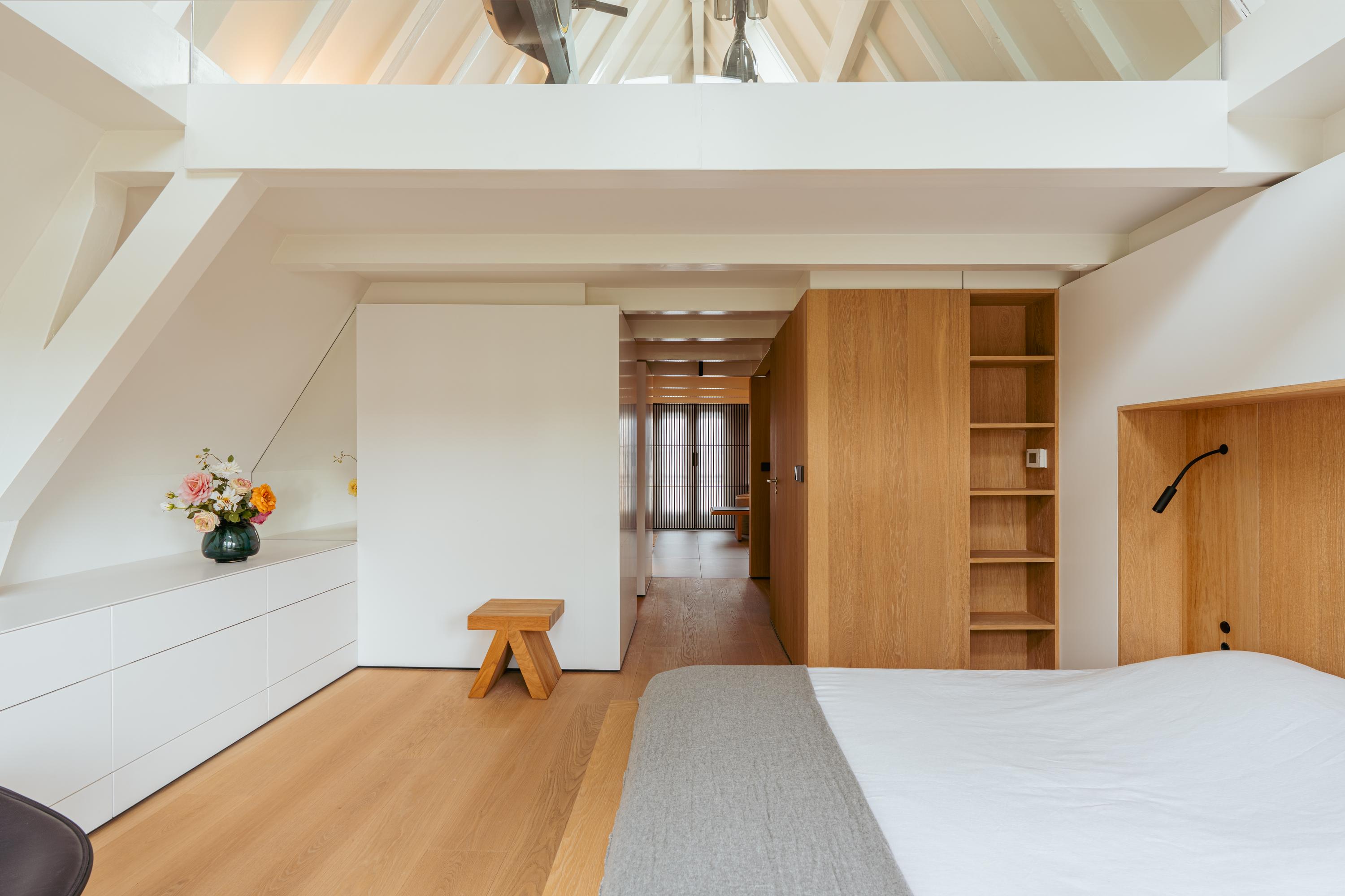De bovenste verdieping van het pand is volledig ingericht als exclusieve master bedroom – een stijlvolle oase van rust, ruimte en comfort. Centraal op deze etage bevindt zich een ruime walk-in closet, voorzien van op maat gemaakte kasten die niet alleen praktisch zijn, maar ook bijdragen aan de serene uitstraling van de ruimte. Aan de voorzijde vindt u de sfeervolle slaapkamer, waar authentieke plafondbalken en een indrukwekkende nokhoogte direct in het oog springen. Hoge ramen tot in de nok zorgen voor een overvloed aan natuurlijk licht en versterken het gevoel van openheid en ruimte. Ook hier zorgen ingebouwde kastenwanden voor een strak en opgeruimd geheel. Aan de achterzijde ligt de luxueus uitgevoerde badkamer, een ware wellnessruimte in eigen huis. Hier treft u een elegant vrijstaand Agape Spoon Woodline ligbad als eye-catcher, een dubbele wastafel met stijlvol meubel, een bijzonder royale inloopdouche, stoomcabine én een ingebouwd ligbed voor ultieme ontspanning. De ruimte is afgewerkt met warme materialen en doordachte details, waaronder ingebouwde verlichting die een gevoel van hotel-luxe oproept. Prachtige houten schuifpanelen dienen zowel als zonwering als sfeervol designelement en zorgen voor privacy zonder het daglicht buiten te sluiten. Het toilet is separaat gesitueerd.