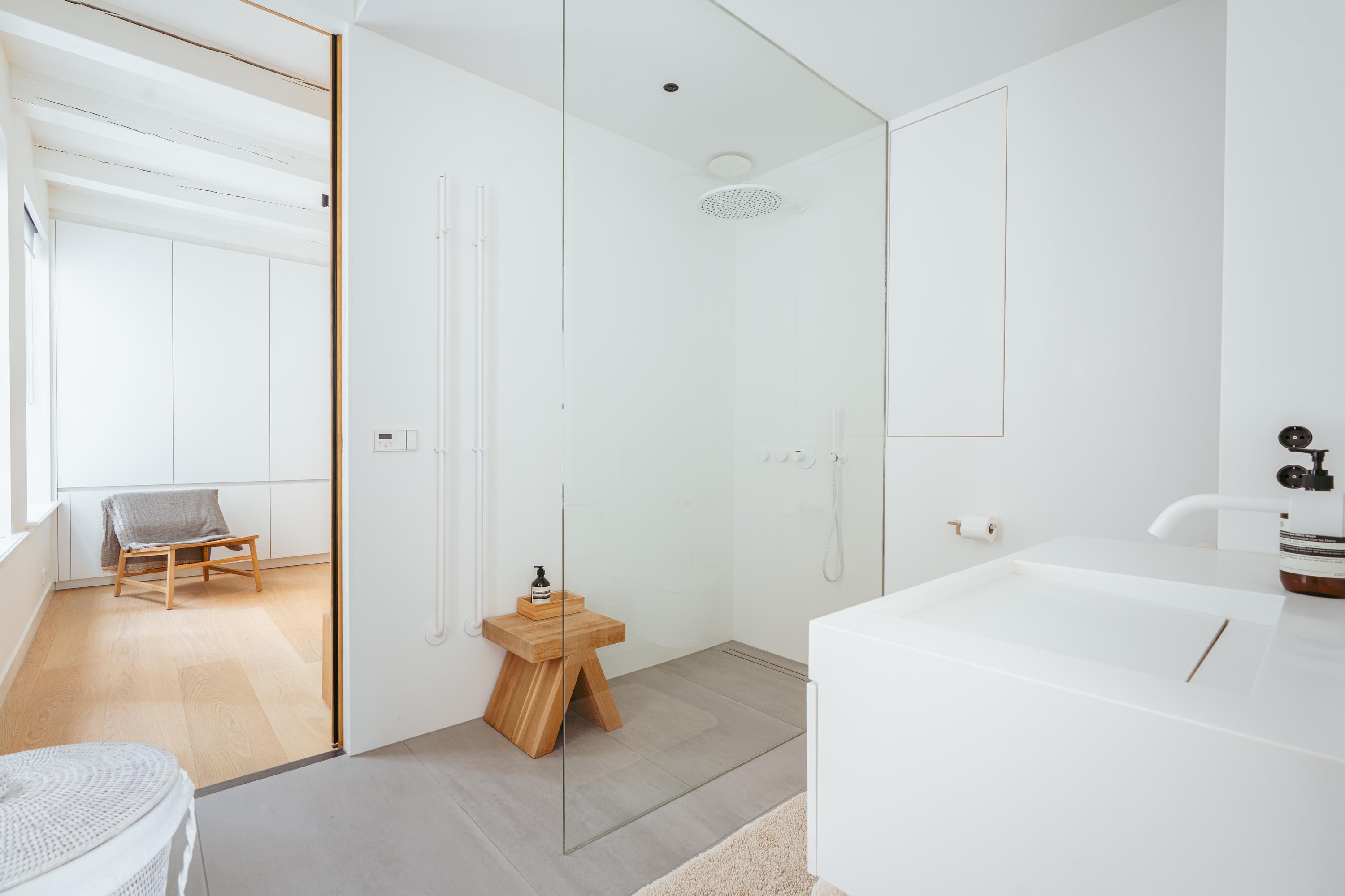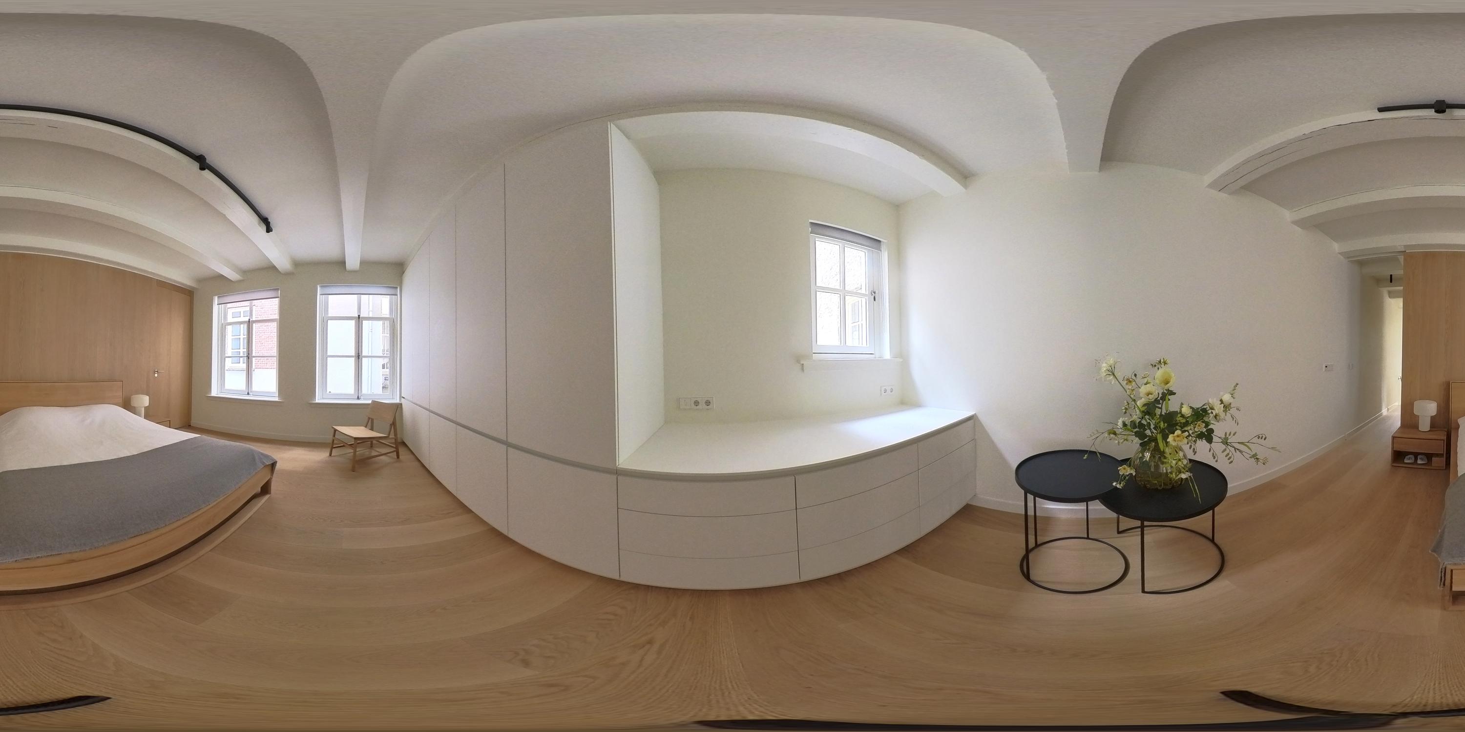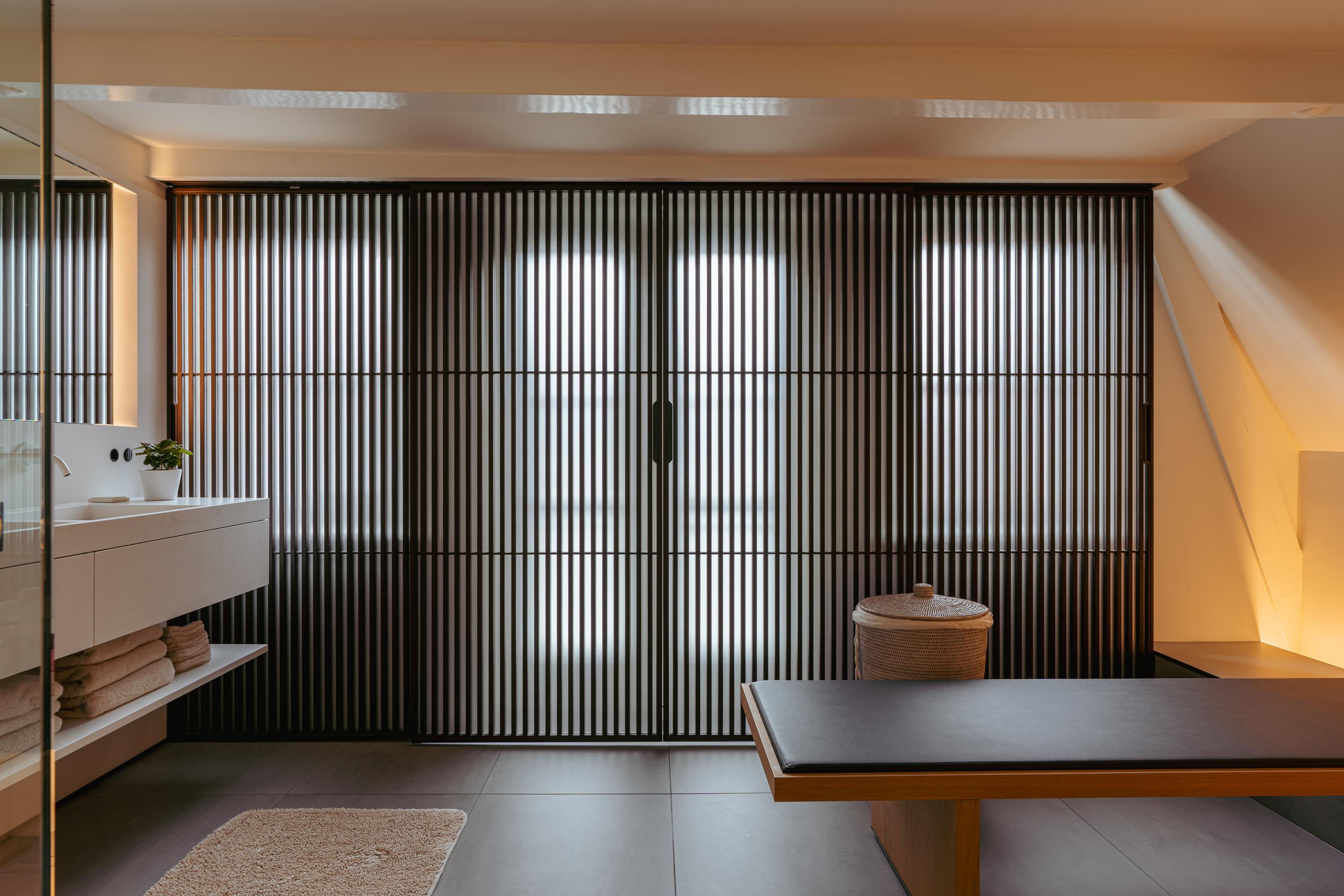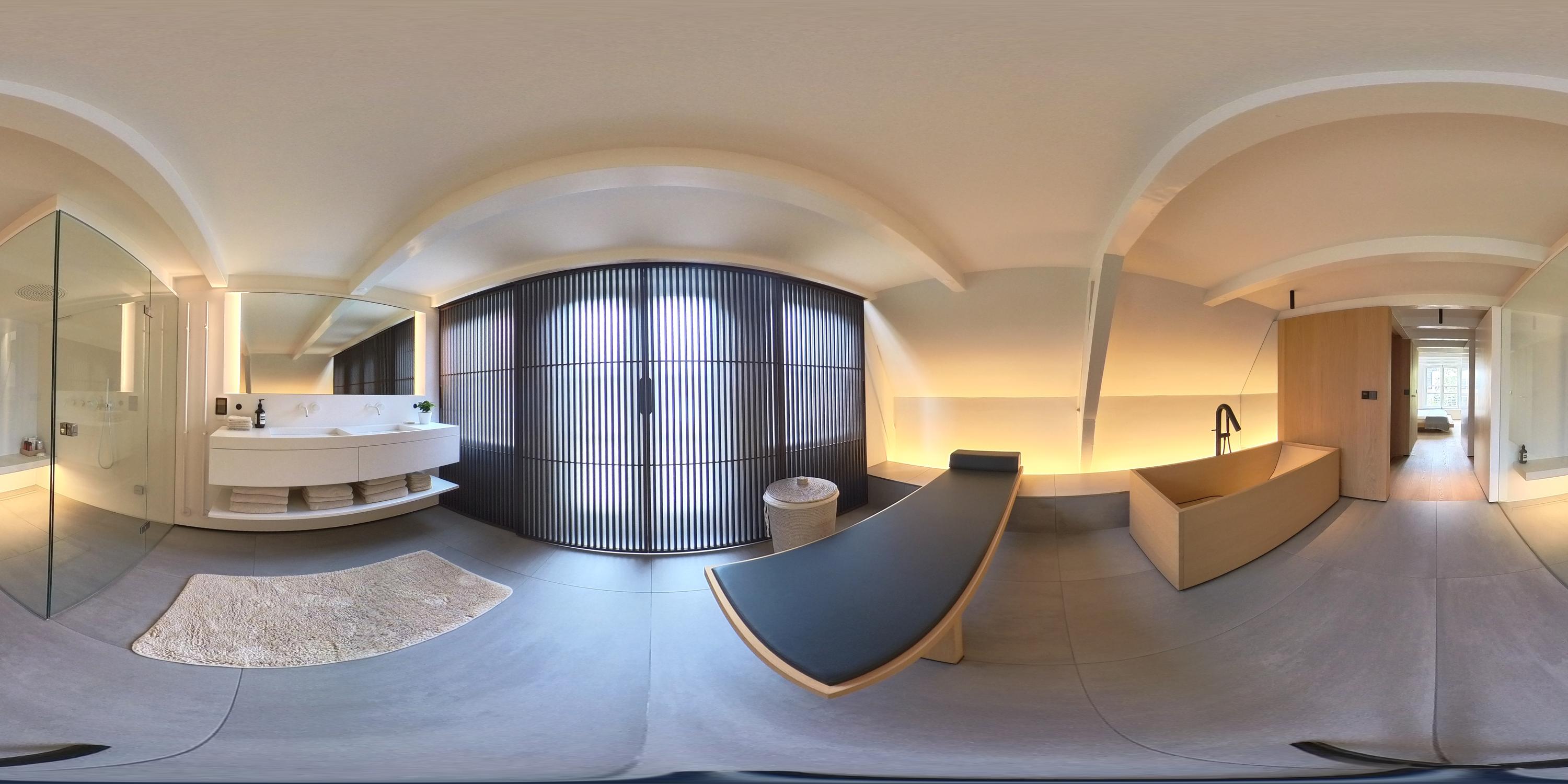 De bovenste verdieping van het pand is volledig ingericht als exclusieve master bedroom – een stijlvolle oase van rust, ruimte en comfort. Centraal op deze etage bevindt zich een ruime walk-in closet, voorzien van op maat gemaakte kasten die niet alleen praktisch zijn, maar ook bijdragen aan de serene uitstraling van de ruimte. Aan de voorzijde vindt u de sfeervolle slaapkamer, waar authentieke plafondbalken en een indrukwekkende nokhoogte direct in het oog springen. Hoge ramen tot in de nok zorgen voor een overvloed aan natuurlijk licht en versterken het gevoel van openheid en ruimte. Ook hier zorgen ingebouwde kastenwanden voor een strak en opgeruimd geheel. Aan de achterzijde ligt de luxueus uitgevoerde badkamer, een ware wellnessruimte in eigen huis. Hier treft u een elegant vrijstaand Agape Spoon Woodline ligbad als eye-catcher, een dubbele wastafel met stijlvol meubel, een bijzonder royale inloopdouche, stoomcabine én een ingebouwd ligbed voor ultieme ontspanning. De ruimte is afgewerkt met warme materialen en doordachte details, waaronder ingebouwde verlichting die een gevoel van hotel-luxe oproept. Prachtige houten schuifpanelen dienen zowel als zonwering als sfeervol designelement en zorgen voor privacy zonder het daglicht buiten te sluiten. Het toilet is separaat gesitueerd.