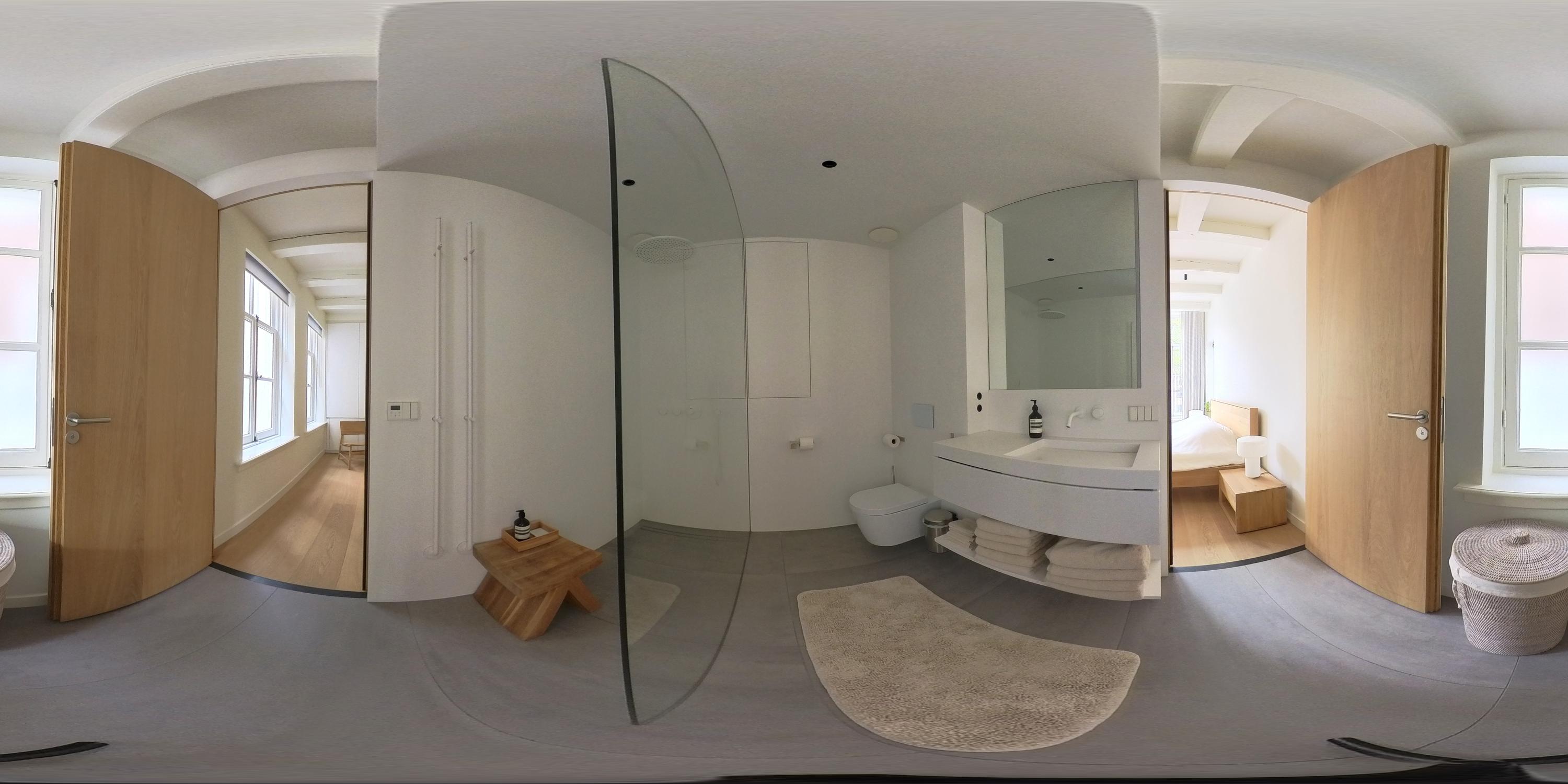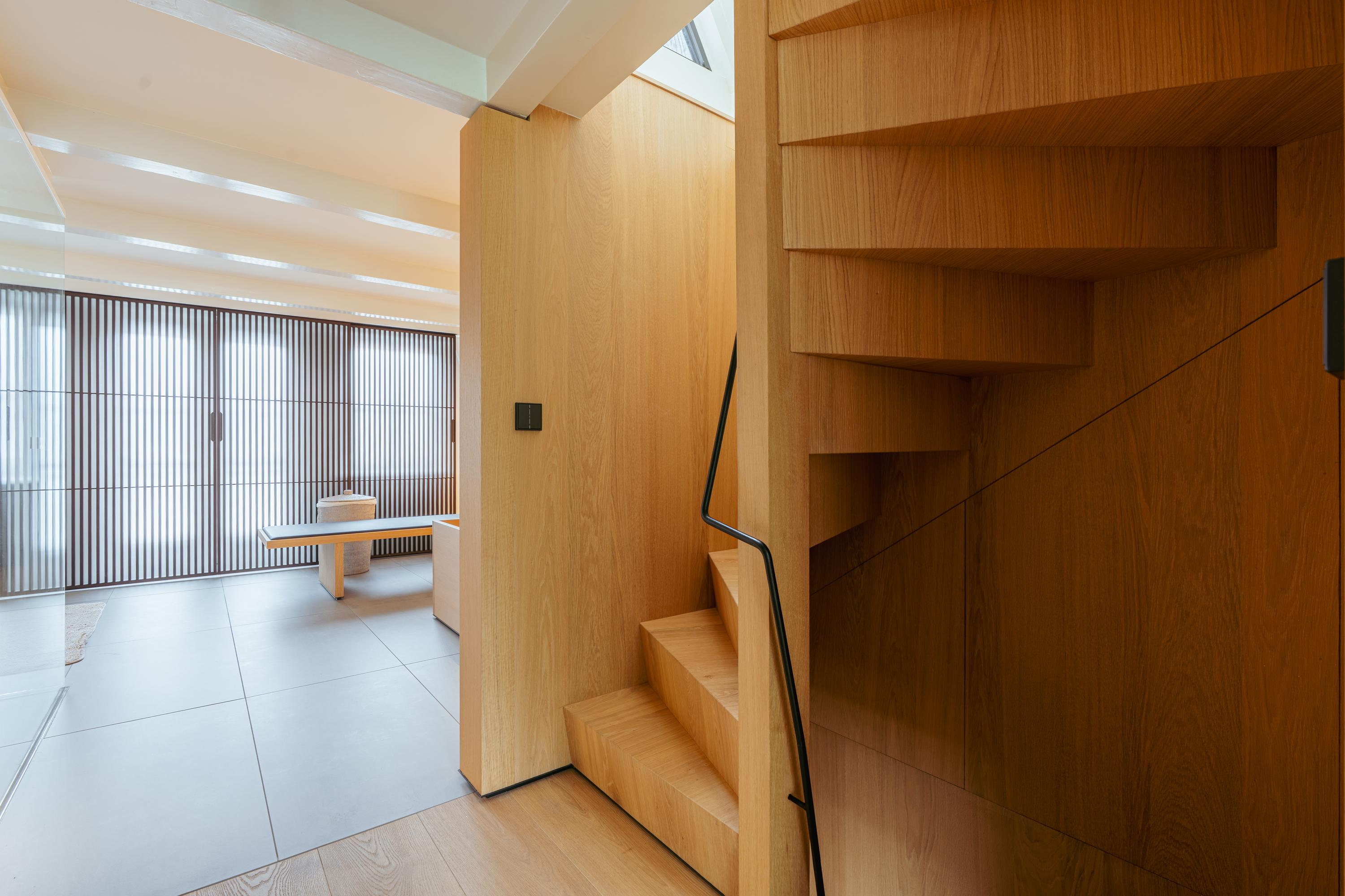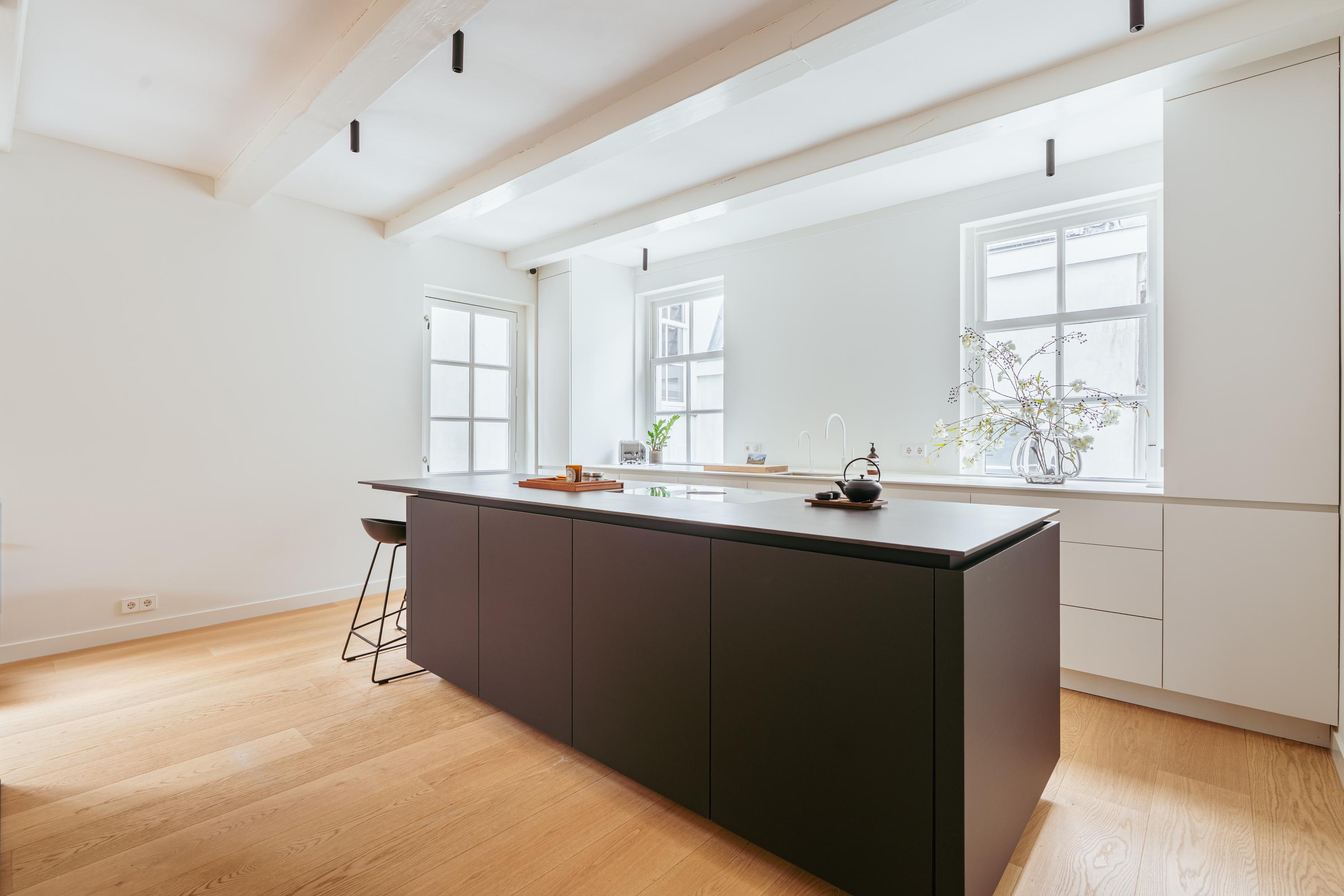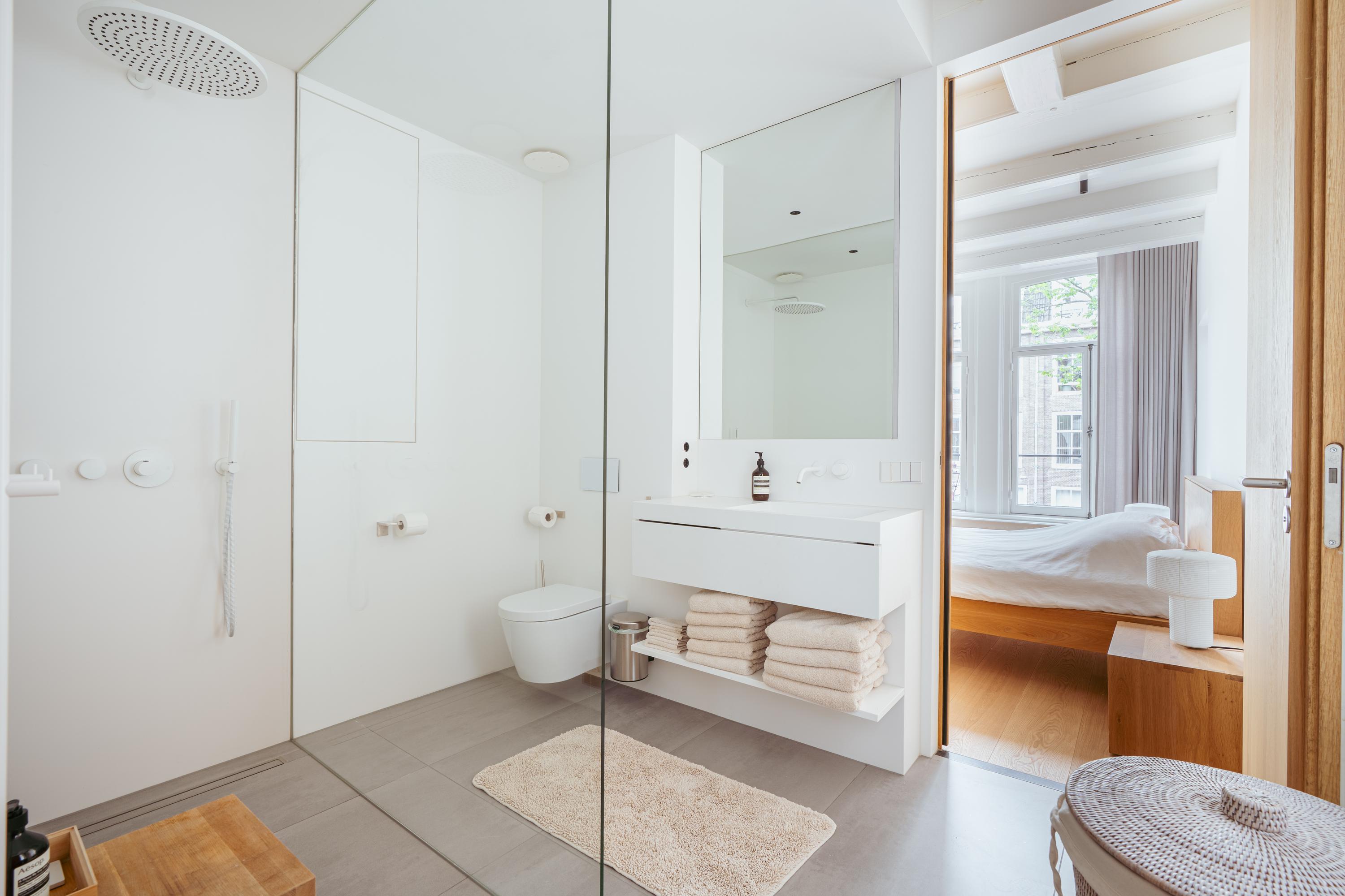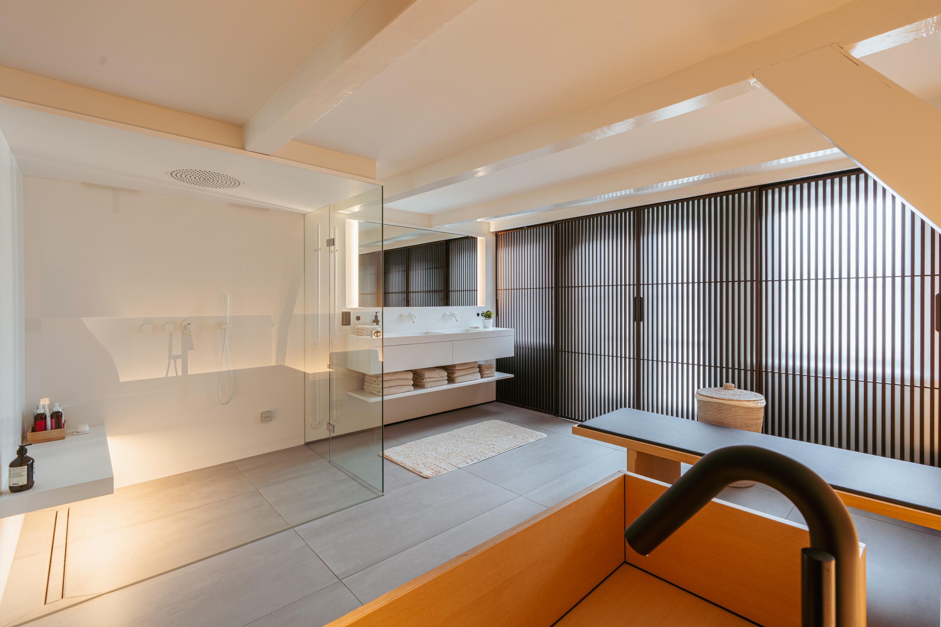 De bovenste verdieping van het pand is volledig ingericht als exclusieve master bedroom – een stijlvolle oase van rust, ruimte en comfort. Centraal op deze etage bevindt zich een ruime walk-in closet, voorzien van op maat gemaakte kasten die niet alleen praktisch zijn, maar ook bijdragen aan de serene uitstraling van de ruimte. Aan de voorzijde vindt u de sfeervolle slaapkamer, waar authentieke plafondbalken en een indrukwekkende nokhoogte direct in het oog springen. Hoge ramen tot in de nok zorgen voor een overvloed aan natuurlijk licht en versterken het gevoel van openheid en ruimte. Ook hier zorgen ingebouwde kastenwanden voor een strak en opgeruimd geheel. Aan de achterzijde ligt de luxueus uitgevoerde badkamer, een ware wellnessruimte in eigen huis. Hier treft u een elegant vrijstaand Agape Spoon Woodline ligbad als eye-catcher, een dubbele wastafel met stijlvol meubel, een bijzonder royale inloopdouche, stoomcabine én een ingebouwd ligbed voor ultieme ontspanning. De ruimte is afgewerkt met warme materialen en doordachte details, waaronder ingebouwde verlichting die een gevoel van hotel-luxe oproept. Prachtige houten schuifpanelen dienen zowel als zonwering als sfeervol designelement en zorgen voor privacy zonder het daglicht buiten te sluiten. Het toilet is separaat gesitueerd.