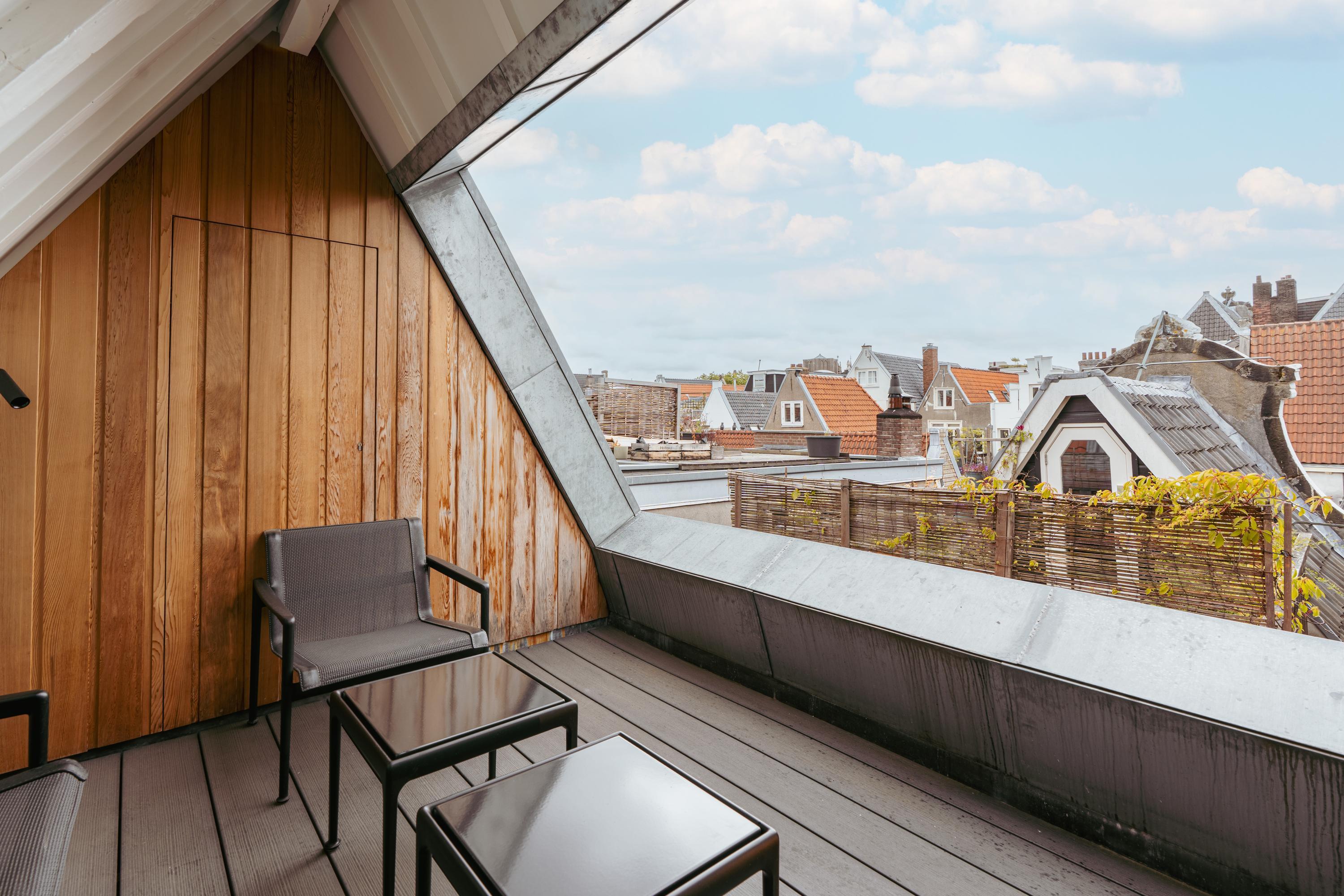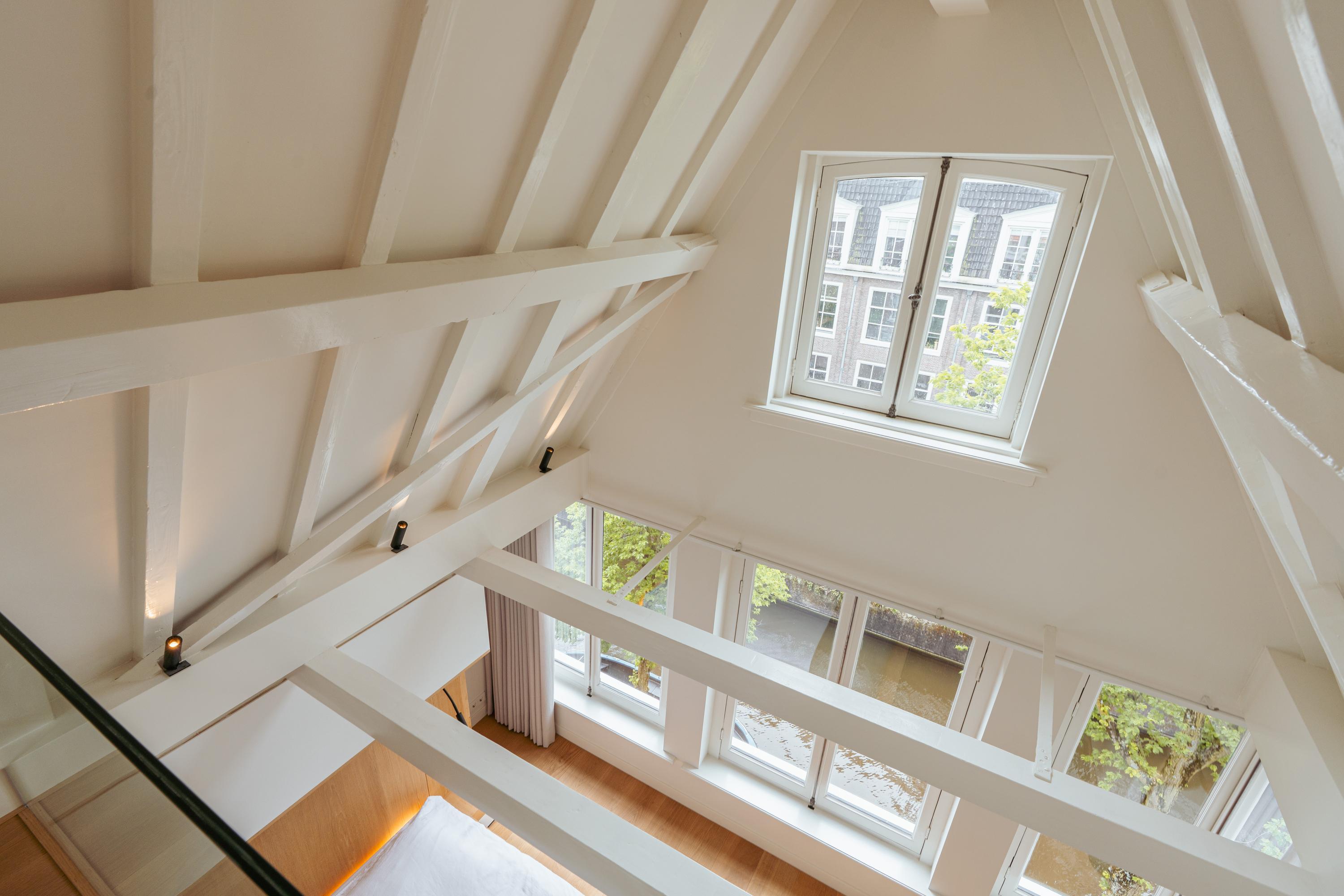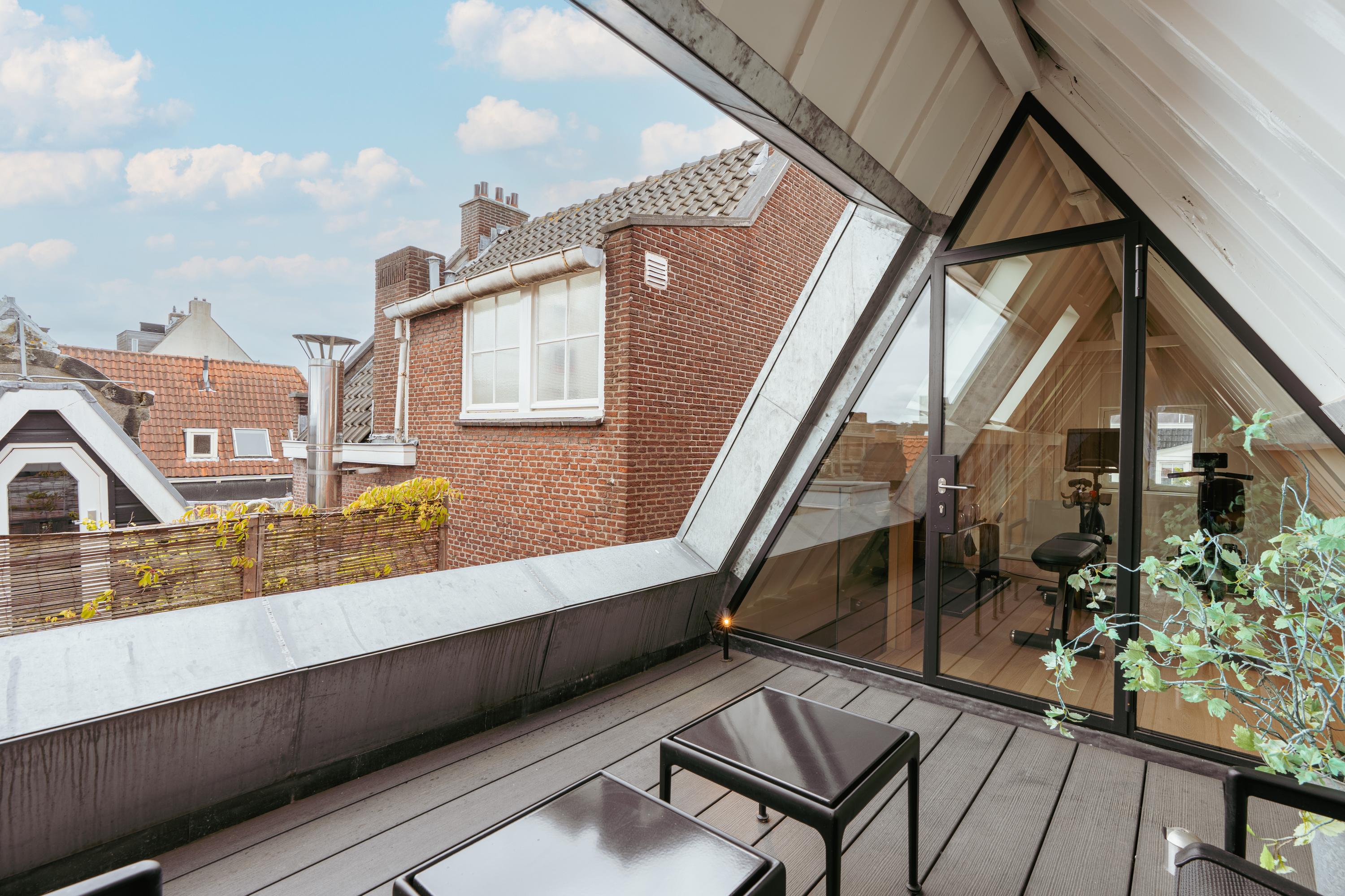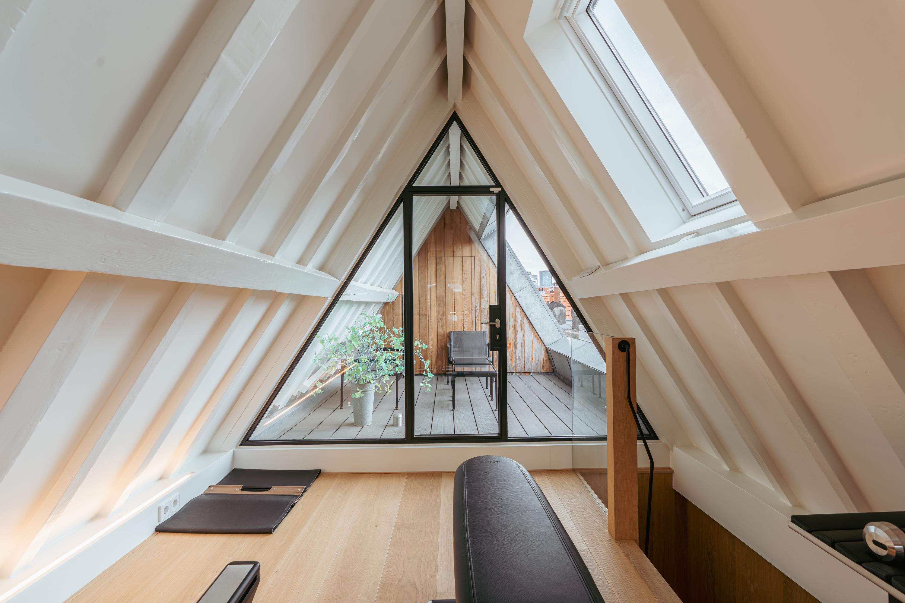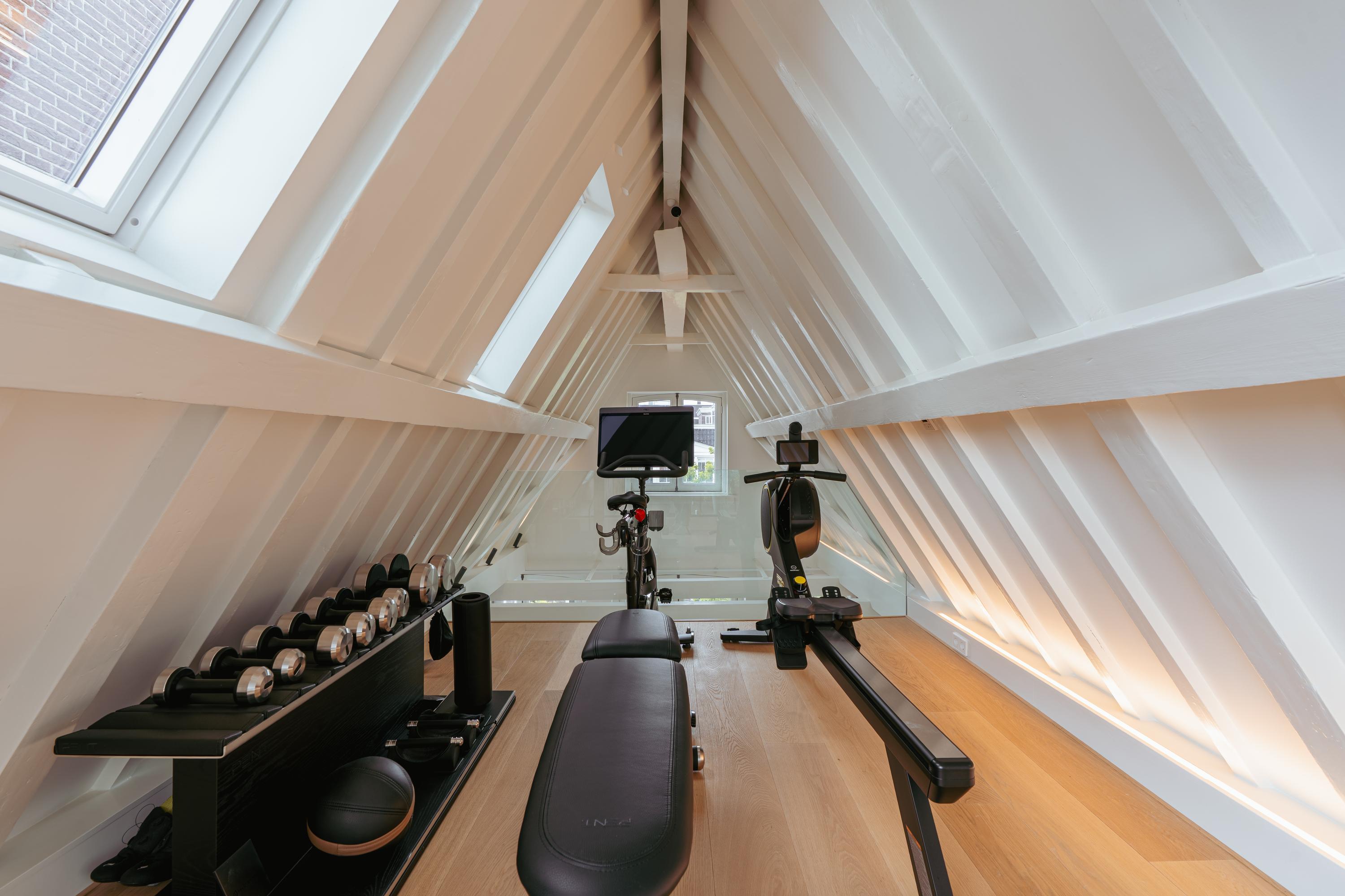 De vierde verdieping, gelegen in de nok van het pand, is momenteel in gebruik als gym. Dankzij de vide is er een directe verbinding met de master bedroom op de verdieping eronder, wat een prettig gevoel van openheid en ruimtelijkheid creëert. De kapconstructie met de schuine daklijnen geeft deze ruimte karakter, terwijl het royale plafond en de grote raampartijen zorgen voor een lichte en aangename sfeer. Dit is een multifunctionele ruimte die eenvoudig aan te passen is naar wens – denk aan een werkplek, hobbyruimte, extra slaapkamer of ontspanningsruimte. Aan de achterzijde bieden openslaande deuren toegang tot een rustig gelegen balkon. Hier geniet u van volledige privacy, een fraai uitzicht en de zon, een ideale plek voor een moment van rust in het hart van de stad.