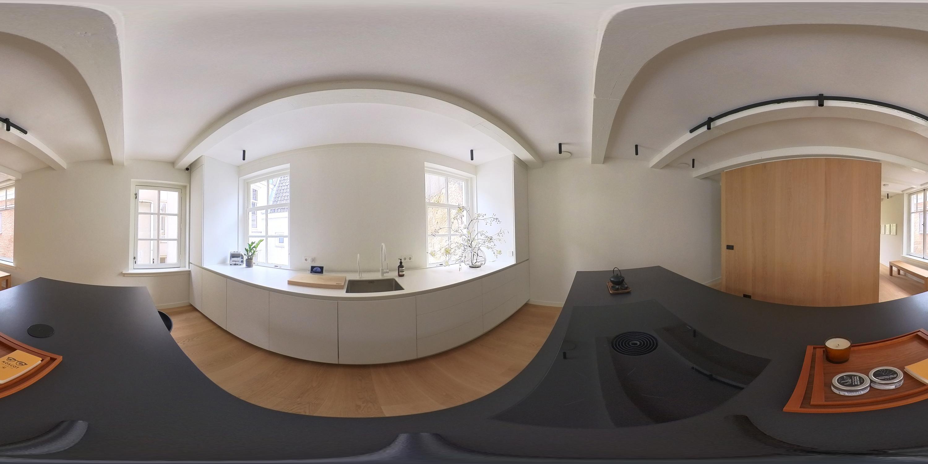 De tweede verdieping van het pand is volledig ingericht als royale leefruimte, met een prachtige balans tussen comfort, luxe en karakter. Aan de achterzijde bevindt zich de modern uitgevoerde woonkeuken, waar koken en samenkomen centraal staan. De keuken is uitgerust met hoogwaardige inbouwapparatuur: een koelkast, vriezer, combi-oven en magnetron, een spoelbak met Quooker-kraan en een strakke inductiekookplaat met geïntegreerd afzuigsysteem. De vele opbergmogelijkheden zorgen voor een opgeruimde, minimalistische uitstraling. Blikvanger is het centraal geplaatste kookeiland met een gezellig bargedeelte. Aan de voorzijde van de verdieping vindt u het zitgedeelte, waar de grote raampartijen zorgen voor een weids uitzicht over de gracht. De overvloed aan daglicht in combinatie met de warme houten vloer en de rustige afwerking creëren een aangename, uitnodigende sfeer. Via openslaande deuren bereikt u de hal waar zich een separaat toilet bevindt. Vanuit deze hal leidt een vaste trap naar de derde verdieping.