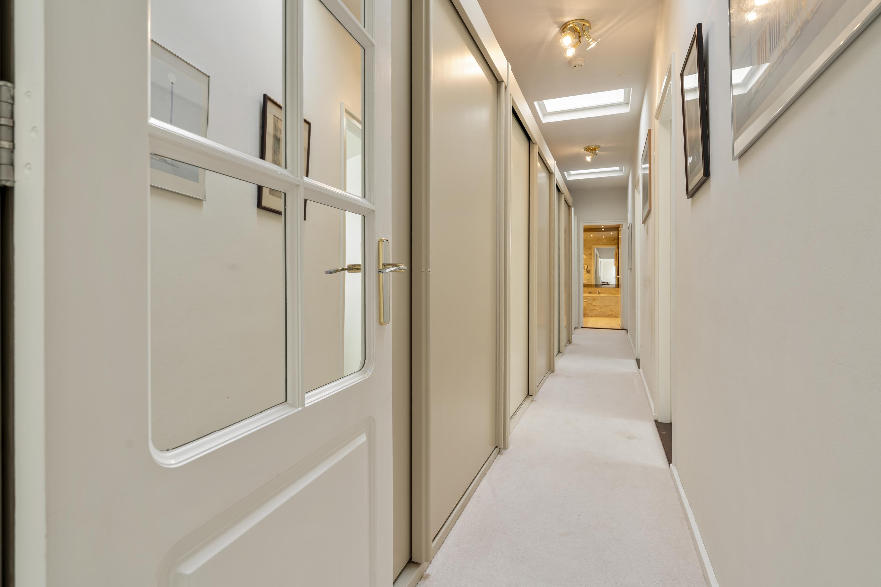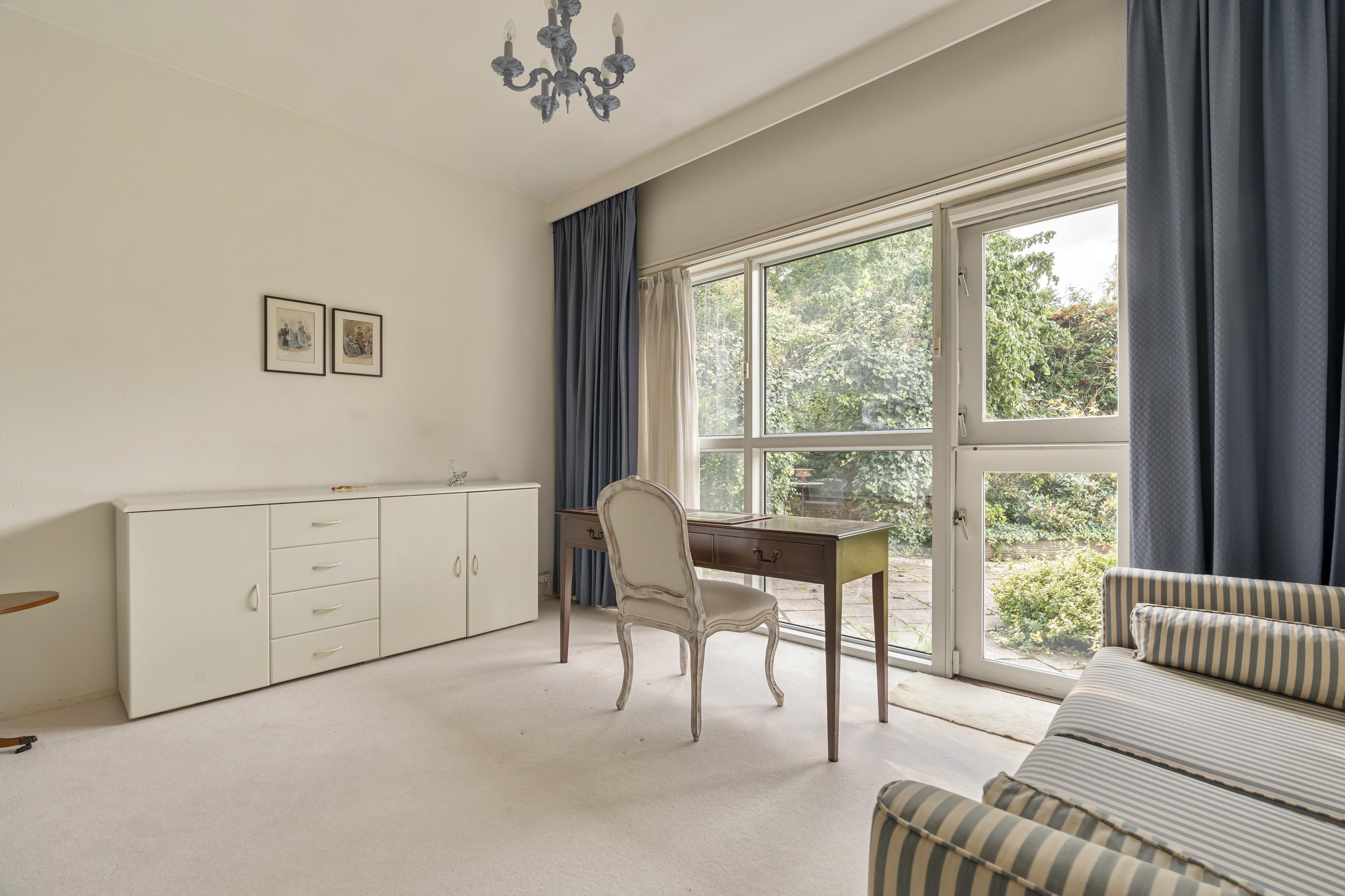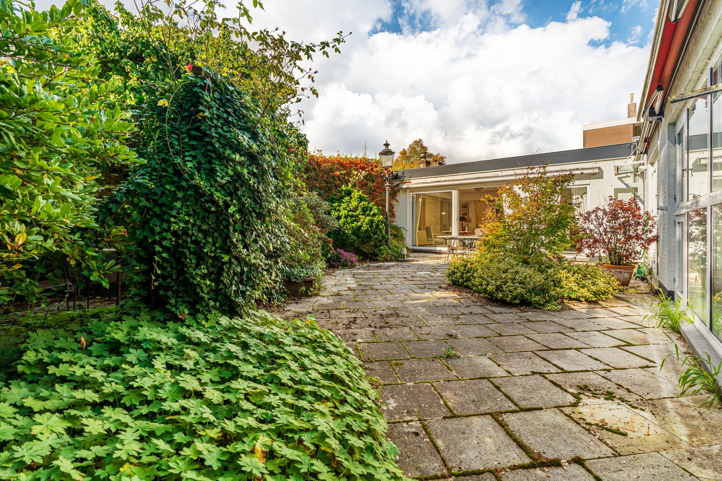 De woning wordt betreden via de groene voortuin. Bij binnenkomst biedt een kleine hal toegang tot de garage aan de voorzijde. Deze ruime garage, voorzien van een elektrische deur, biedt plaats aan twee auto's. De centraal gelegen hal — met een dakraam dat zorgt voor overvloedig daglicht — verbindt alle vertrekken van de woning. De woonkamer vormt het hart van het huis en is voorzien van grote raampartijen en schuifdeuren naar de royale, op het zuiden gelegen tuin van circa 116 m². Hier geniet u van veel zonlicht en privacy. De woonkamer beschikt bovendien over een airco-installatie. De keuken is uitgerust met luxe inbouwapparatuur, waaronder een 4-pits inductiekookplaat met geïntegreerde afzuiging, oven, vaatwasser en een koel-vriescombinatie. Via de langgerekte hal bereikt u de overige vertrekken. Hier bevinden zich drie goed bemeten slaapkamers, die elk directe toegang bieden tot de achtertuin. De master bedroom, gelegen aan het einde van de hal, beschikt eveneens over een airco-installatie. Aangrenzend bevindt zich de badkamer, voorzien van een dubbele wastafel met meubel, toilet en ligbad. Langs de gehele hal zijn praktische ingebouwde kasten geplaatst. Tot slot leidt een trap vanuit de hal naar het souterrain, dat door de huidige bewoners wordt gebruikt als extra woonkamer, compleet met een ingebouwde bar — een ideale ruimte voor ontspanning of vermaak.