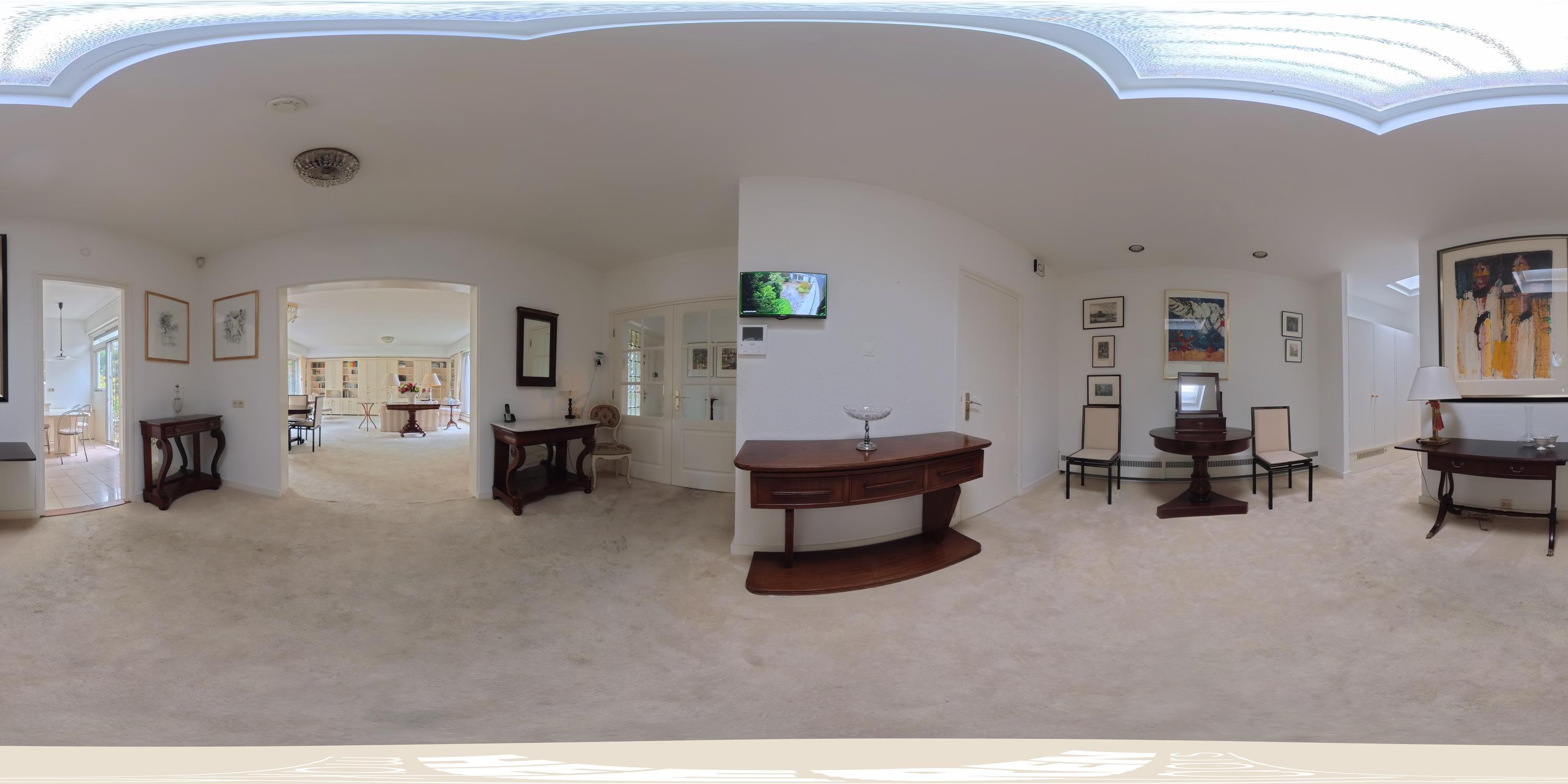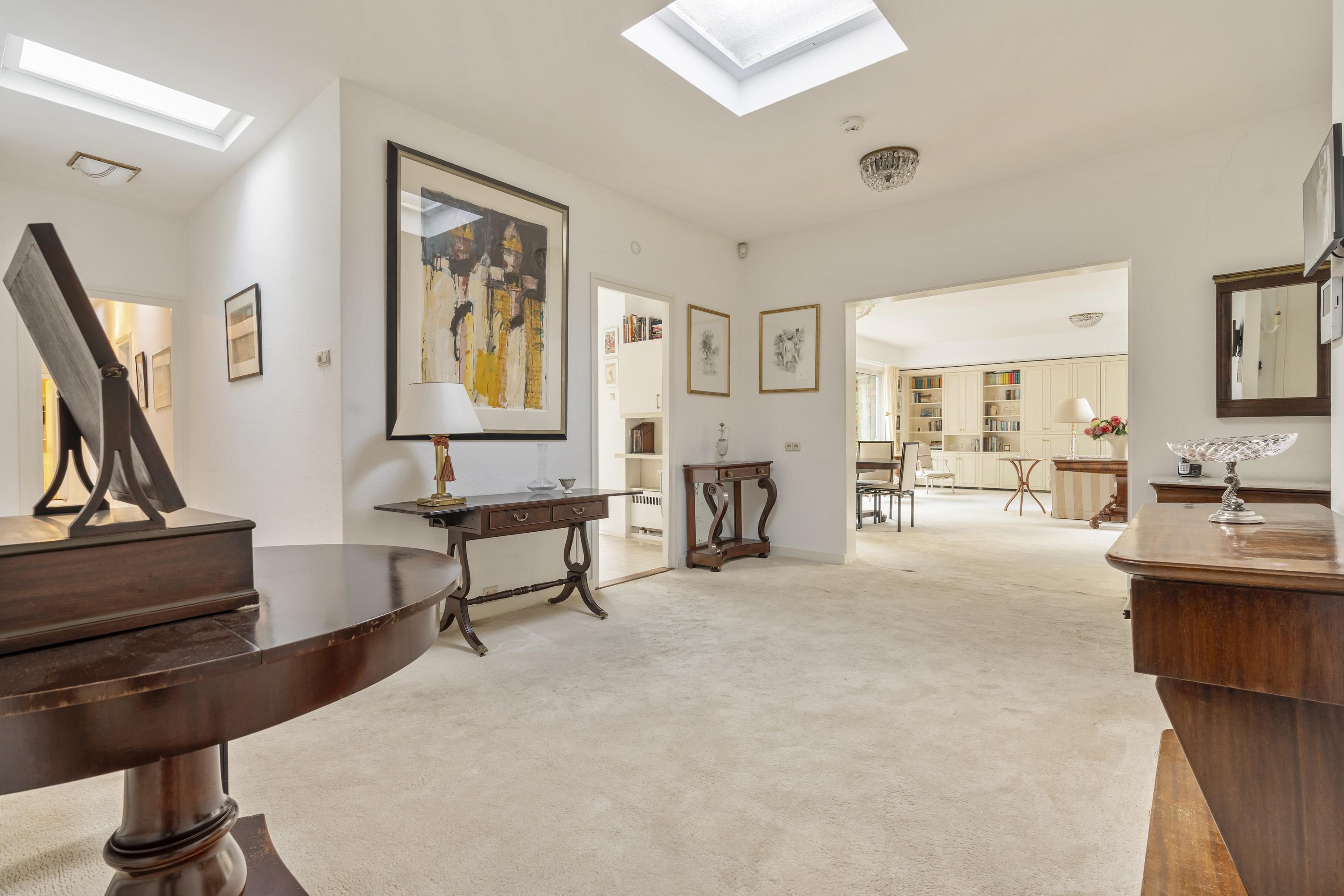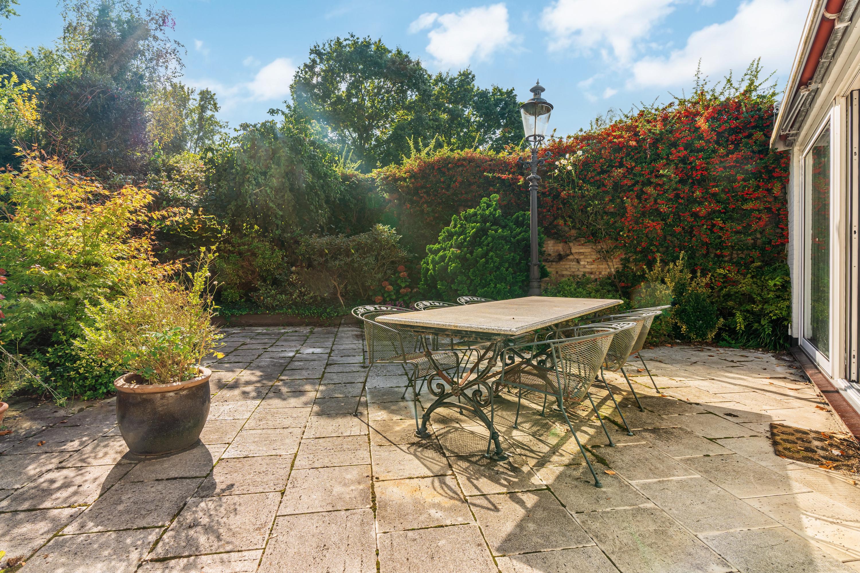 De woning wordt betreden via de groene voortuin. Bij binnenkomst biedt een kleine hal toegang tot de garage aan de voorzijde. Deze ruime garage, voorzien van een elektrische deur, biedt plaats aan twee auto's. De centraal gelegen hal — met een dakraam dat zorgt voor overvloedig daglicht — verbindt alle vertrekken van de woning. De woonkamer vormt het hart van het huis en is voorzien van grote raampartijen en schuifdeuren naar de royale, op het zuiden gelegen tuin van circa 116 m². Hier geniet u van veel zonlicht en privacy. De woonkamer beschikt bovendien over een airco-installatie. De keuken is uitgerust met luxe inbouwapparatuur, waaronder een 4-pits inductiekookplaat met geïntegreerde afzuiging, oven, vaatwasser en een koel-vriescombinatie. Via de langgerekte hal bereikt u de overige vertrekken. Hier bevinden zich drie goed bemeten slaapkamers, die elk directe toegang bieden tot de achtertuin. De master bedroom, gelegen aan het einde van de hal, beschikt eveneens over een airco-installatie. Aangrenzend bevindt zich de badkamer, voorzien van een dubbele wastafel met meubel, toilet en ligbad. Langs de gehele hal zijn praktische ingebouwde kasten geplaatst. Tot slot leidt een trap vanuit de hal naar het souterrain, dat door de huidige bewoners wordt gebruikt als extra woonkamer, compleet met een ingebouwde bar — een ideale ruimte voor ontspanning of vermaak.