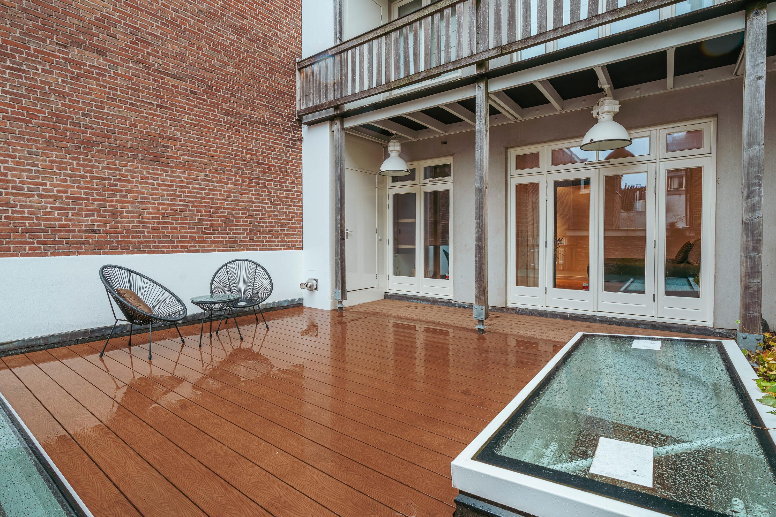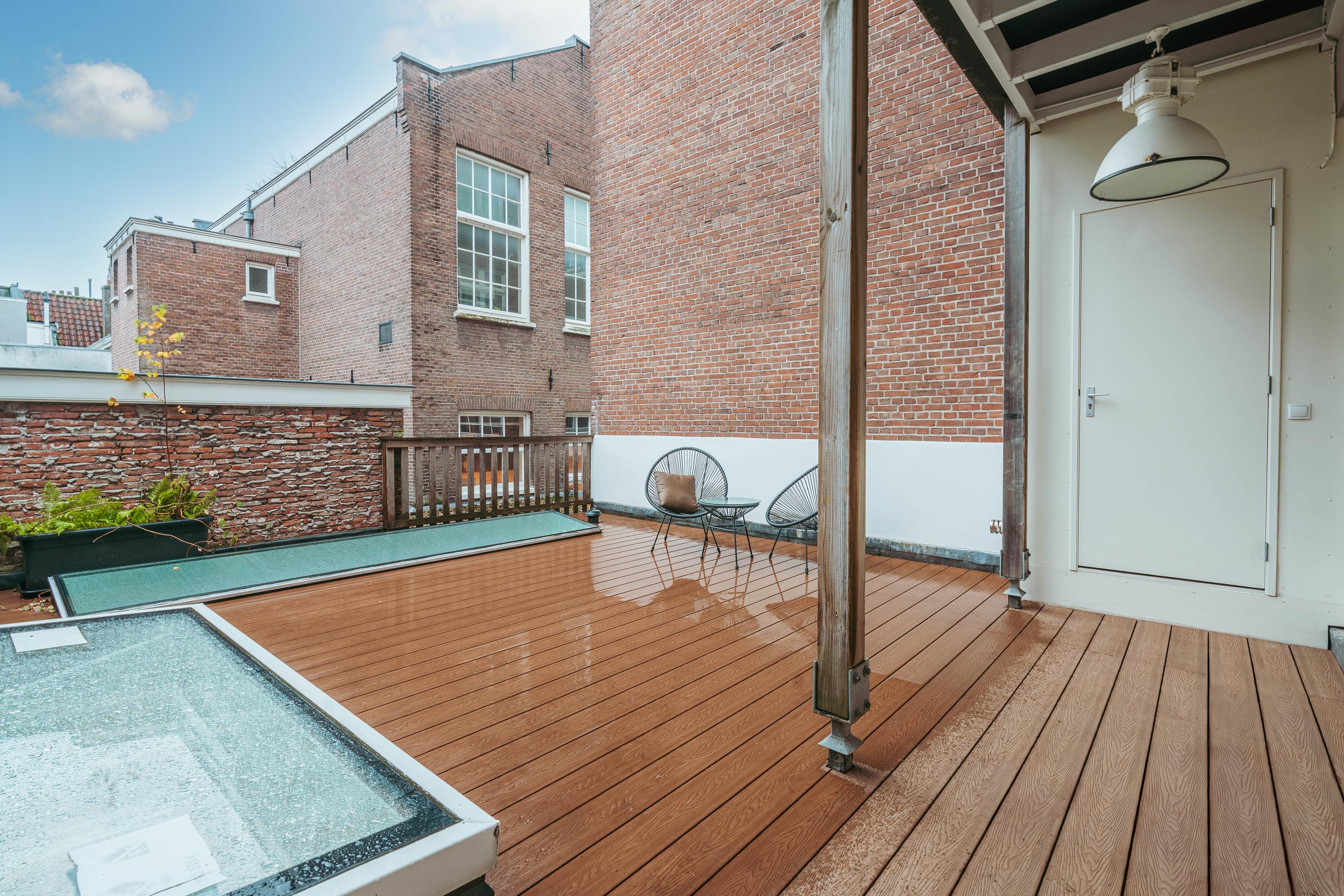 Het heerlijke dakterras van circa 37 m² vormt een uniek onderdeel van deze woning. Het is bereikbaar zowel via de achterste slaapkamer als via de trap in de leefkeuken. De rustige ligging maakt dit tot een geweldige buitenruimte midden in de stad, een plek waar u in alle privacy kunt genieten van de rust.