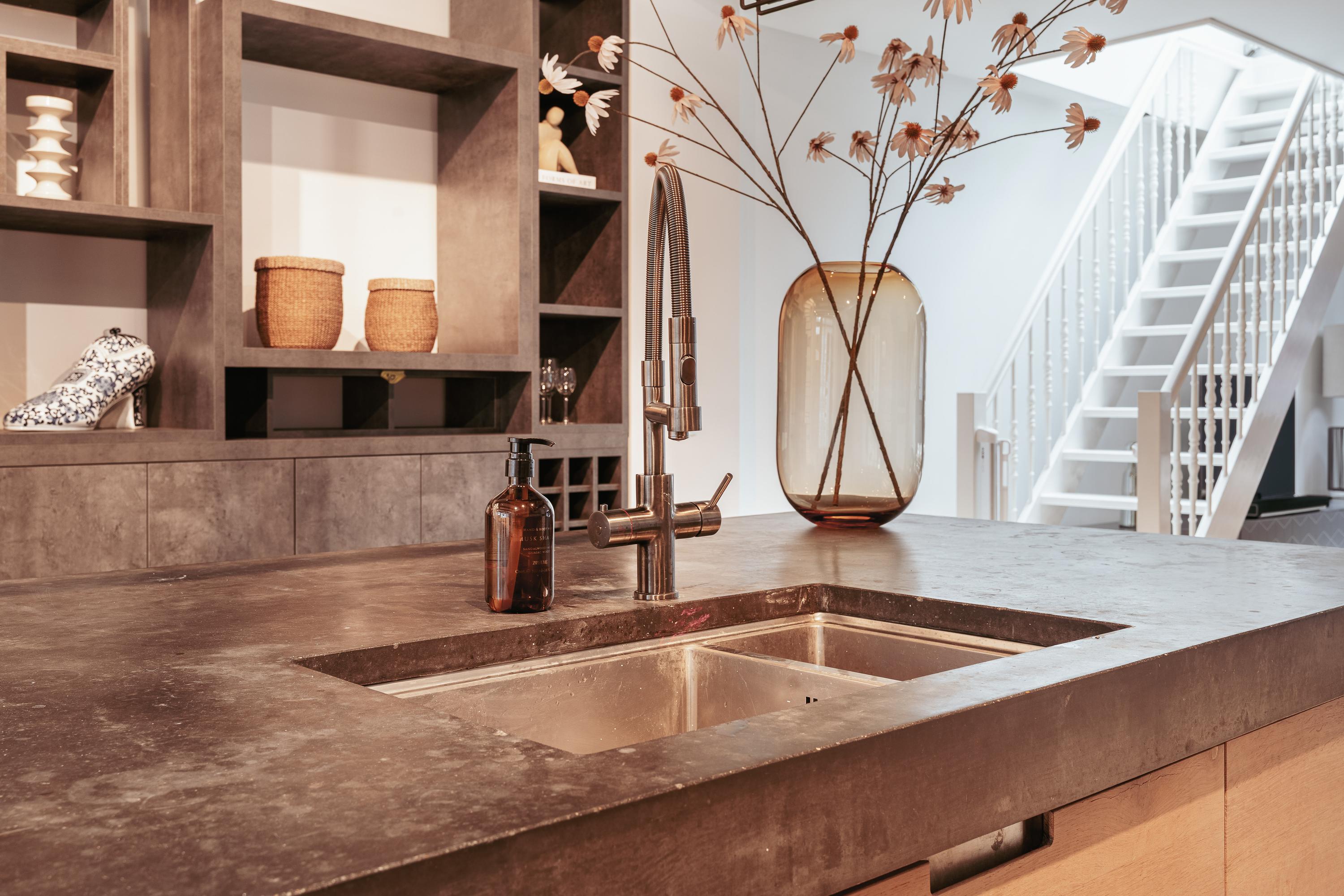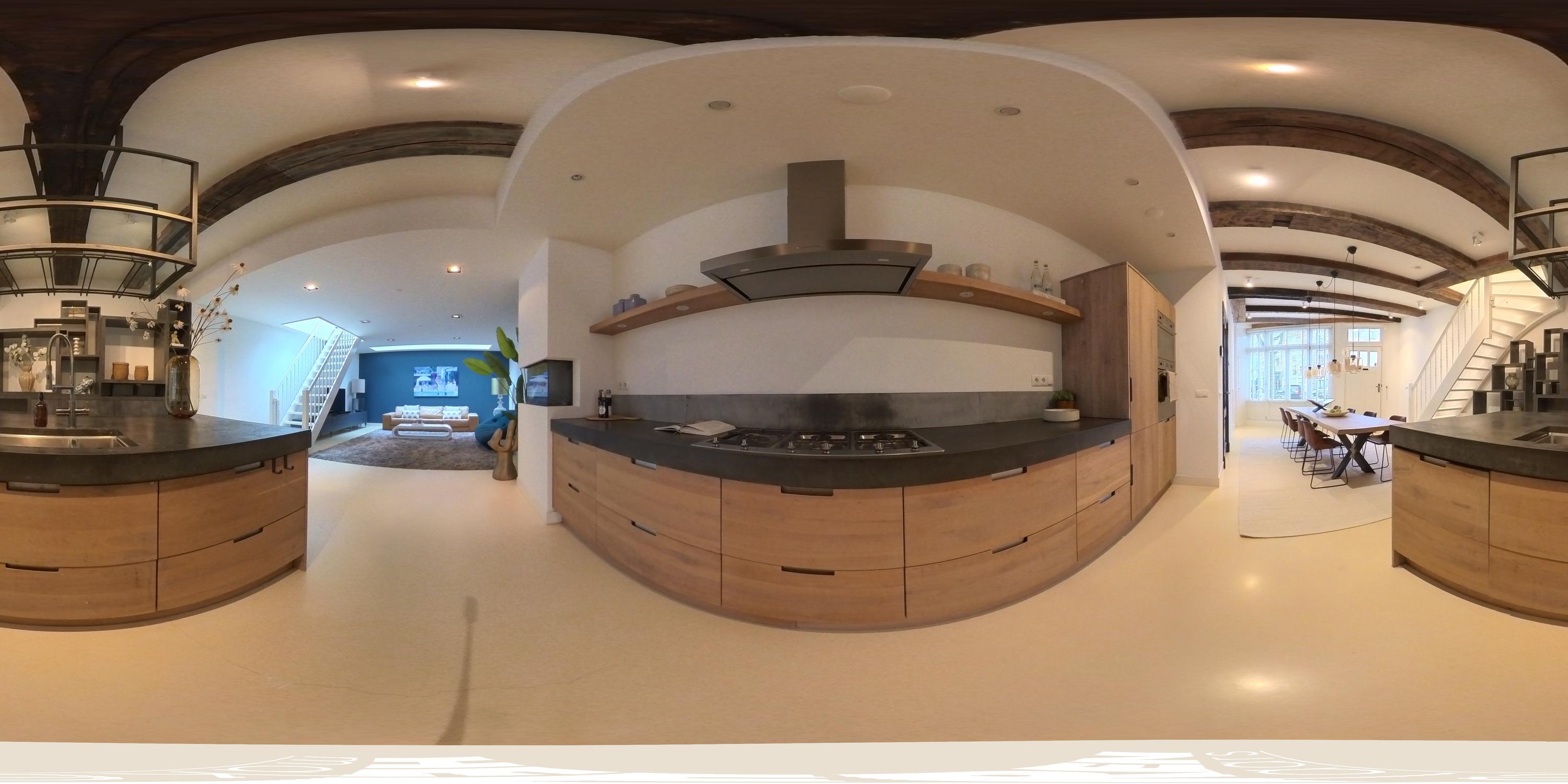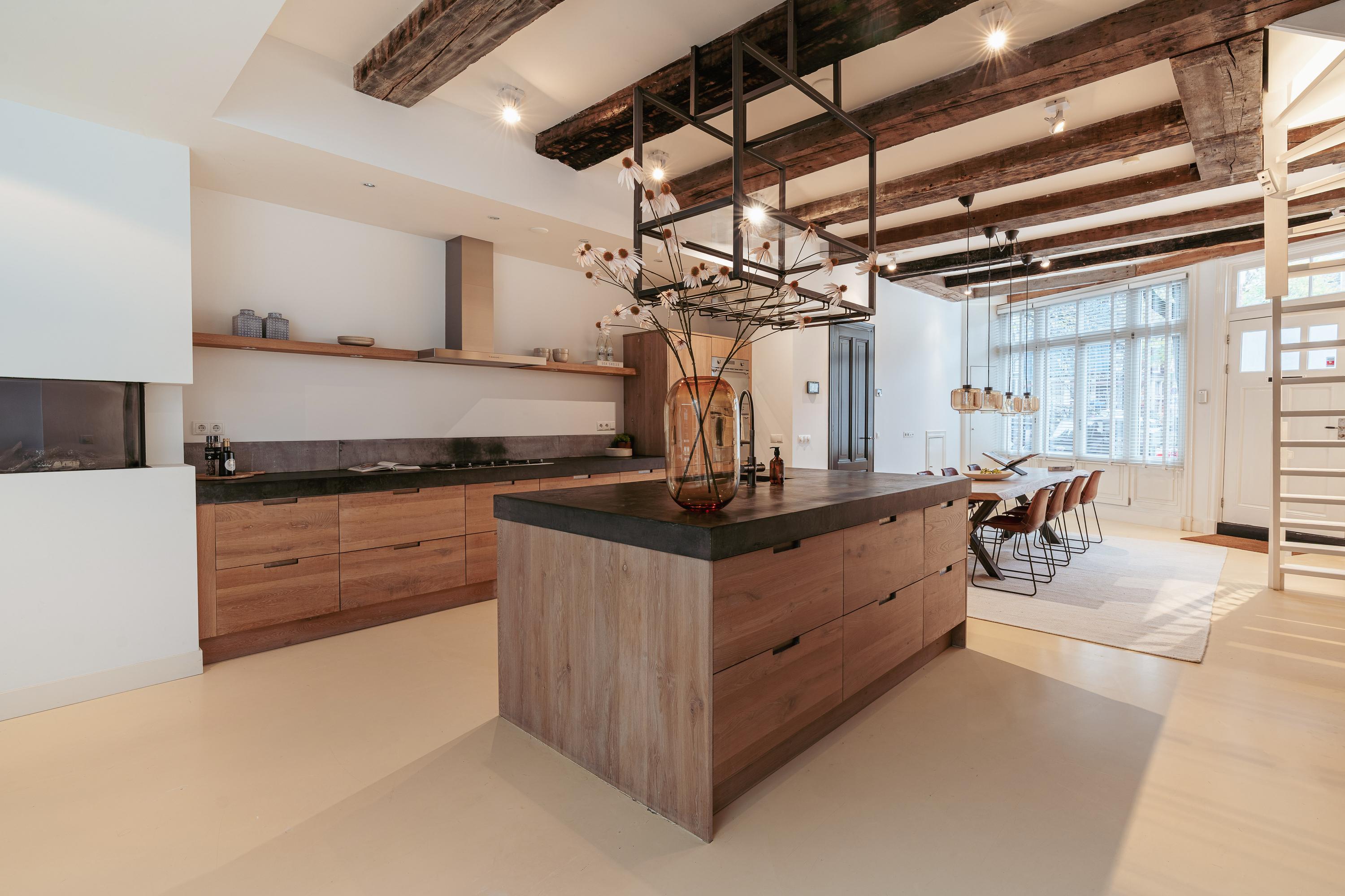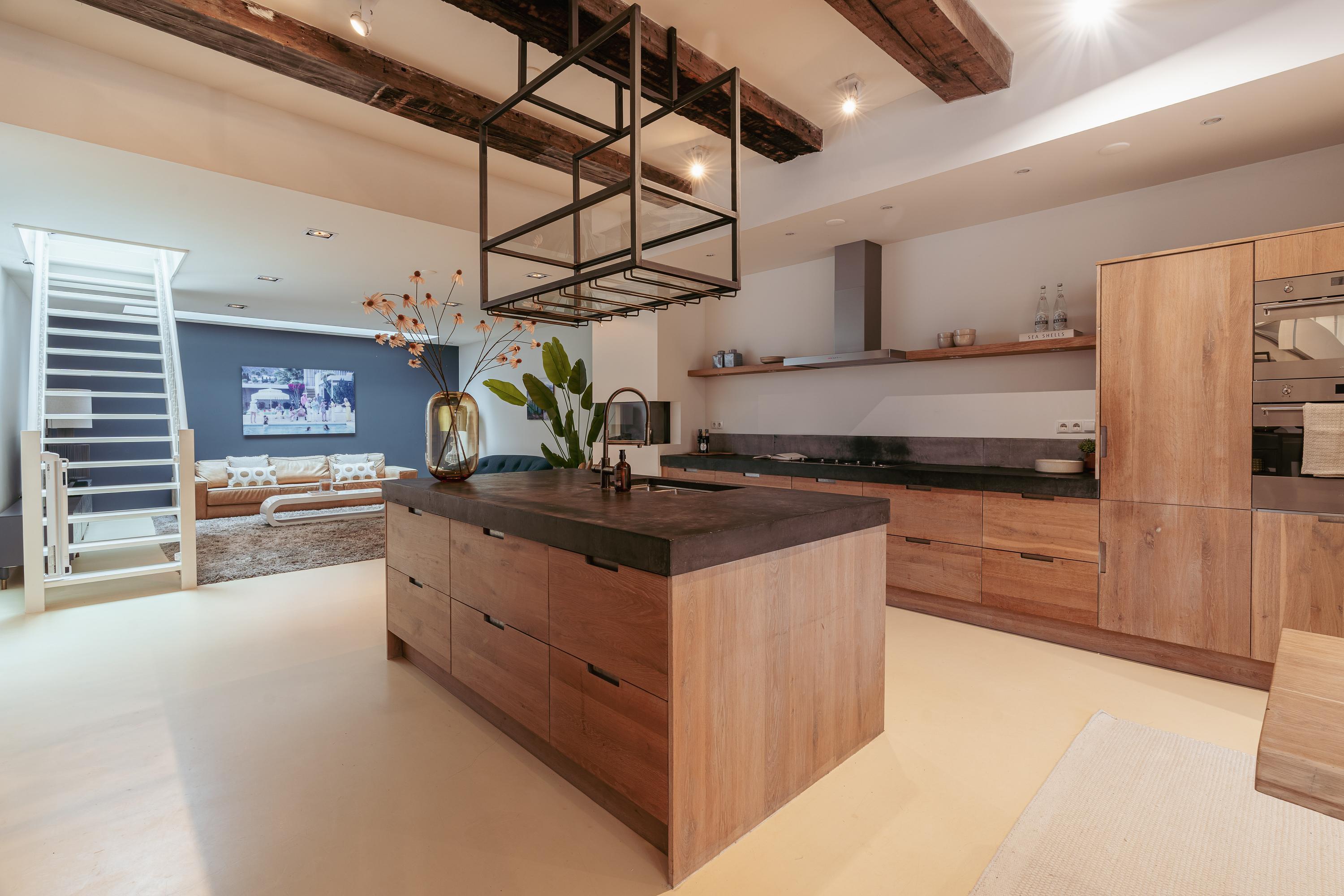 Centraal op deze verdieping ligt de royale woonkeuken van ca. 39 m², uitgevoerd met een groot kookeiland en luxe inbouwapparatuur zoals vaatwasser, 5 pits gasfornuis, koel-vriescombinatie, magnetron en oven. De combinatie van warm hout, een stenen werkblad en een strak design geeft de keuken een hoogwaardige en uitnodigende uitstraling. Het kookeiland biedt volop werkruimte en de op maat gemaakte kastenwand biedt veel bergruimte. Aan de voorzijde is ruim plaats voor een grote eettafel: ideaal voor gezellige diners, borrels en lange avonden aan tafel.