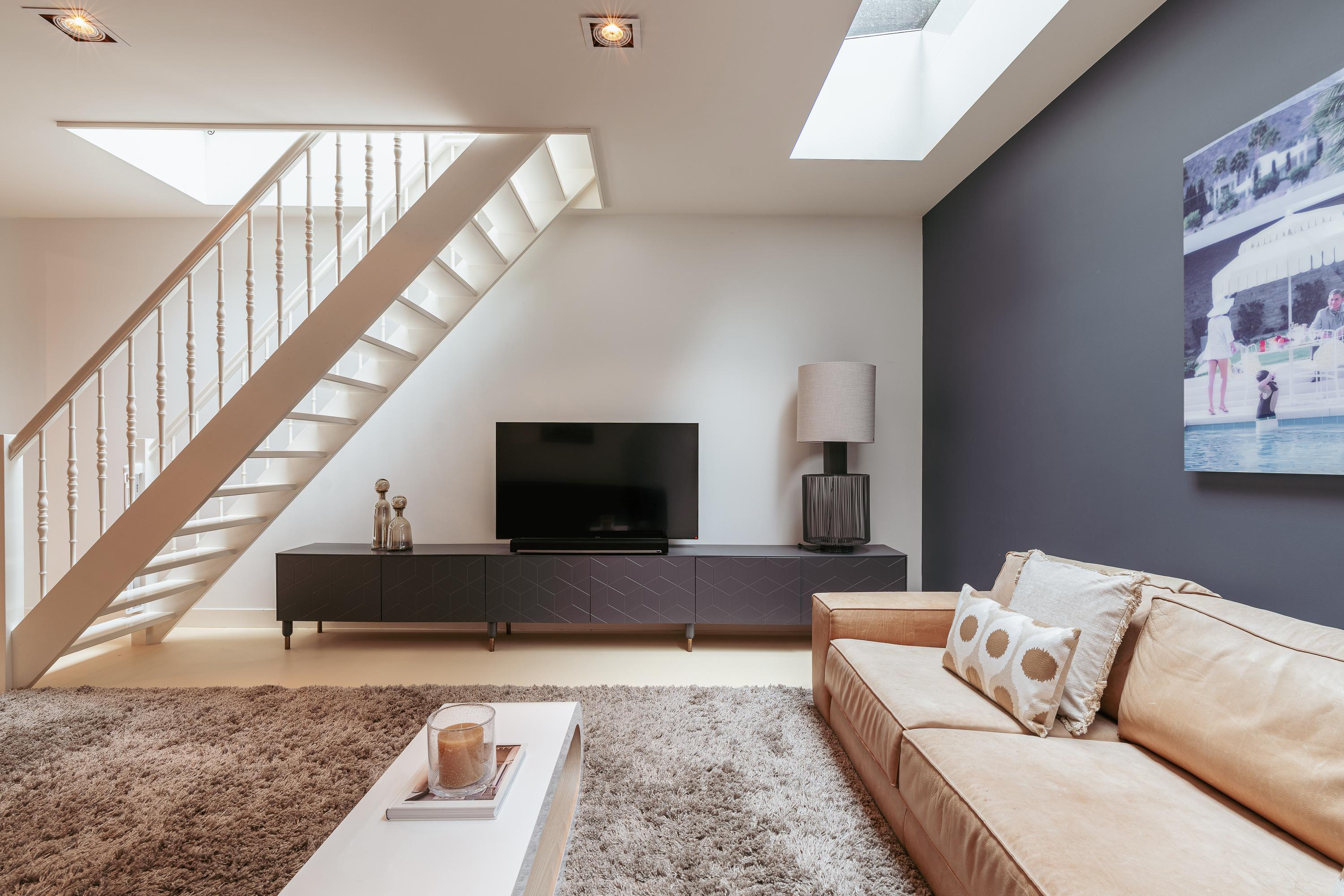 Aansluitend aan de keuken bevindt zich de sfeervolle woonkamer, gelegen aan de achterzijde van de woning. Het dakraam zorgt voor veel lichtinval en maakt dat de ruimte, ondanks de diepere ligging, nog altijd open en luchtig aanvoelt. De woonkamer is voorzien van een haard en biedt voldoende plek voor een royale zithoek.